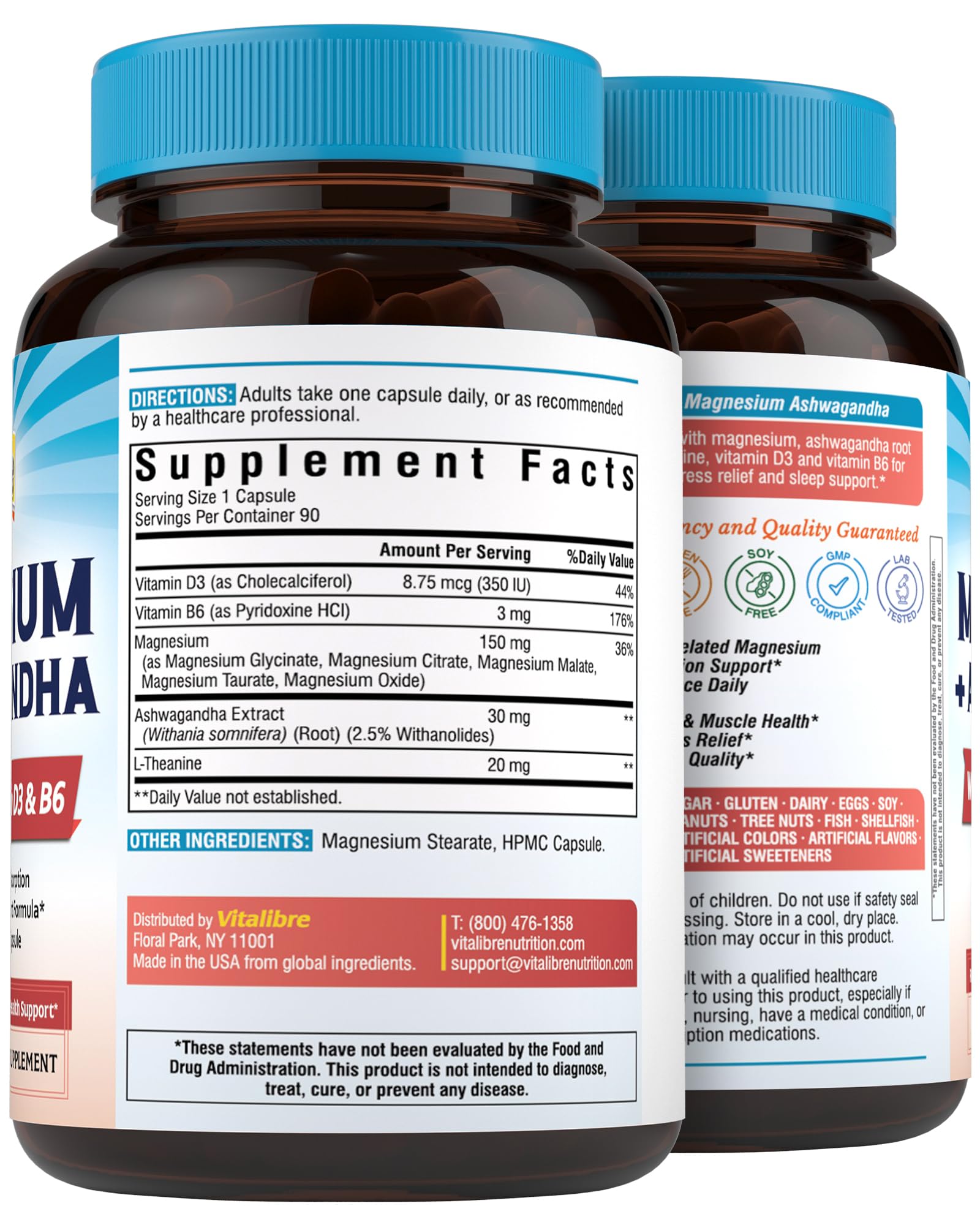 9-in-1 Stress Support*: Much annoying turning and tossing at night? Under high pressure? Or going to have big challenges? Vitalibre Magnesium Complex + Ashwagandha, L-Theanine, Vitamin D3 & B6 provides a holistic solution for you! This 9-in-1 Stress Support helps maintain healthy nerve function and relaxation and helps your body adapt to daily stress and support emotional balance.