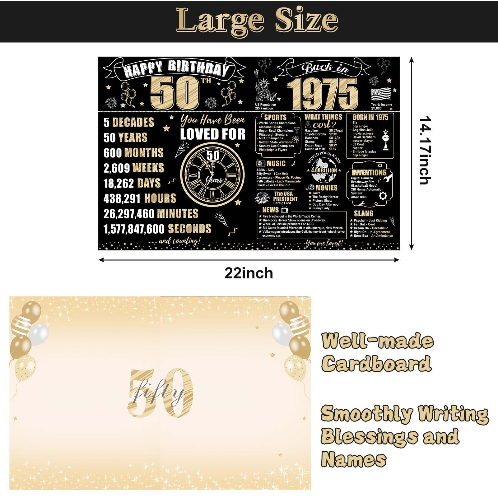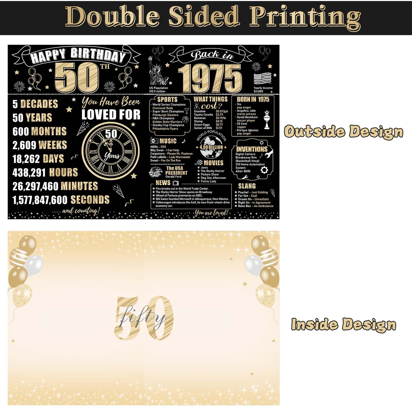 【Vintage 1975 50th birthday themed design】The double-sided design incorporates black and gold tones, featuring birthday elements like balloons and fireworks, commemorating significant events from 1975. It is both interesting and meaningful