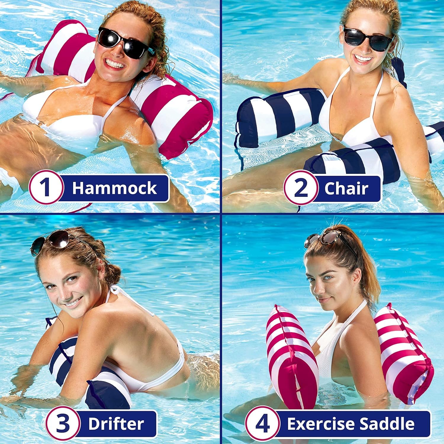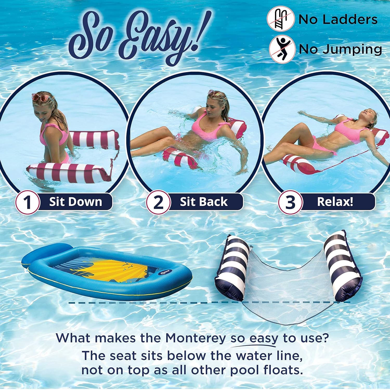 The Monterey boasts a 4-in-1 inflatable float system: hammock, lounge chair, exercise saddle, and Drifter. The Multi-purpose lounge quickly converts for relaxation, socializing, and even exercise in the pool. Lounge features comfortable cool weave fabric and folds easily for portability. Easily inflate and deflate with duo lock inflation system. The Monterey inflatable float system is a great addition to the summer pool this season and delivers fun so you can socialize, relax and even exercise. -Versatile: Monterey 4-in-1 Hammock offers 4 unique positions! Hammock, lounge chair, drifter and exercise saddle. Great for free-motion water (aerobics) exercise. -Recline-Relax-Dream: Supportive mesh lining keeps you cool as you relax on the water’s surface