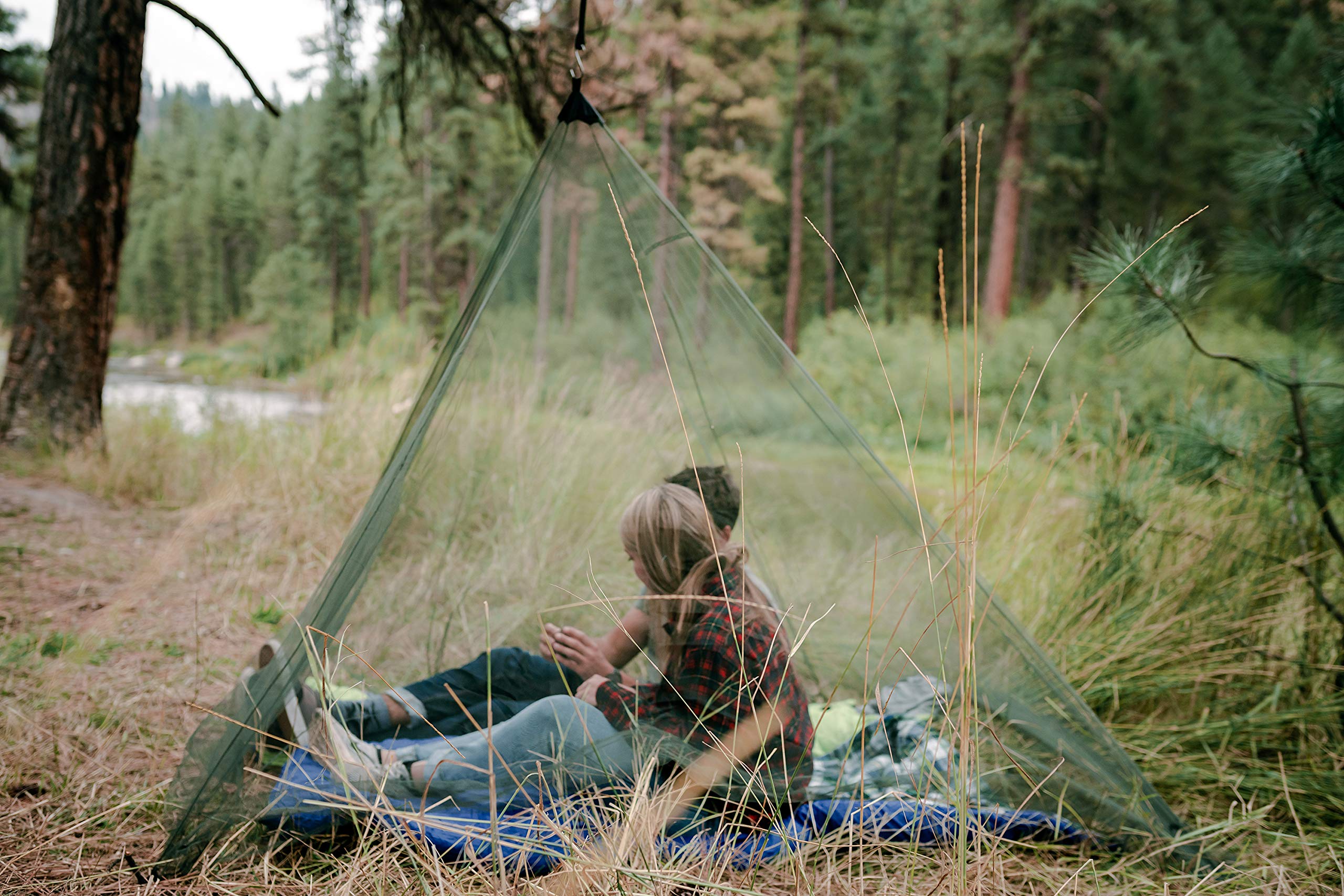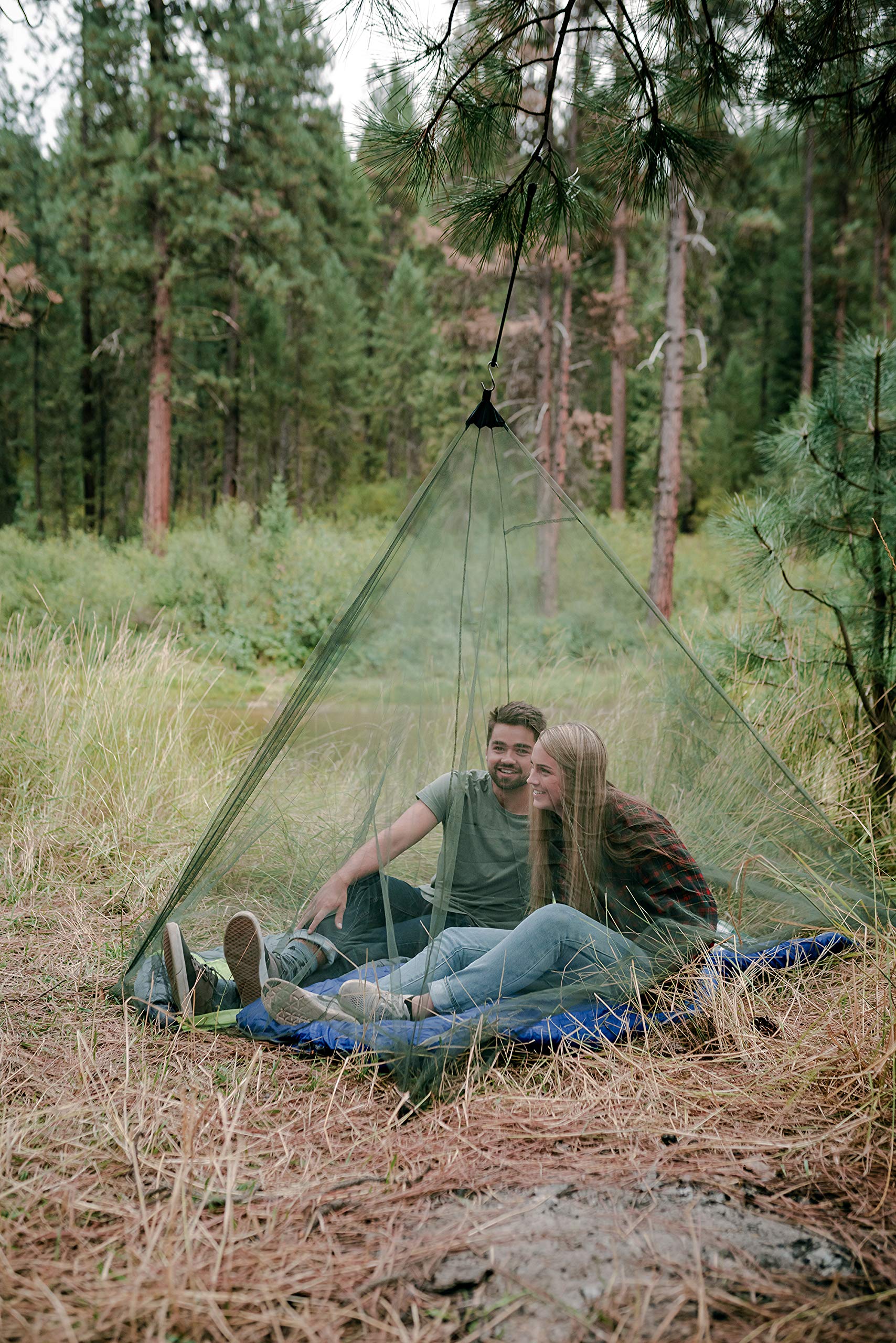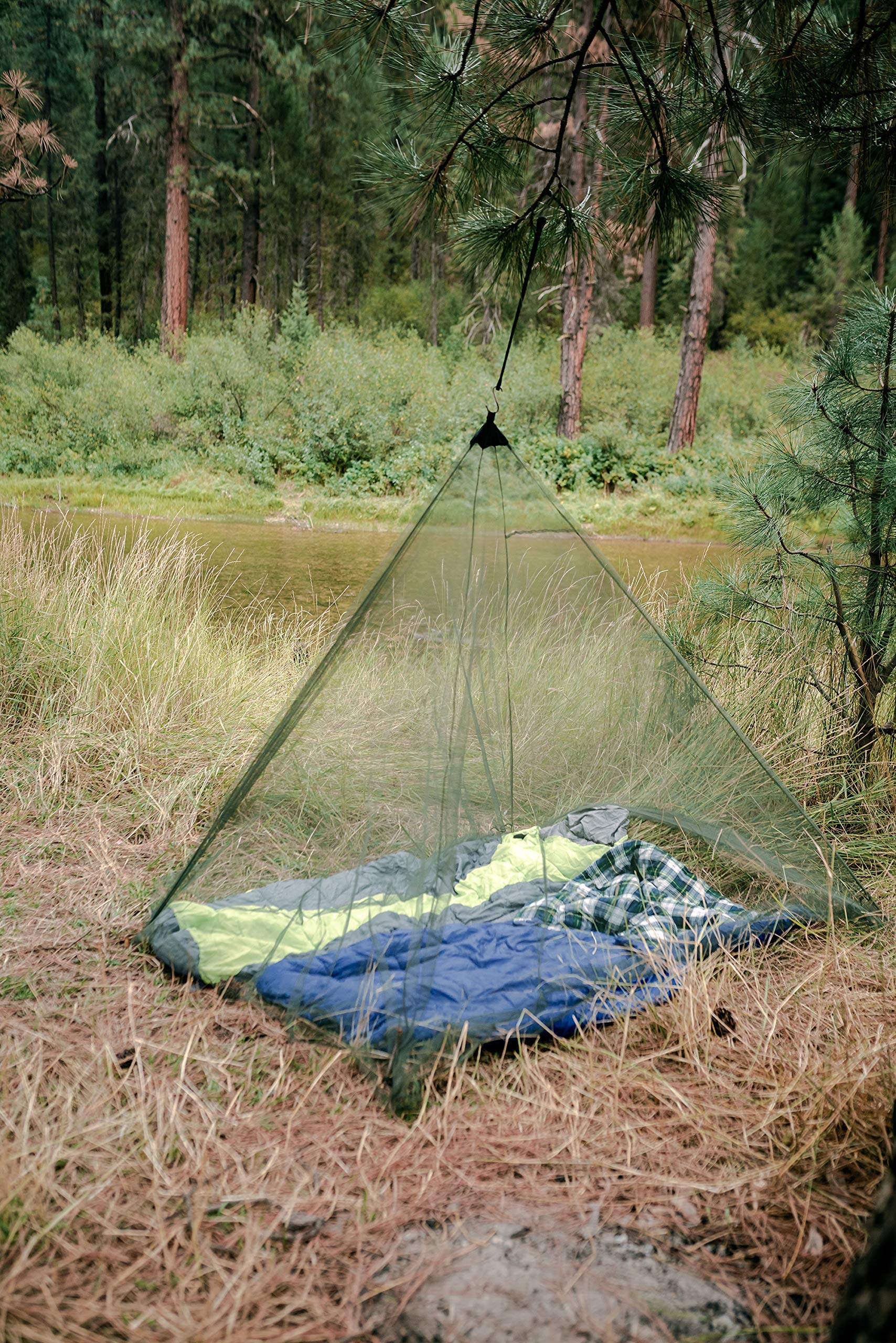 Protects user from West Nile Virus-carrying mosquitos, Made of durable polyethylene material, No-see-um-sized netting keeps out even the smallest biting creatures, Completely covers sleeping bag & cot; Top ring can be easily hung from any tree branch