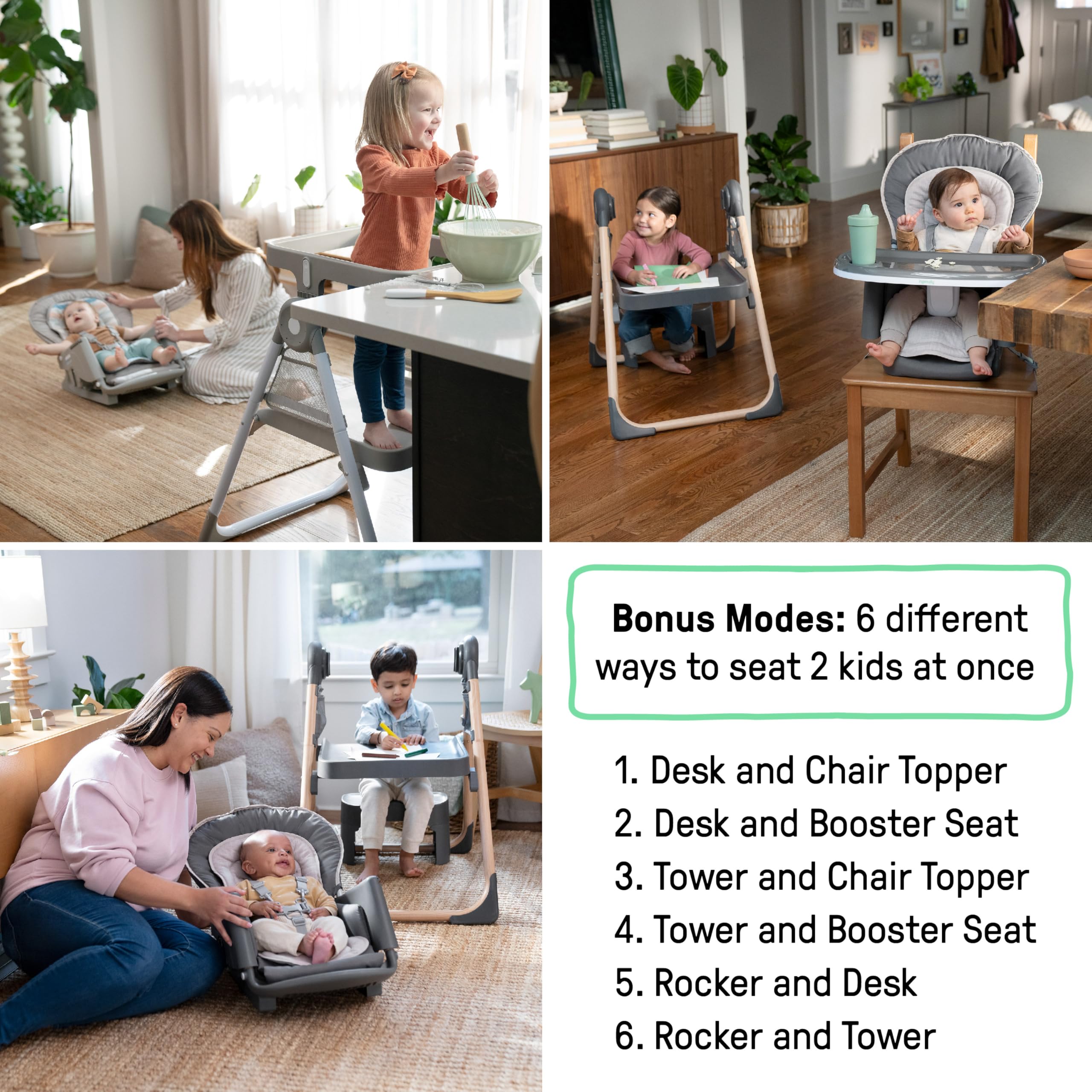 6 bonus uses when seating 2 kids at once utilizing the rocker, art table, stepstool, booster seat, and chair topper modes; 3-position high chair tray with built-in cupholder; 5-point safety harness