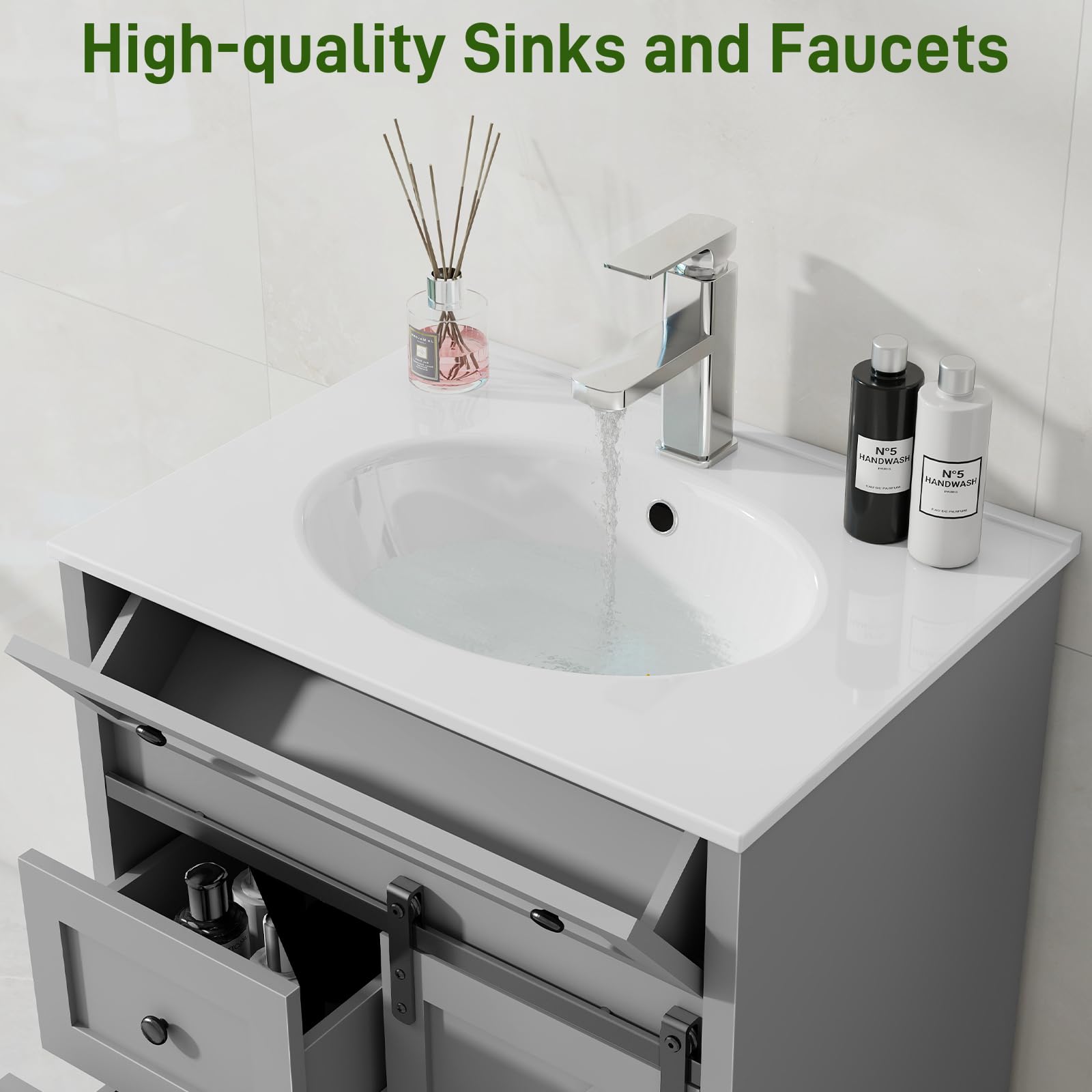 【High-quality Ceramic Sink and Premium Faucet】: This bathroom vanity boasts a ceramic sink of superior quality, providing exceptional resistance to stains and ensuring long-term durability. The accompanying faucet and piping are meticulously designed for optimal functionality and user convenience, guaranteeing a dependable and enduring performance.