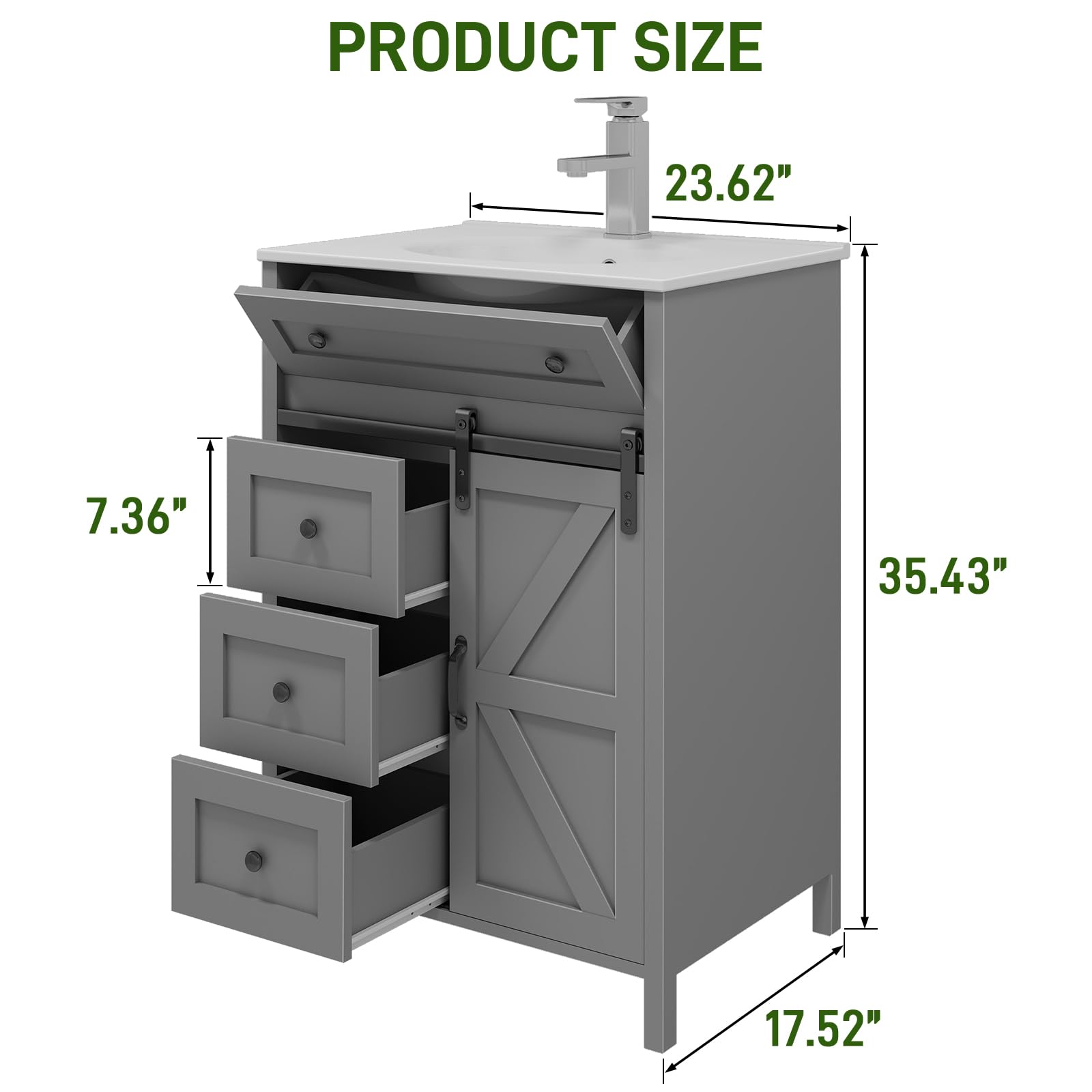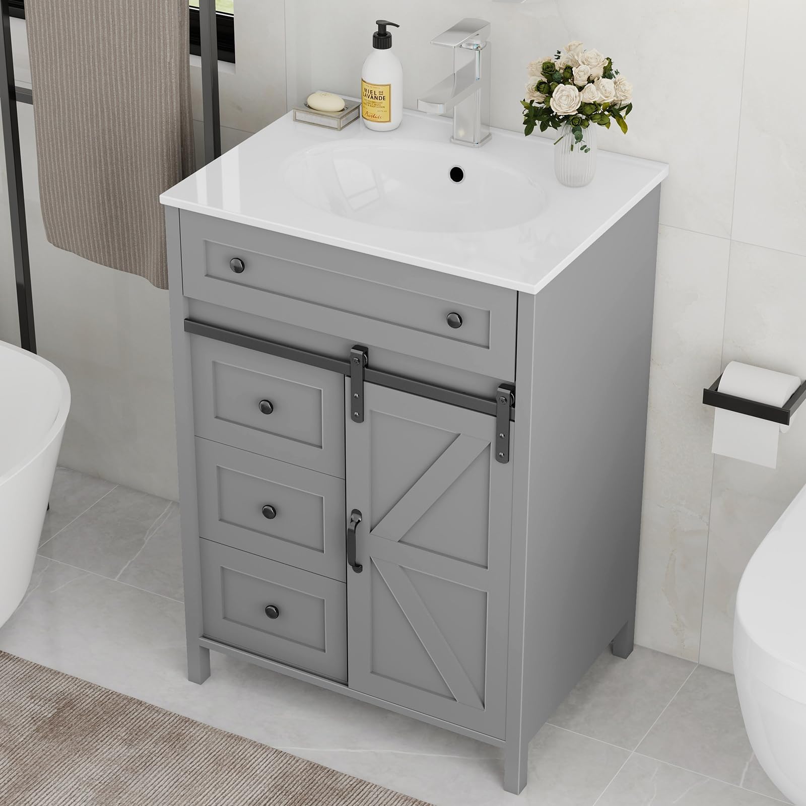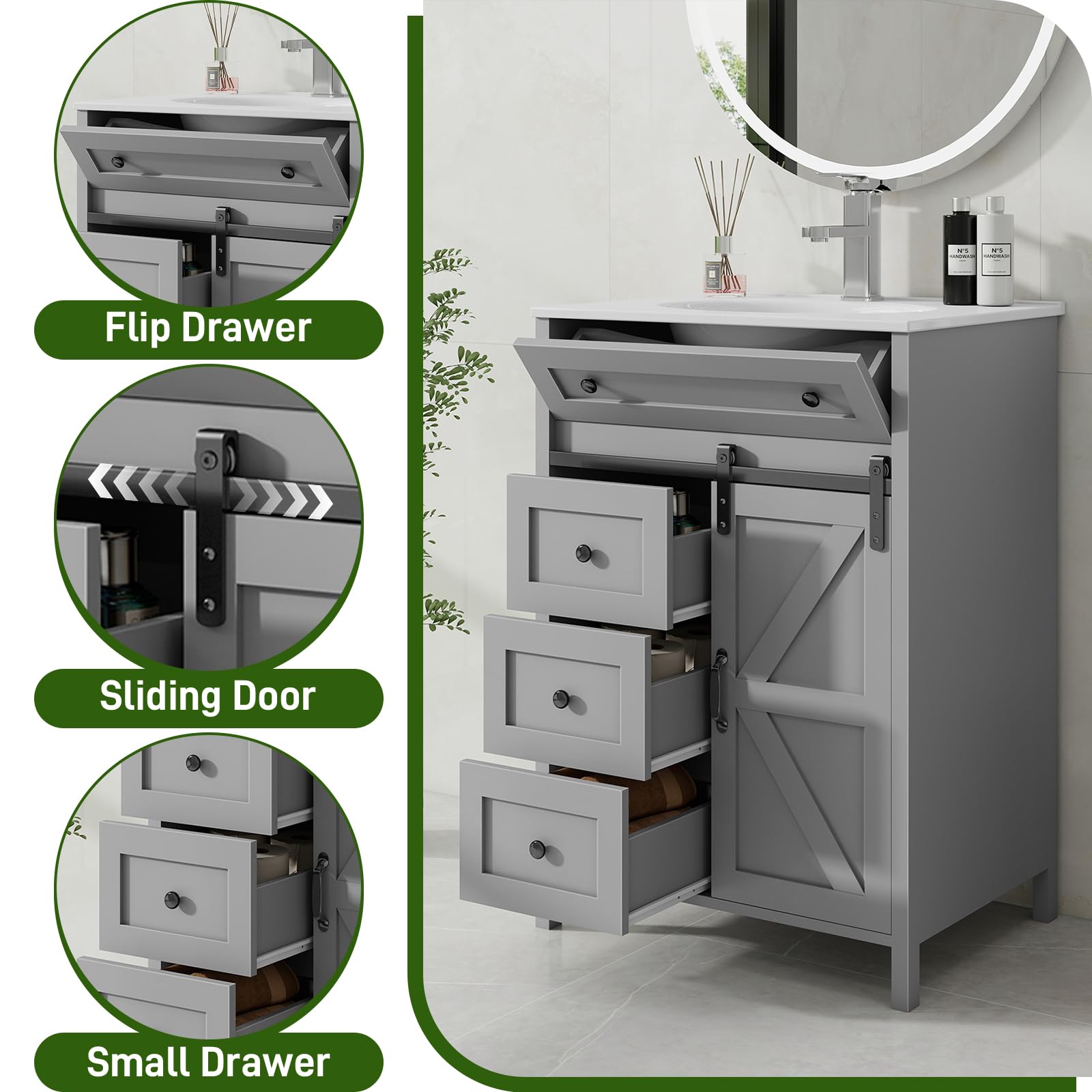 【Four Drawers & Sliding Door for Easy Storage】: This bathroom vanity includes four handy drawers and a mobile sliding door. The drawers allow for small-item storage. The sliding door gives easy access to bigger items. The design is space-saving and practical, letting you keep things well-organized.
