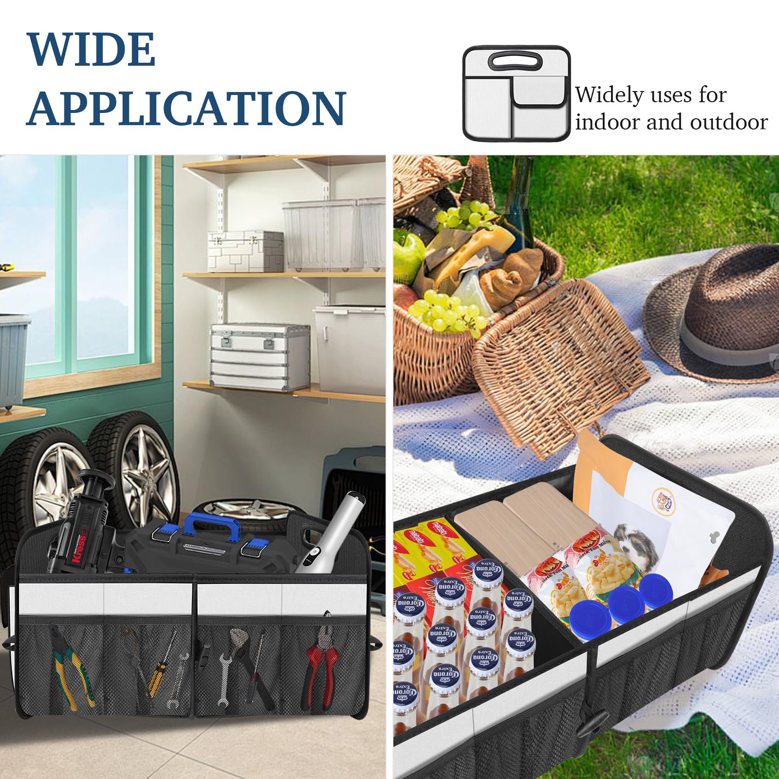 【Trunk Organizer for Car】:This is the optimal solution for maintaining a clean car interior as car accessories. Suitable for all vehicle types, like trucks, SUVs, vans, jeeps, cars, etc., and it's fantastic for transporting and arranging groceries, toys, athletic equipment, tools, and more in your trunk. Eliminate trunk clutter situation with this car organizer.