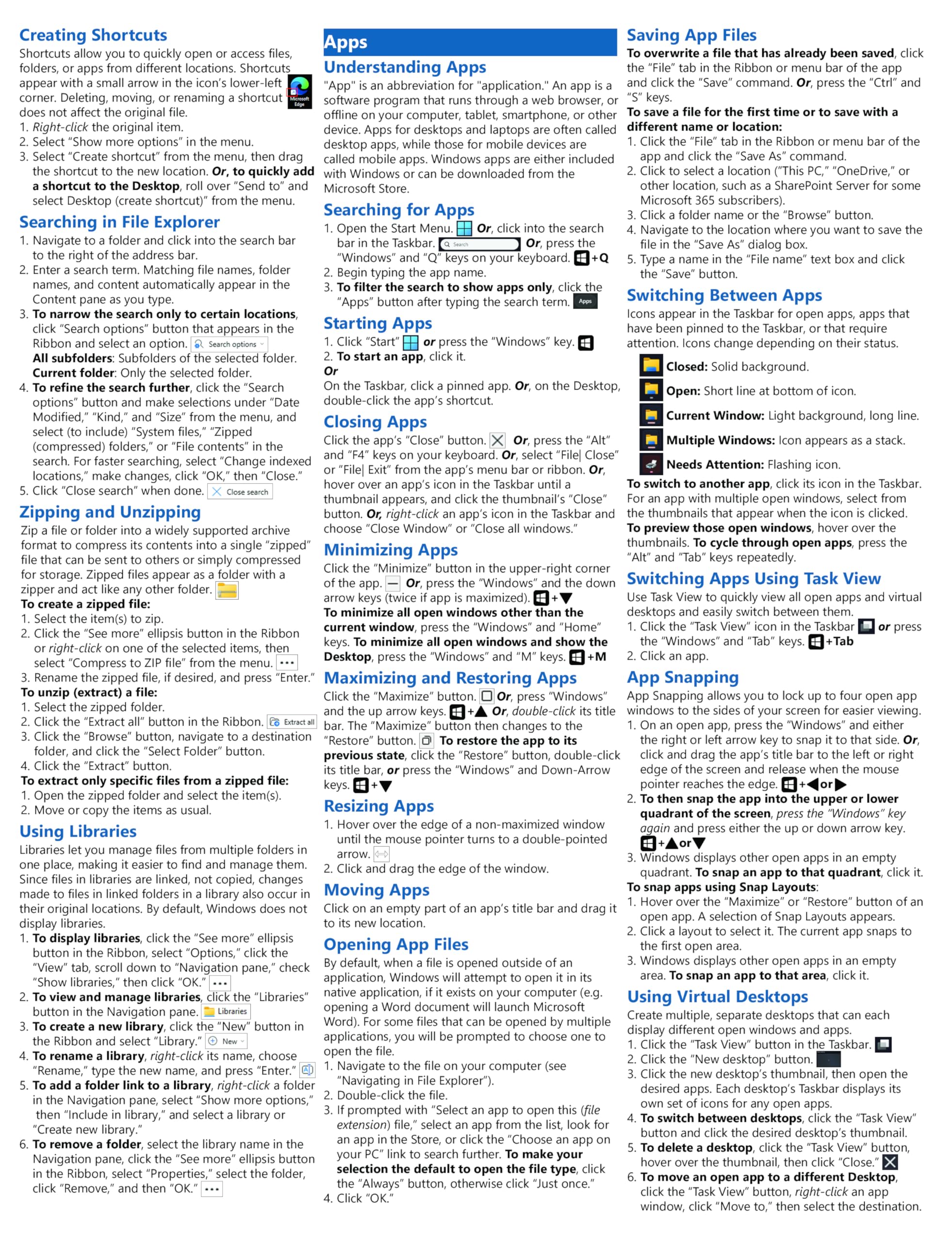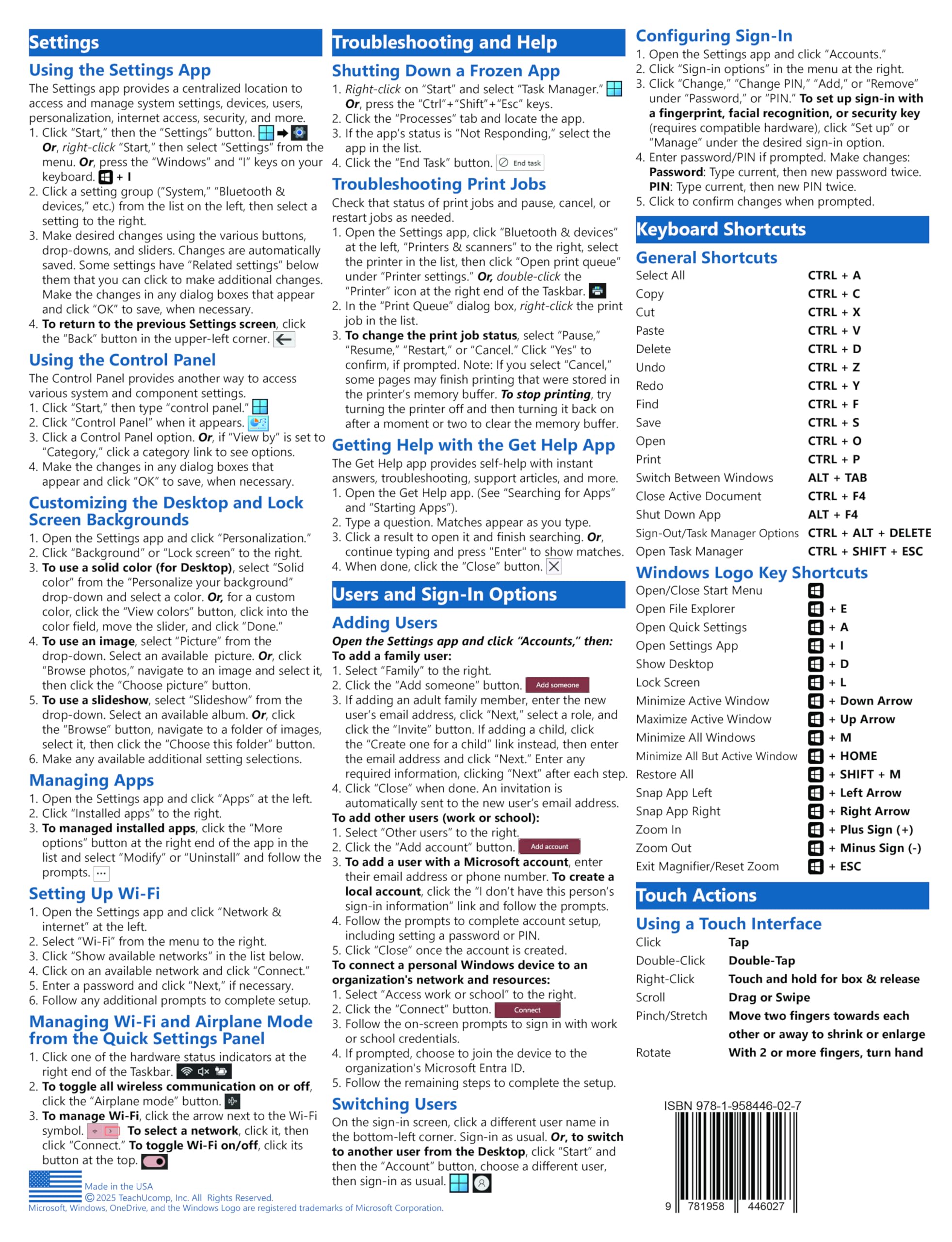 Designed with the busy professional in mind, this 4-page laminated quick reference guide provides step-by-step instructions in Windows 11. When you need an answer fast, you will find it right at your fingertips. Durable and easy-to-use, quick reference cards are perfect for individuals, businesses and as supplemental training materials. With 66 topics covered, this guide is perfect for someone new to Windows or upgrading from a previous version. Topics Include: Windows Basics; The Start Menu and Taskbar; File Explorer- Folders and Files; Apps; Windows Settings; Troubleshooting and Help; Users and Sign-In Options; Touch Actions; Keyboard Shortcuts.