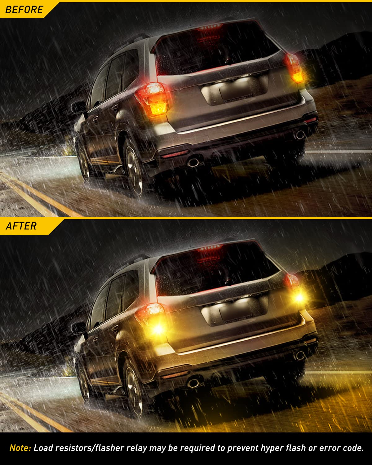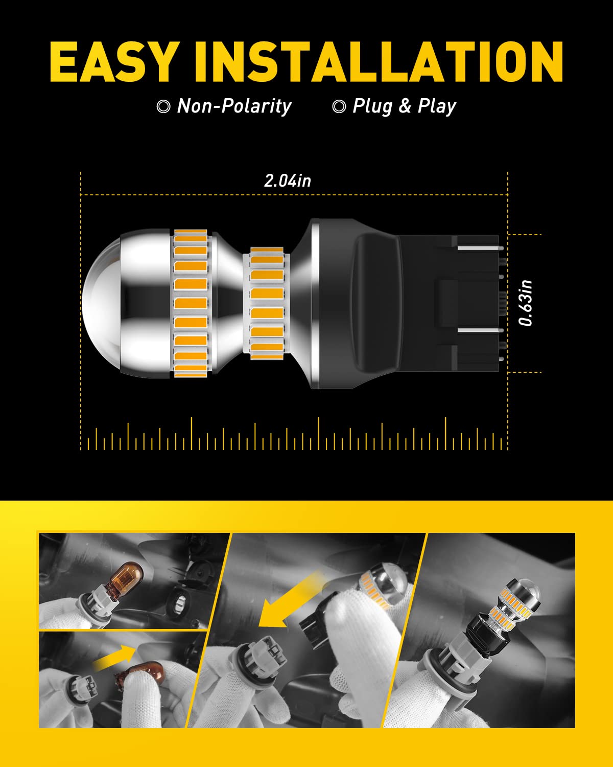 Resembling halogen bulb shape design and sequencing 54 4014-SMD LED chips precisely around the 3157 led amber bulb. Delivering 360° high luminous efficiency with full amber light. Much easier noticed and much more safer driving