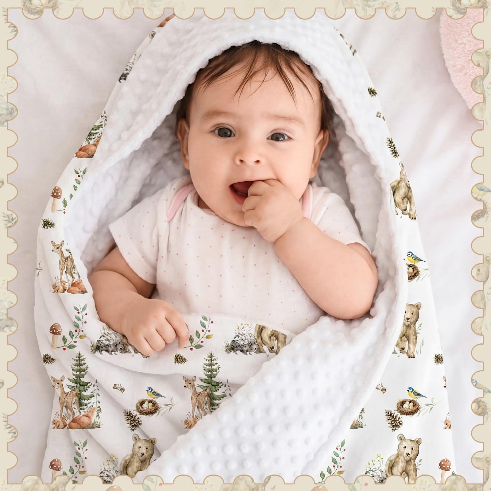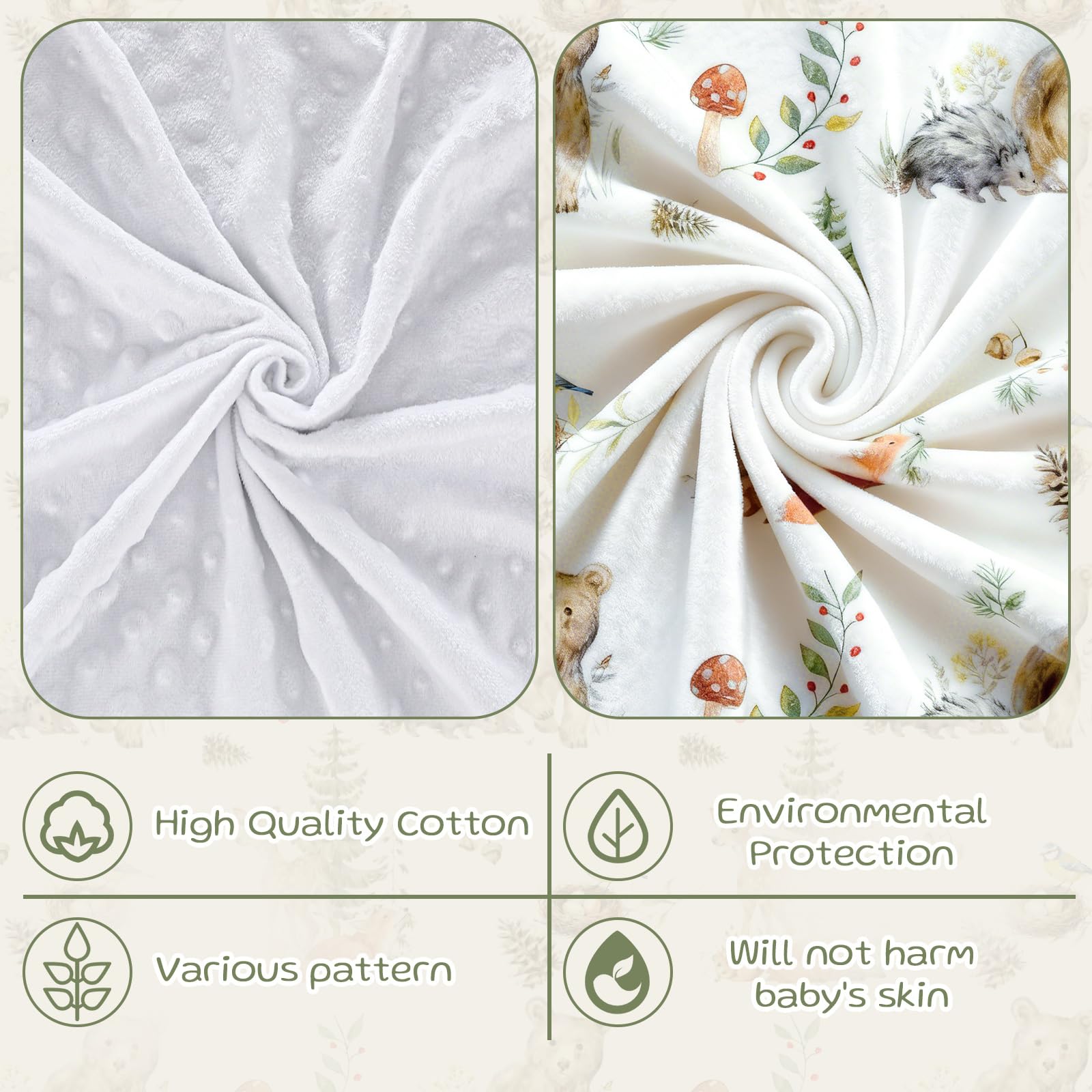 Material: woodland animals bubble blanket is made from soft flannel fabric that's breathable, skin friendly, lightweight, warm and comfortable against baby's delicate skin; Its double layered design with a polka dot backing ensures warm secure sleep