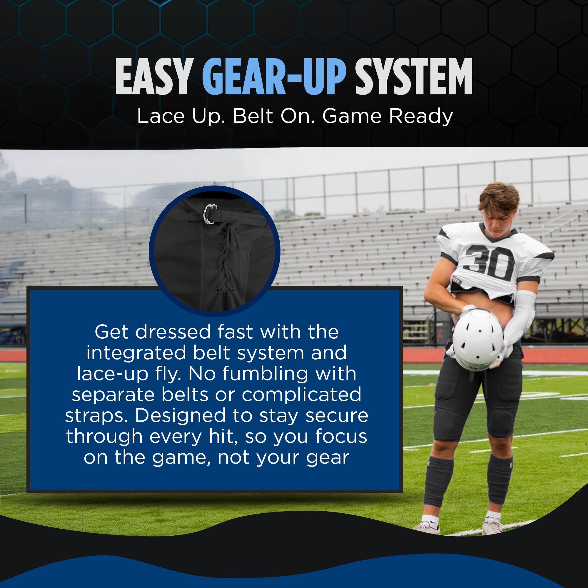 Lace-up fly and integrated belt for better fit and comfort; Machine washable football pants with pads