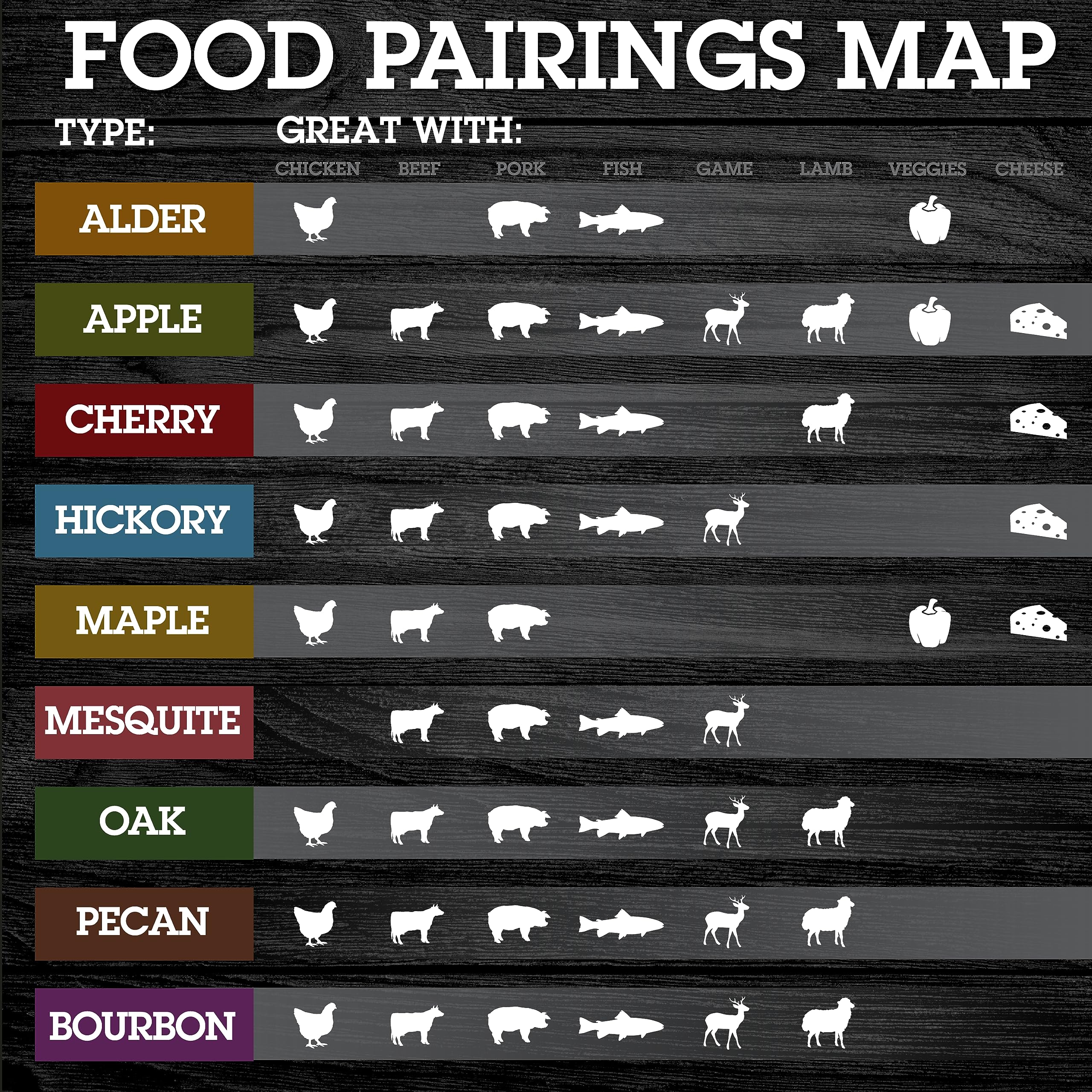 Alder is a mild wood that creates a delicate smokey flavor. Alder wood chips pair well with poultry, pork, seafood, and veggies!