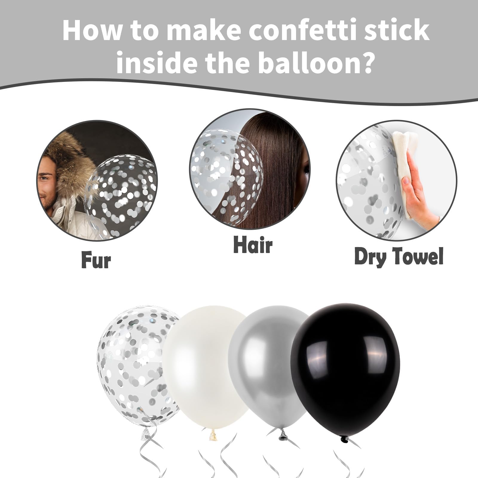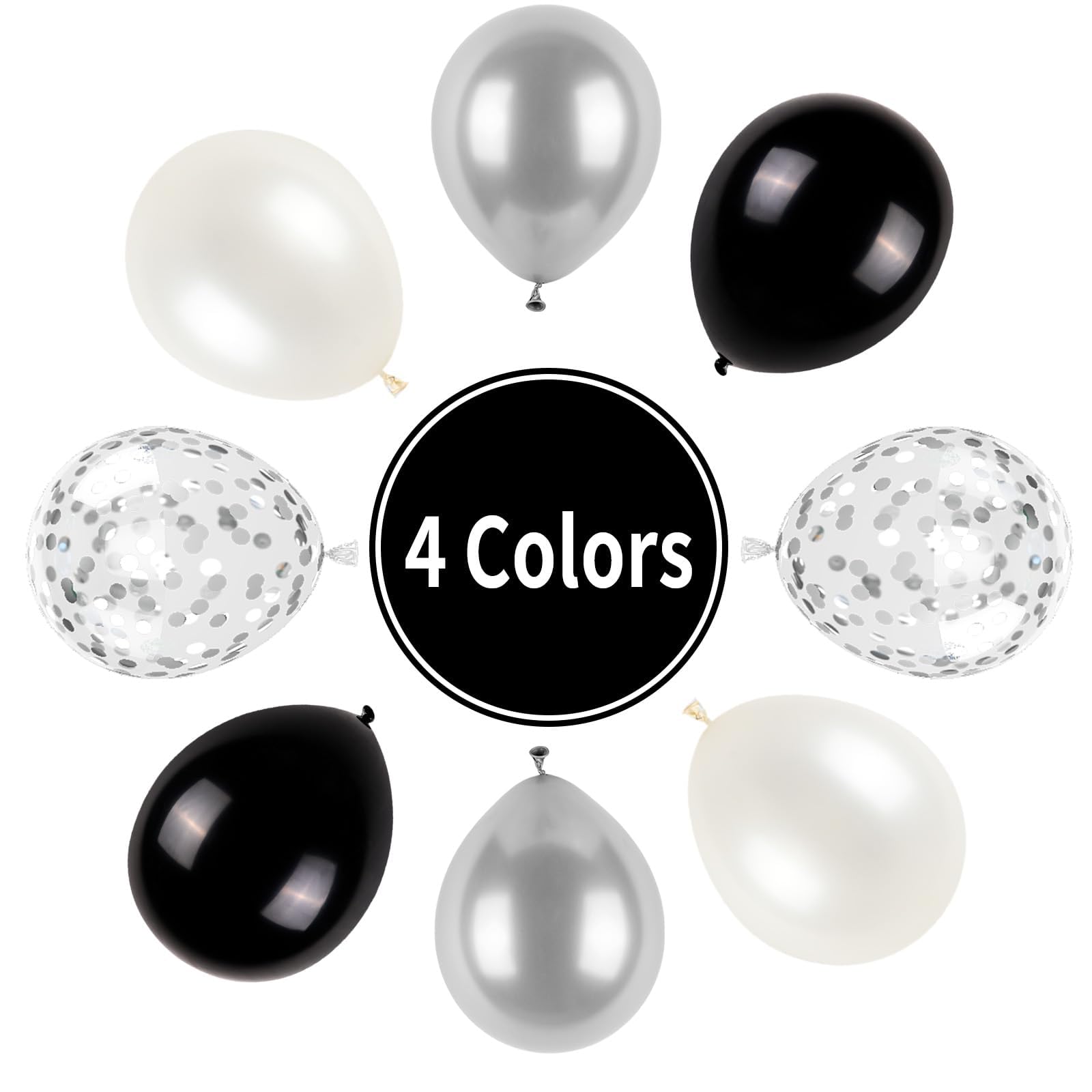 【12Inch Party Balloons Set】: The black and silver balloons set includes 20pcs matte black balloons, 10pcs metallic silver balloons, 15pcs silver confetti balloons, 15pcs pearl silver balloons, 1pc silver ribbon. 61pcs in total. Elevate your celebrations with our birthday party balloons!