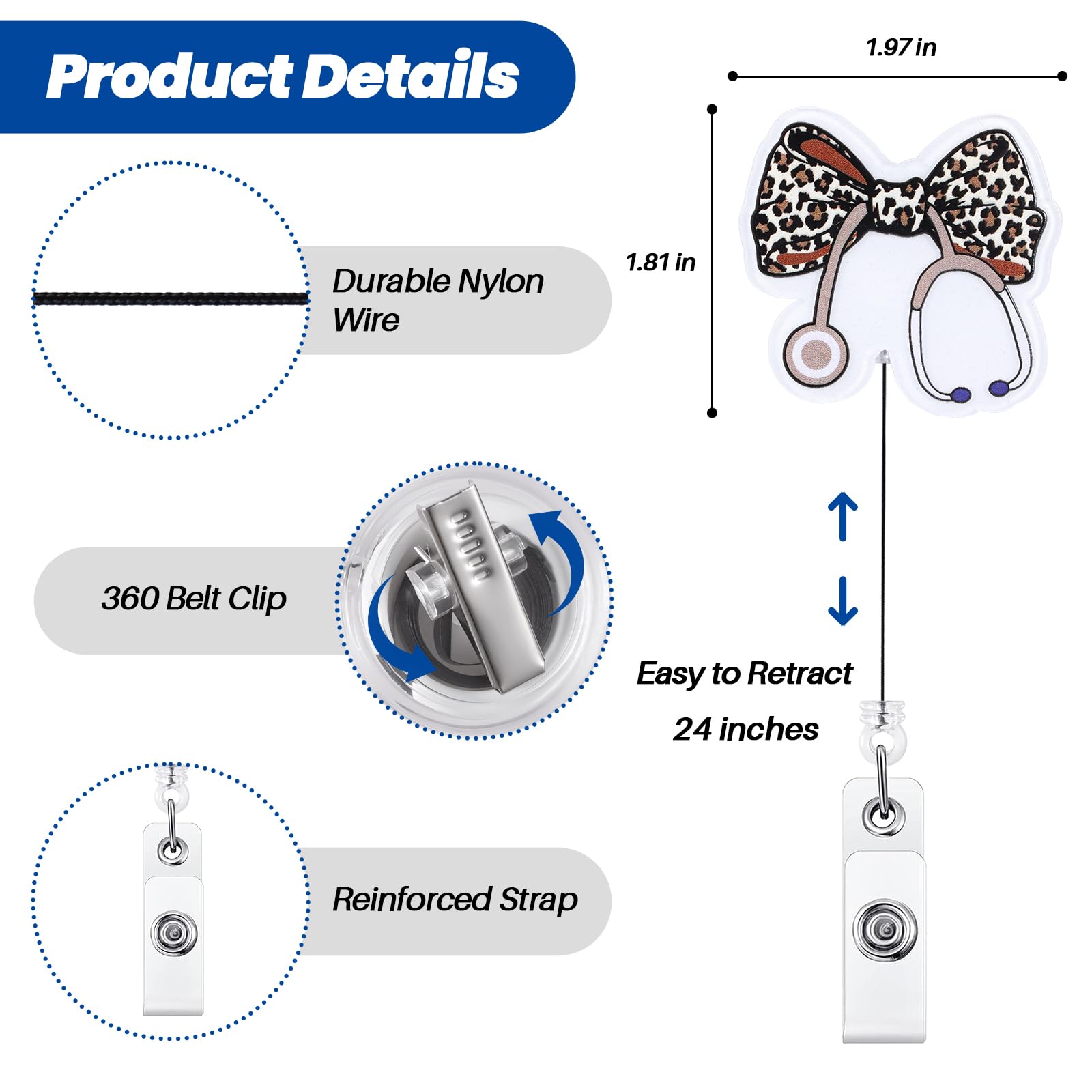 Retractable Cord: The retractable reel cord extends a maximum of 24 inches, more than enough to reach comfortably as far as your arm can reach. The flexible retractable feature enables you to effortlessly display your badge without removing it, enhancing your efficiency at work.