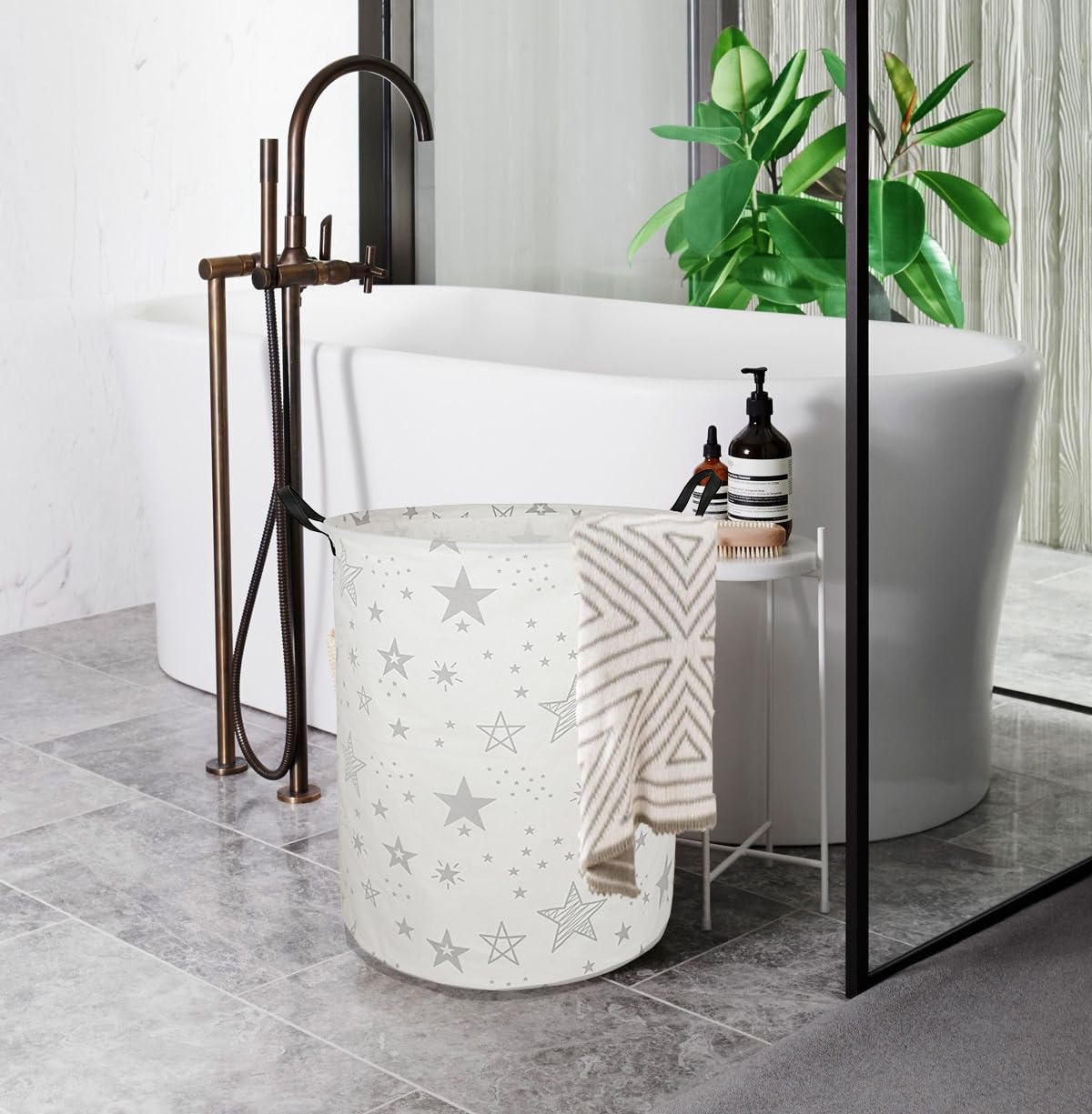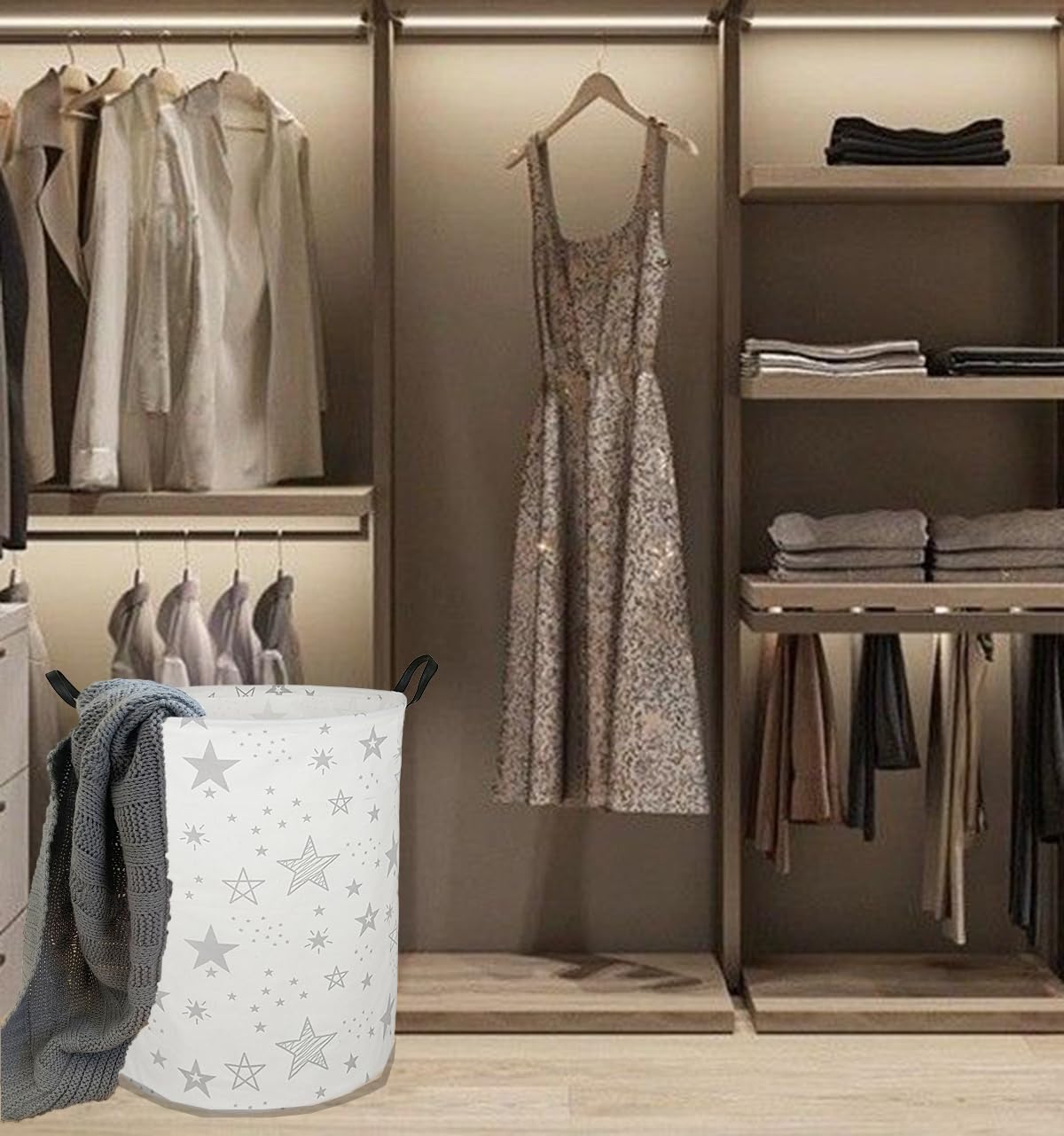 MATERIAL: 70% polyester, 30% cotton, PE waterproof coating Lining SIZE: 19.7 in (height) x 15.7 in (diameter) EASY TO USE: The laundry hamper adopted collapsible design, equipped with handles . It is lightweight and portable for using, storing, and moving conveniently. Multi-functional: clothes hamper is suitable to store dirty clothes washing, place in the kid's' room to store toys, books and other household goods, keep the house clean and tidy. Perfect laundry hamper for baby girls nursery, home, office, closet organizer, bedroom, bathroom, college dorm, etc. NOTE: The laundry hamper comes with compression packing which may result in crumpled in long-distance transit. It will recover after a period of time and also can be smoothed out by steam iron and hairdryer.