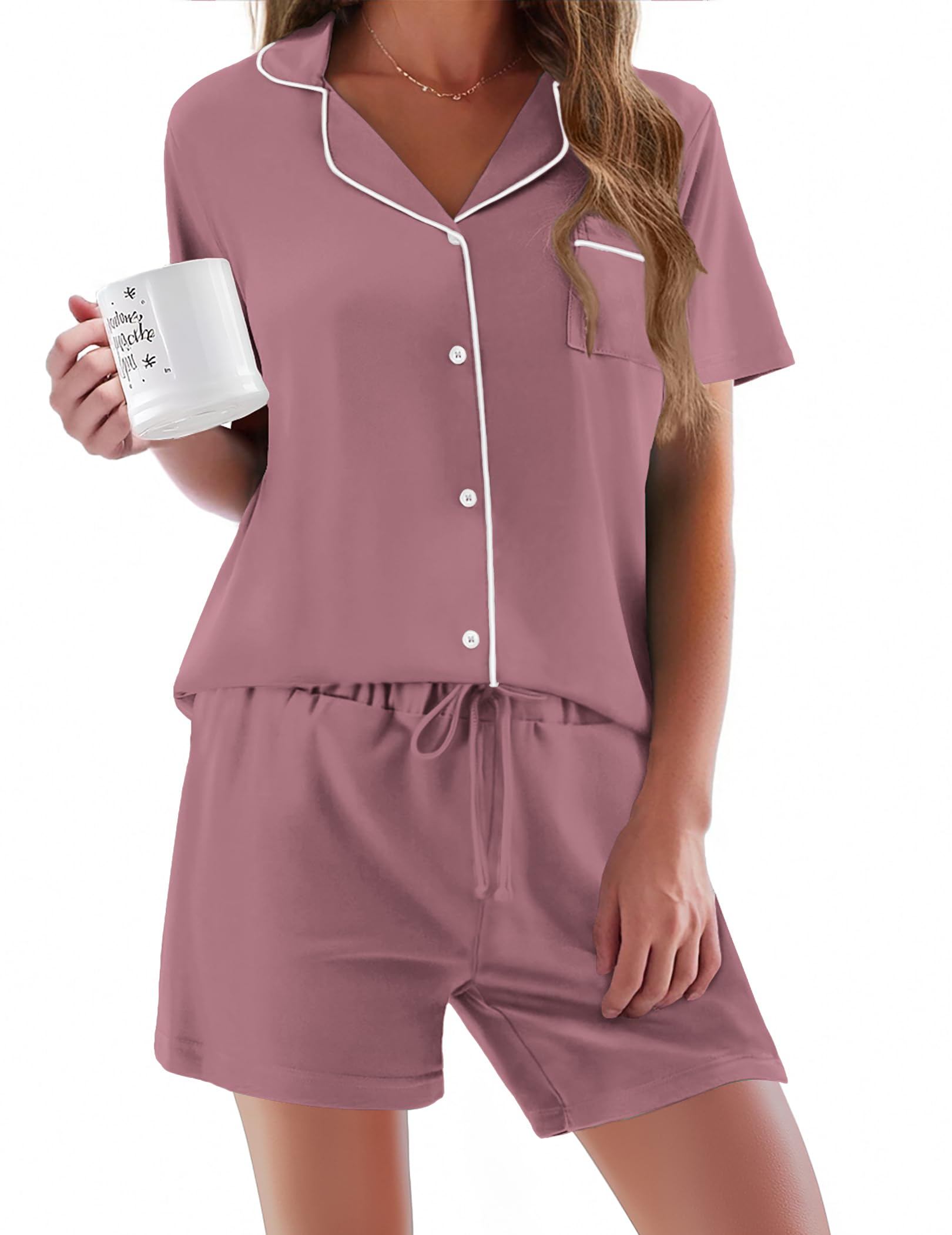 VERSATILE STYLE: Classic two-piece loungewear with short-sleeve top and boxer shorts. Relaxed fit suitable for sleeping, lounging, or casual wear.