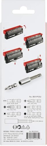 Including +1, +2, +3, SL4, SL6, SL8, SQ1, SQ2, SQ3, T10, T15, T20, T25, T27, T30, T40, PZ1, PZ2, PZ3, H3, H4, H5, H6, H3/32, H7/64, H1/8, H9/64, H3/16, H7/32, H1/4"& 1/4" Hex Bit Holder with C-Ring retainer