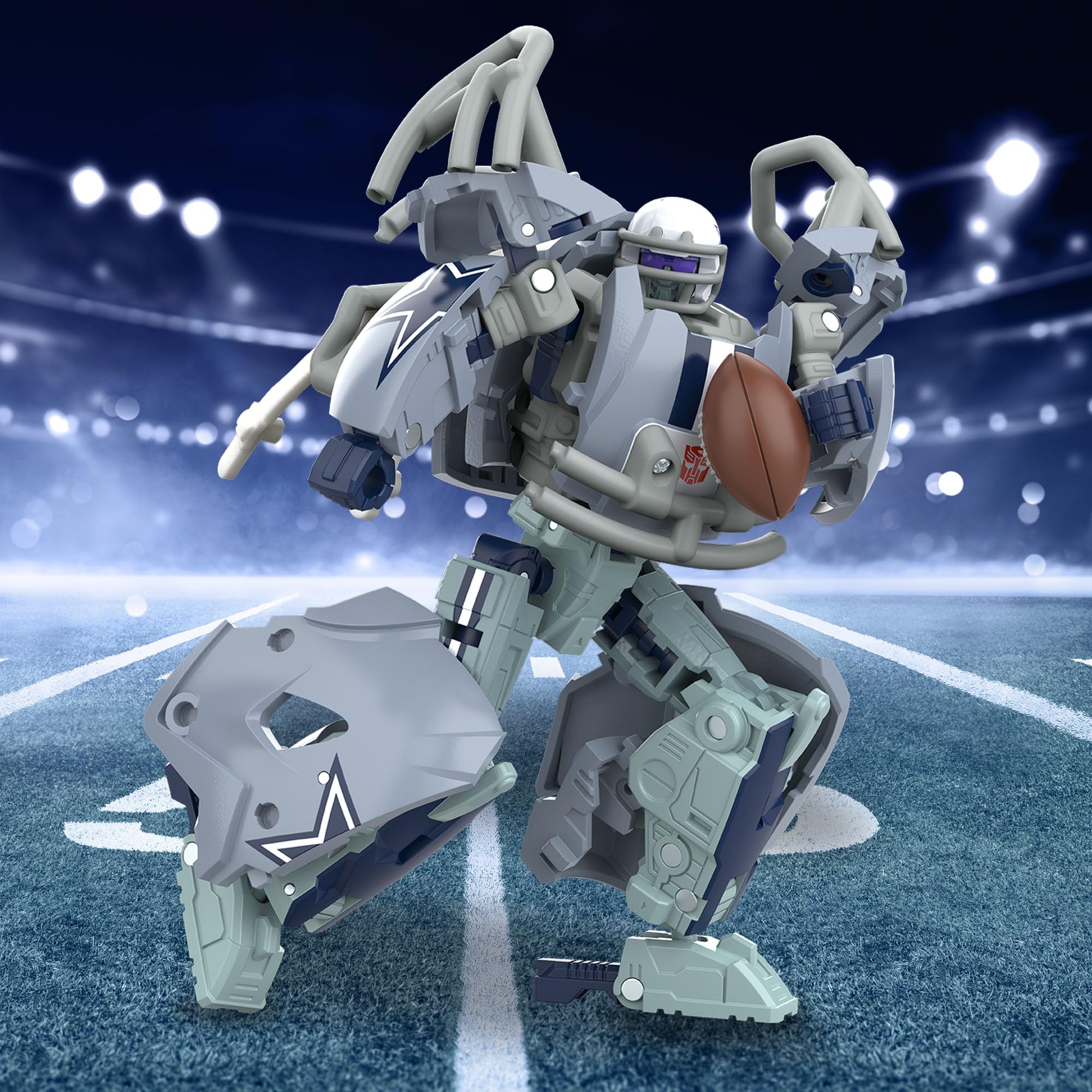 OFFICIALLY LICENSED NFL TRANSFORMERS BOT: This Transformers figure, Starblitz, represents the Dallas Cowboys and features team colors, a mini helmet and football accessory.