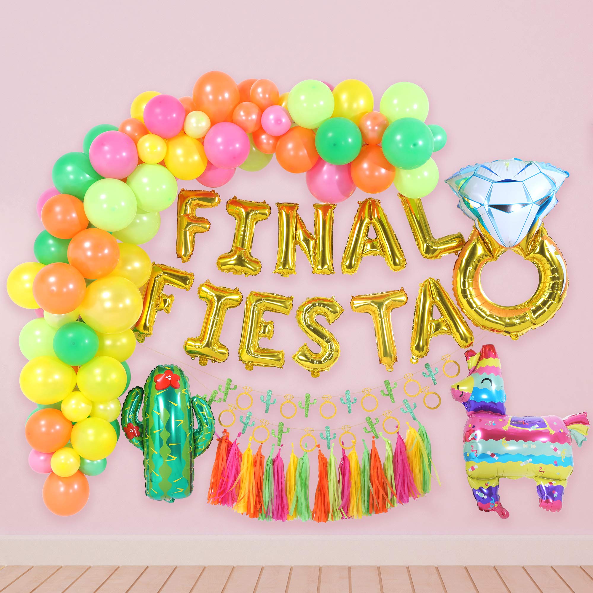 🎉 EVERYTHING YOU NEED- One easy to create balloon arch kit with 5 fun fiesta colors, bright fiesta tassels, pre-assembled bachelorette banner with ring and cactus glitter design, “Final Fiesta” gold foil balloons, plus a cactus, llama and diamond ring foil balloon.
