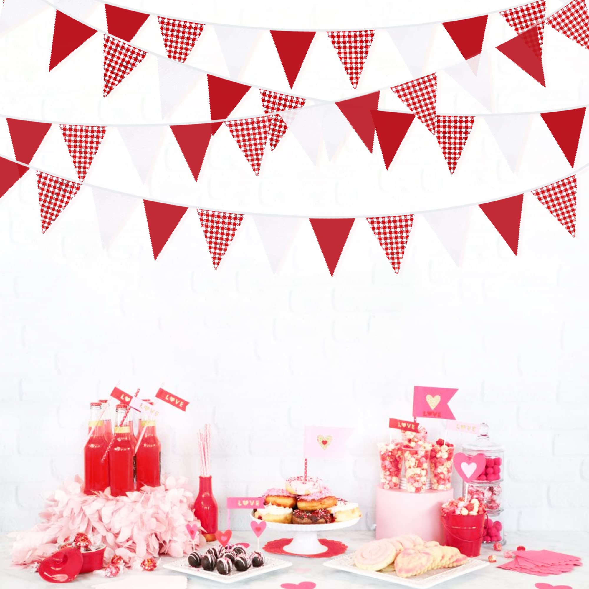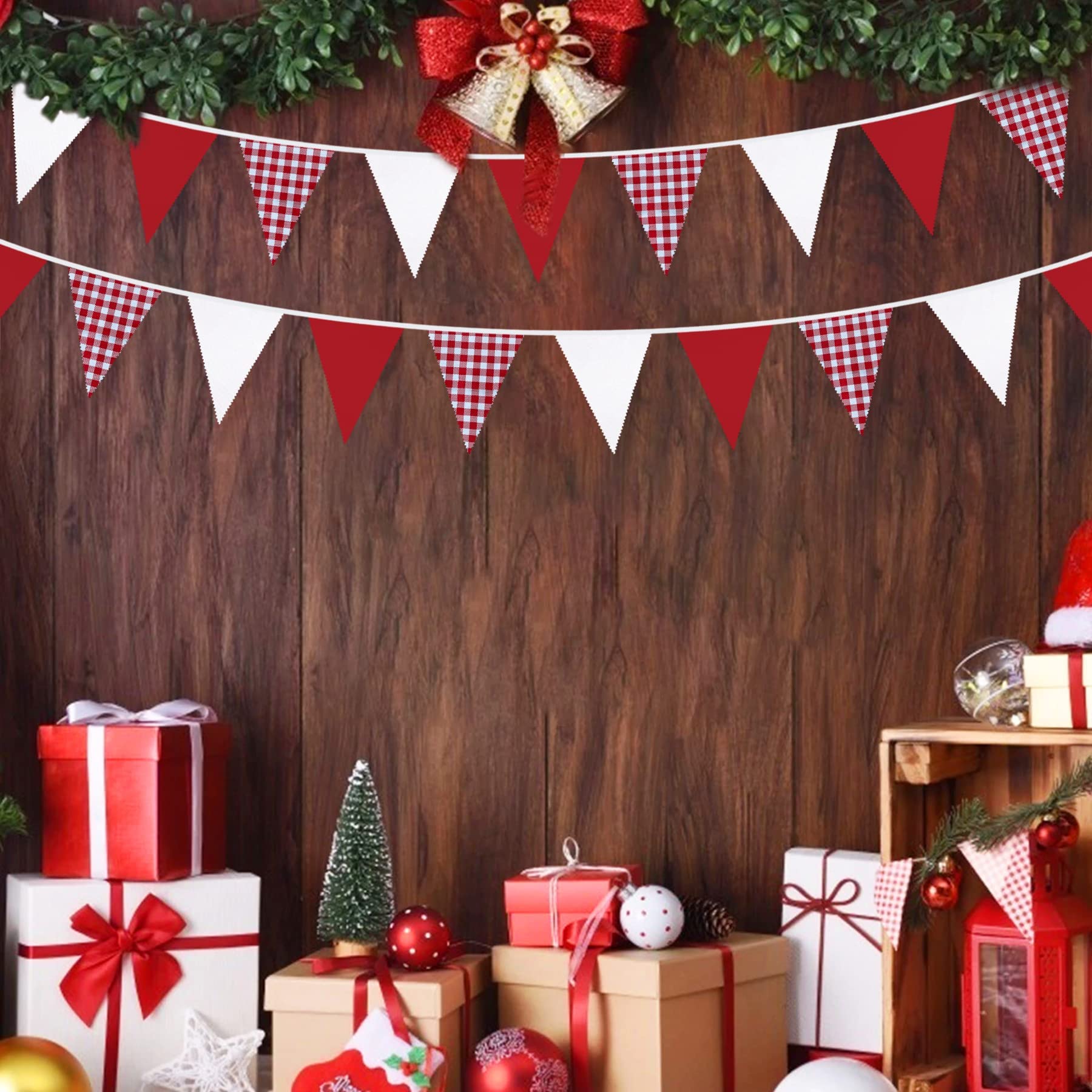 Package Including:1 pack Christmas fabric bunting banner garland in red checkered, red and white, with 36pcs flags in 10M/32.8Feet. Flag Size: 5.5in width x 7in height.