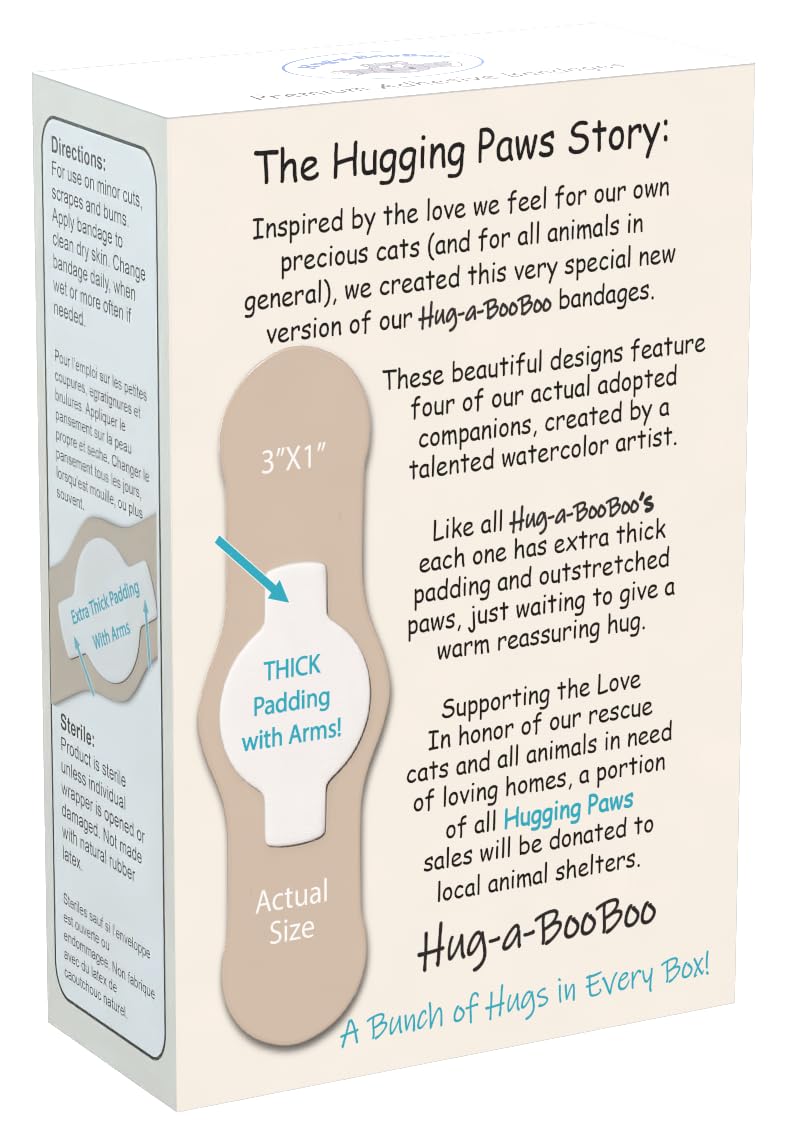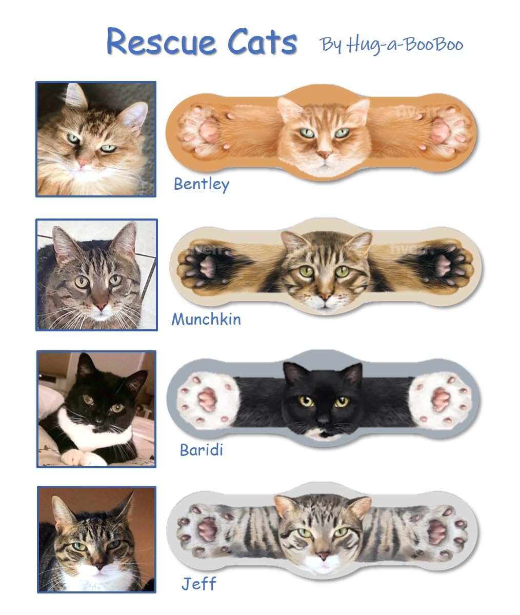 Cat Lovers rejoice! Every BooBoo Needs a Hug, so we created a bandage that gives one - and now our Amazing Hug-a-BooBoos feature four of our very own Precious Rescue Cats, beautifully painted by a talented watercolor artist! Like all Hug-a-BooBoos, the adorable cats on these Patented Premium adhesive bandages all have outstretched paws, just waiting to give a comforting hug to any scrape or cut! No booboo - no problem! You can wear one anyway! Great Gift for Cat Lovers !