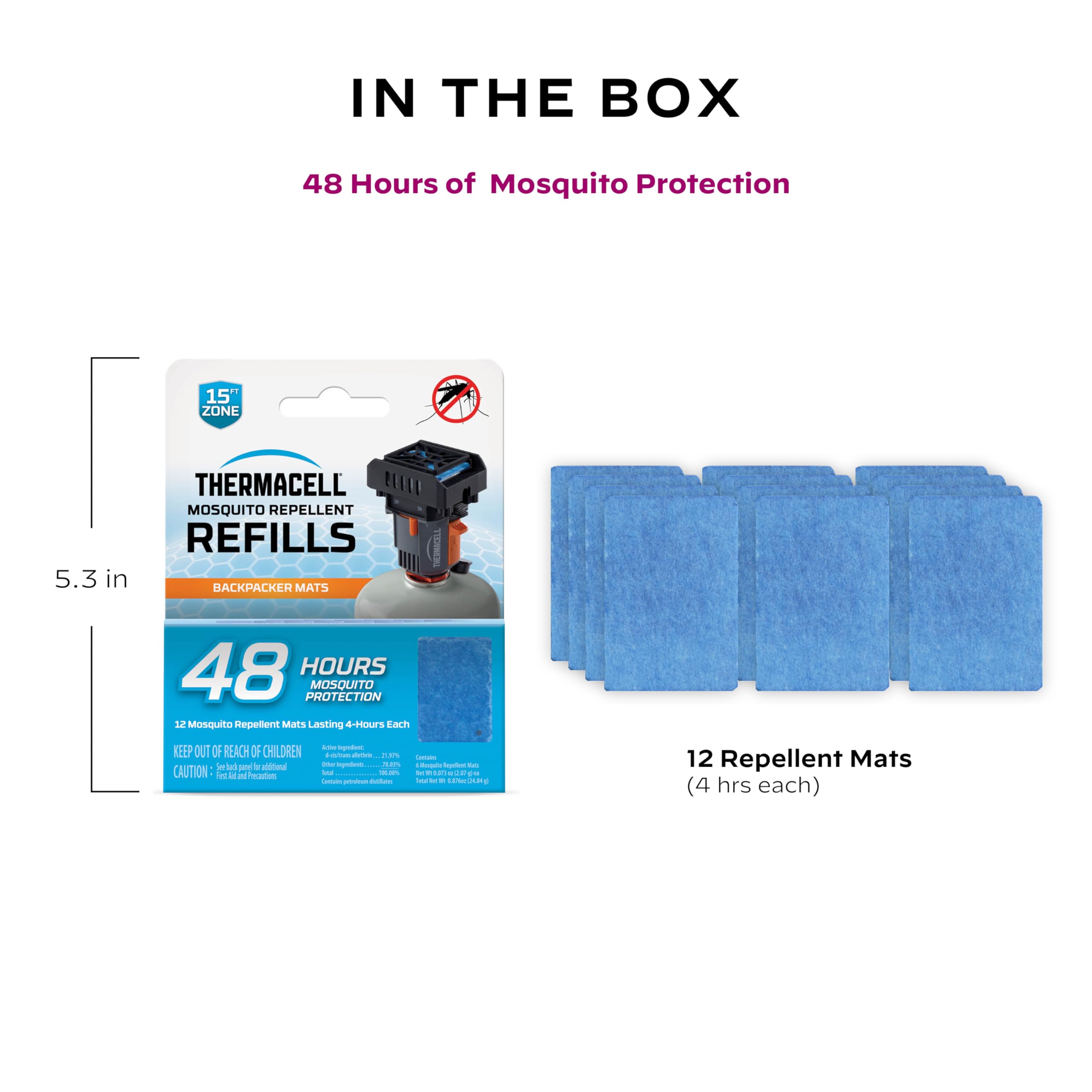 EFFECTIVE MOSQUITO REPELLENT FORMULA: Thermacell Mosquito Repellent creates a 15-foot zone of protection against mosquitoes. This 48-hour mat-only refill pack is for use in the Thermacell Backpacker Mosquito Repeller only.