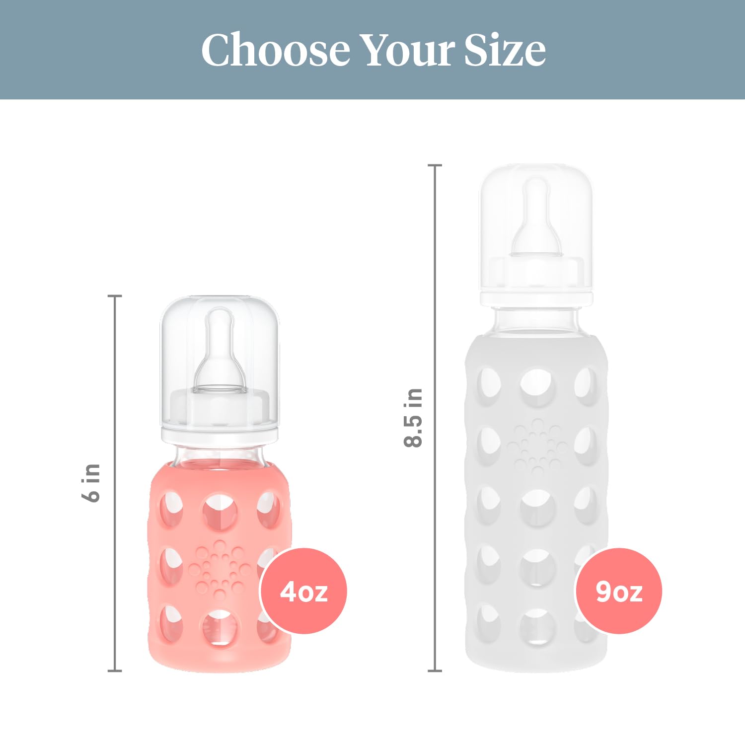 Our baby bottles are made of the highest quality, thermal shock resistant borosilicate glass. This allows our bottles to transition safely from freezer to boiling water. The silicone sleeves provide a good gripping surface for little hands and help protect against the occasional drop. Includes 4-ounce (120 ml) bottle with Stage 1 (0-3 mos) nipple. Care and Use -Before first use, place in dishwasher or in boiling water for 3 minutes. This is to ensure hygiene. Immediately after use, disassemble individual top components (e.g. nipple from top or valve from cap). All parts are dishwasher safe (top rack only). To wash by hand: wash separately in hot, soapy water and rinse thoroughly. Bottle and sleeve may be placed in the dishwasher or boiled without removal of the sleeve. If you wish to remove the sleeve, it comes off best in warm, soapy water. To allow venting and prevent nipple/valve collapse, do not over-tighten screw top