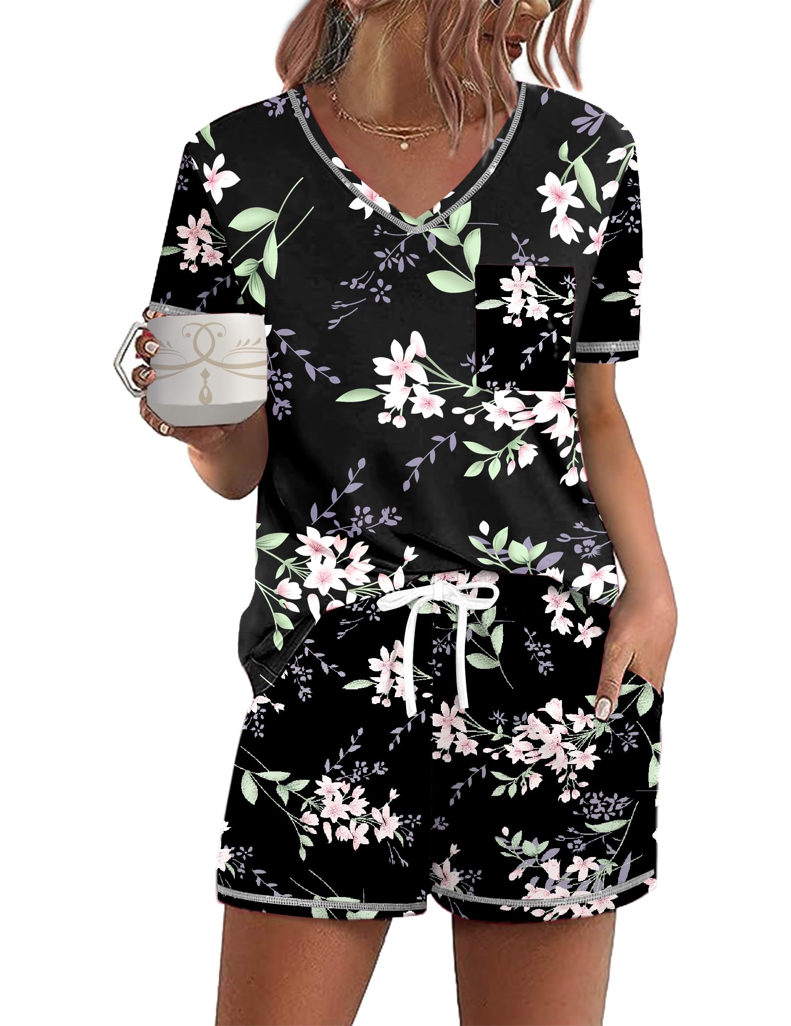 Design: The pajama top features classic chest pocket and V neck, with exquisite hemming workmanship; the pajama shorts features adjustable drawstring and pockets. Loose fit lounge sets, cute and comfy pajamas for women and teens girls