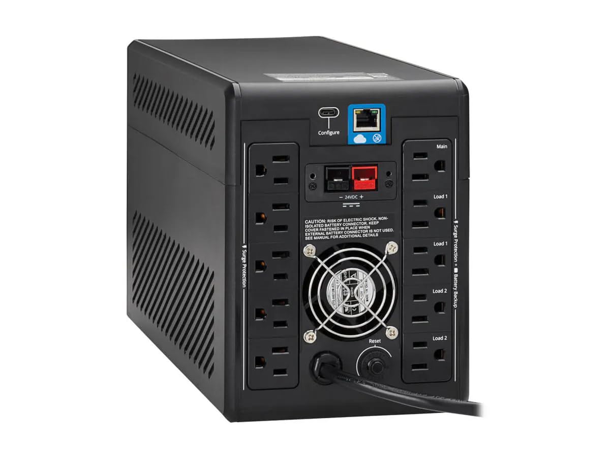 Eaton Tripp Lite SMART1500LCDTXC 1500VA 1000W uninterruptible power supply UPS battery backup and surge protector features line interactive design with pure sine wave output to ensure clean reliable power for servers workstations gaming rigs network devices home office and telecom equipment This UPS offers 10 protected outlets with surge suppression and Automatic Voltage Regulation AVR to correct brown outs undervoltage and voltage spikes without using battery power The integrated front panel LCD display provides real time monitoring of load level battery charge input output voltage and estimated run time Expandable battery options support longer backup periods with fast eight hour recharge time Energy saving green topology delivers up to 98 percent efficiency at full load Audible alarms self tests and cold start function enhance power management while compact ABS housing fits under desks or in racks Approved to CSA FCC Part 15 Class B ICES NOM RETIE RoHS UL 1778 standards and backed by a three year limited warranty