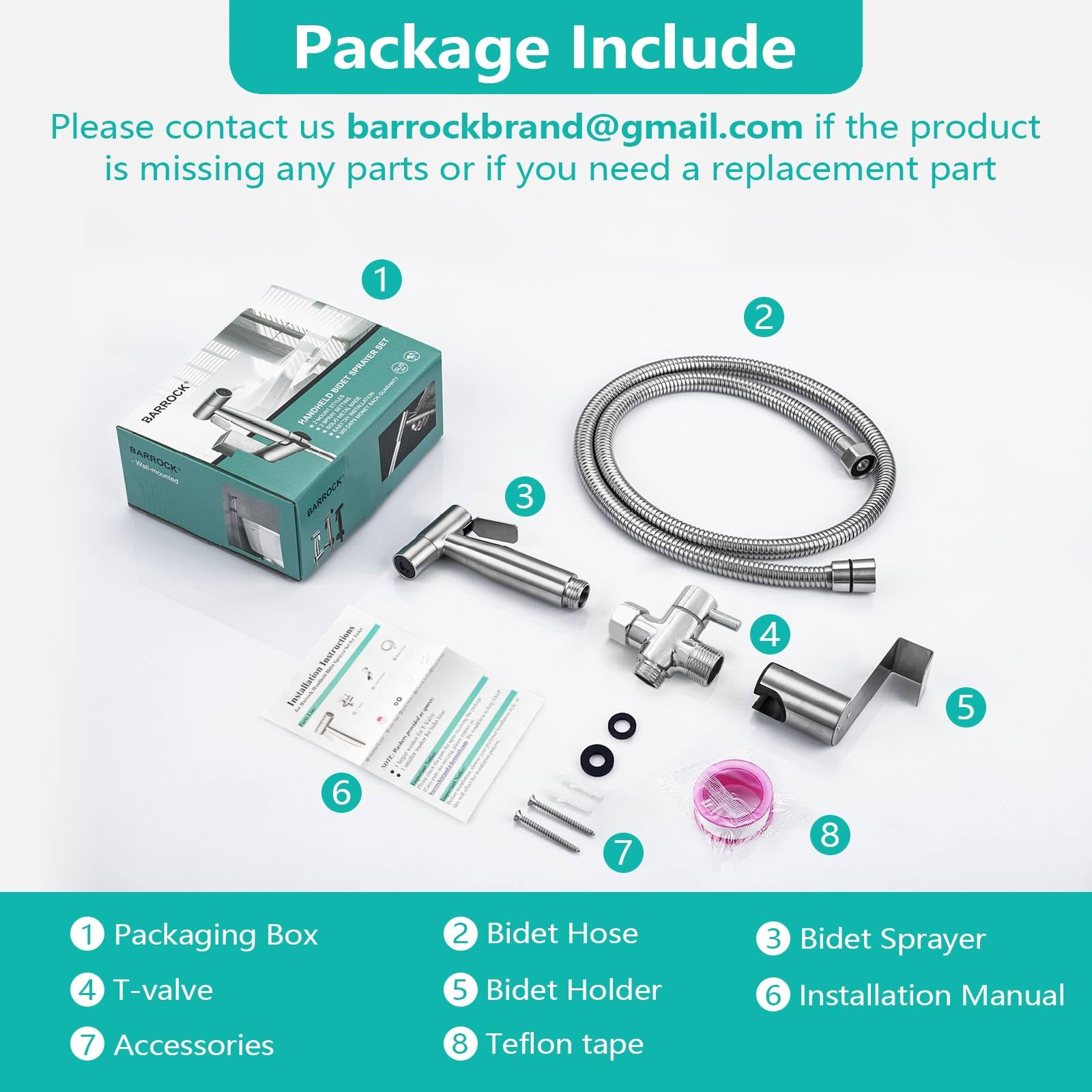 High-Quality Bidet Sprayer: Expertly designed with a solid brass T-valve,a SUS304 stainless steel sprayer, an explosion-proof bidet hose and other necessary installation accessories. Upgrade your hygiene routine with BARROCK handheld bidet sprayer