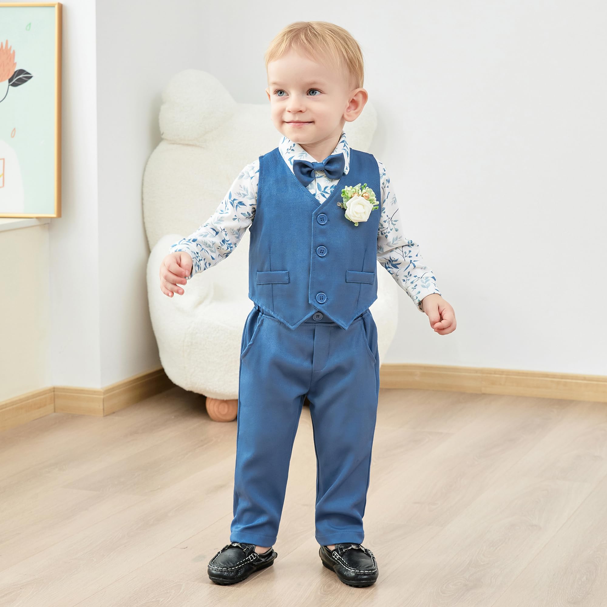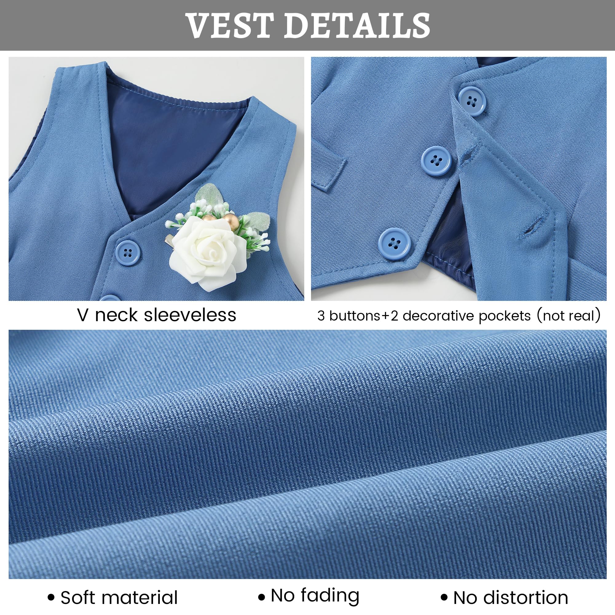 Vest Details:This baby boy suit 5Pcs baby boy formal outfits set includes a Detachable Boutonniere,a vest that features 3 buttons single-breasted closure and double lining in the back, optimal warmth, and ease of layering