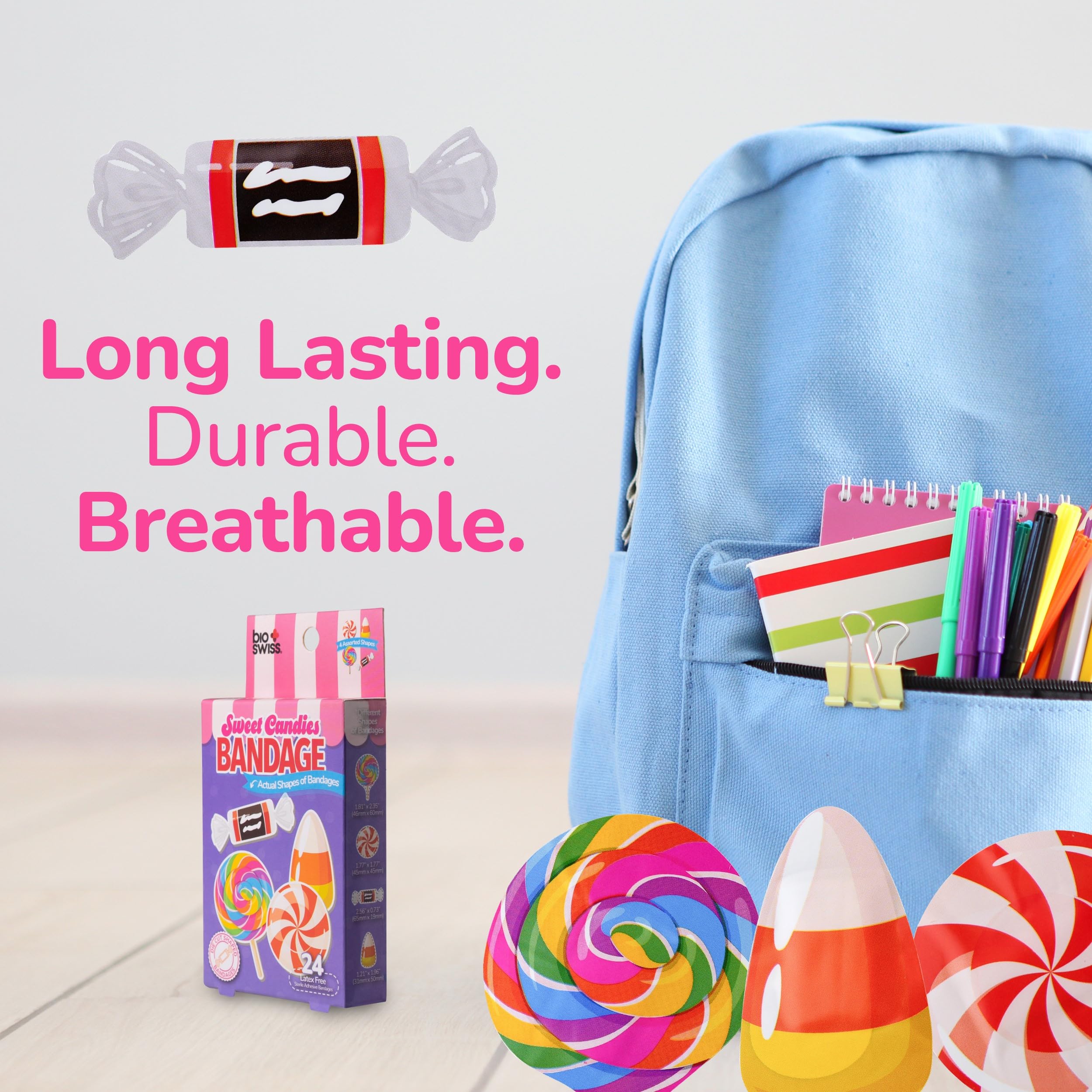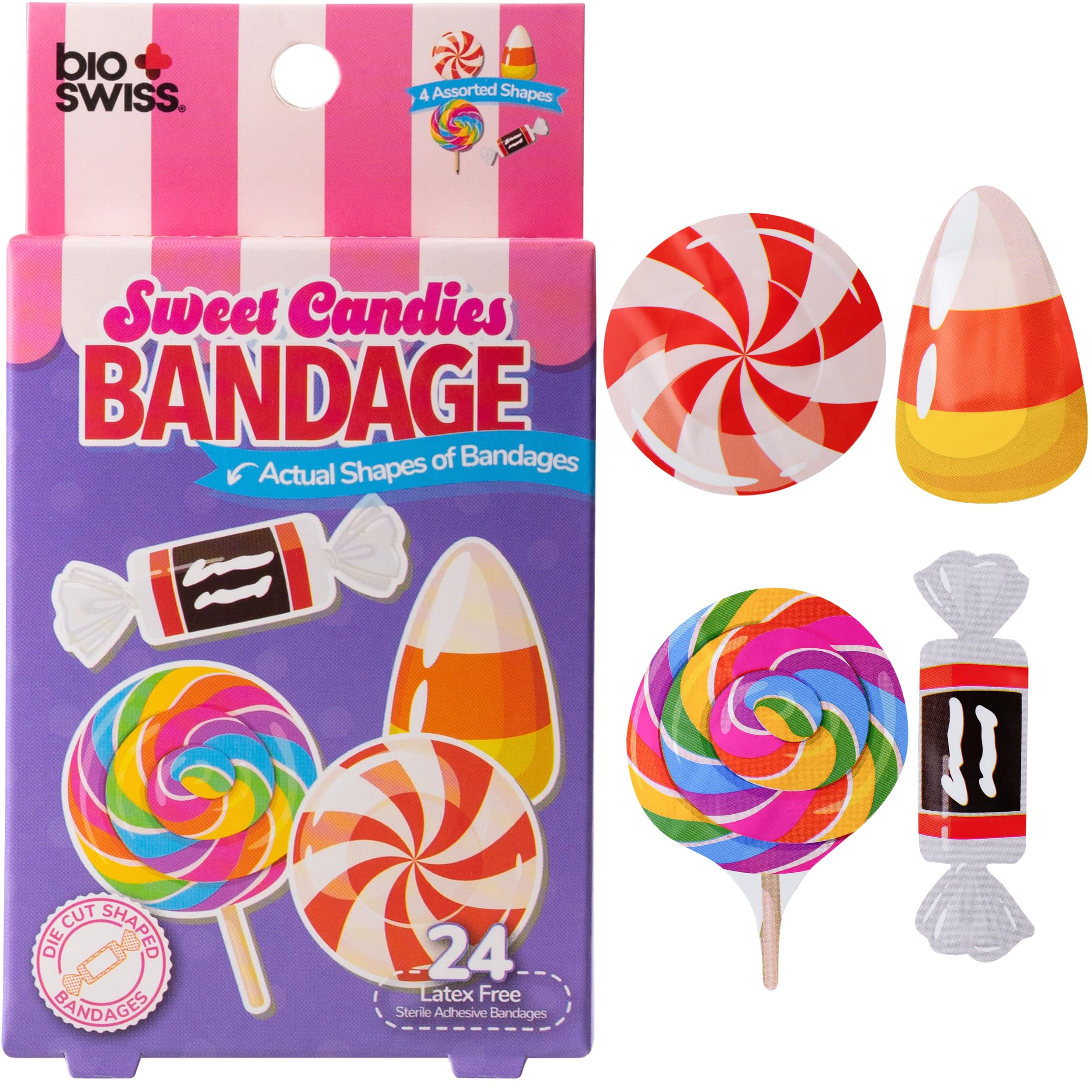 24 CANDIES KIDS BANDAGES: Fun candy-shaped adhesive bandages pack helps protect cuts, scrapes, and minor wounds while making healing less stressful for children; bandages come in 4 assorted styles