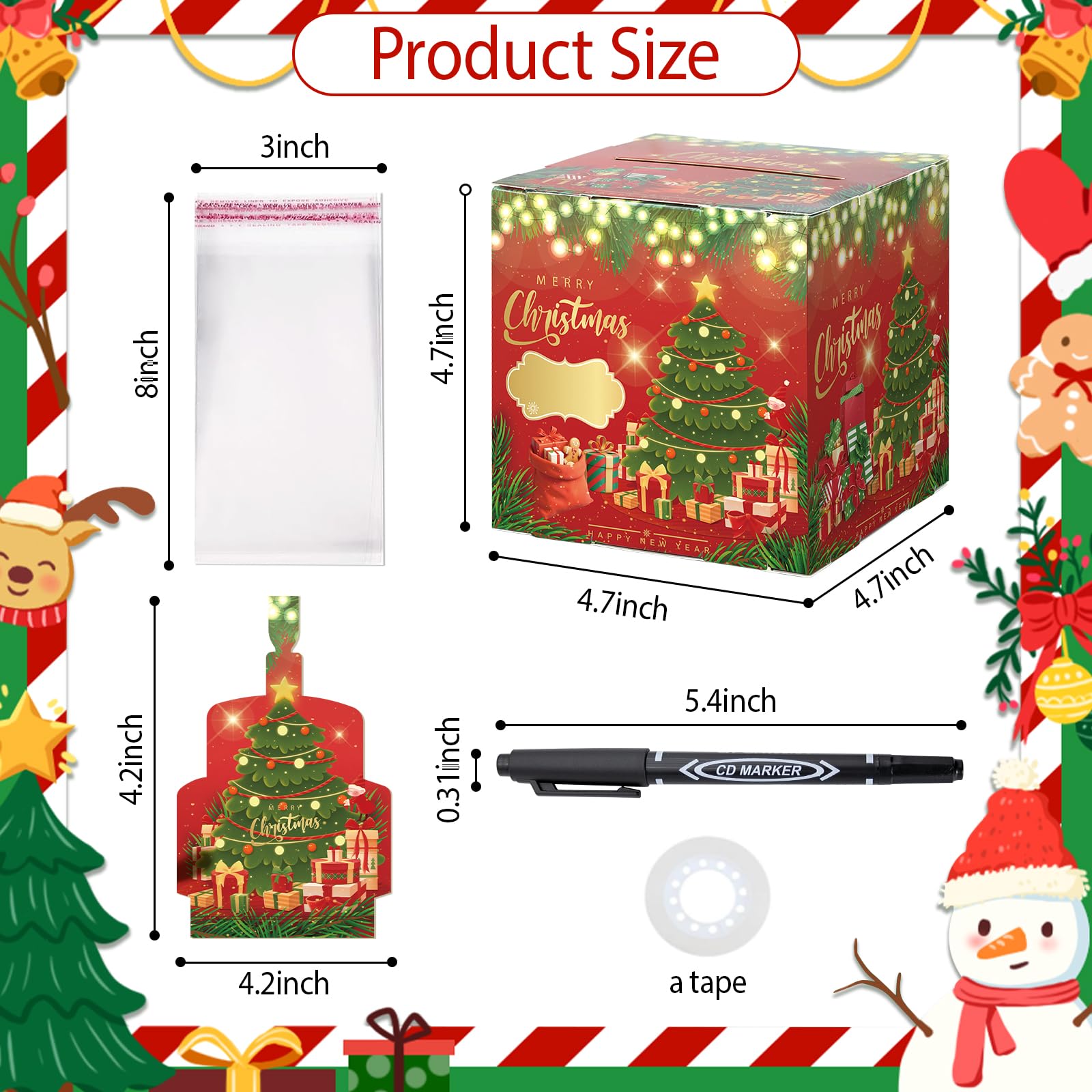 【Surprise Present Box】This money roll box measures 4.7x4.7 inches and is made of durable cardboard. It also includes 40 transparent bags and a pen, a Christmas tree-shaped puller, a dispensing glue