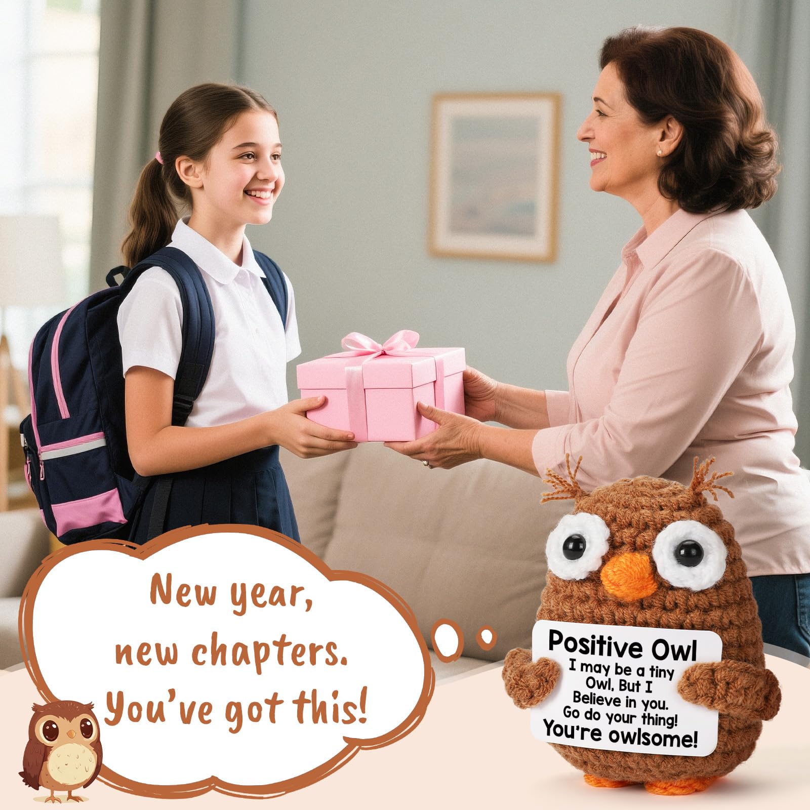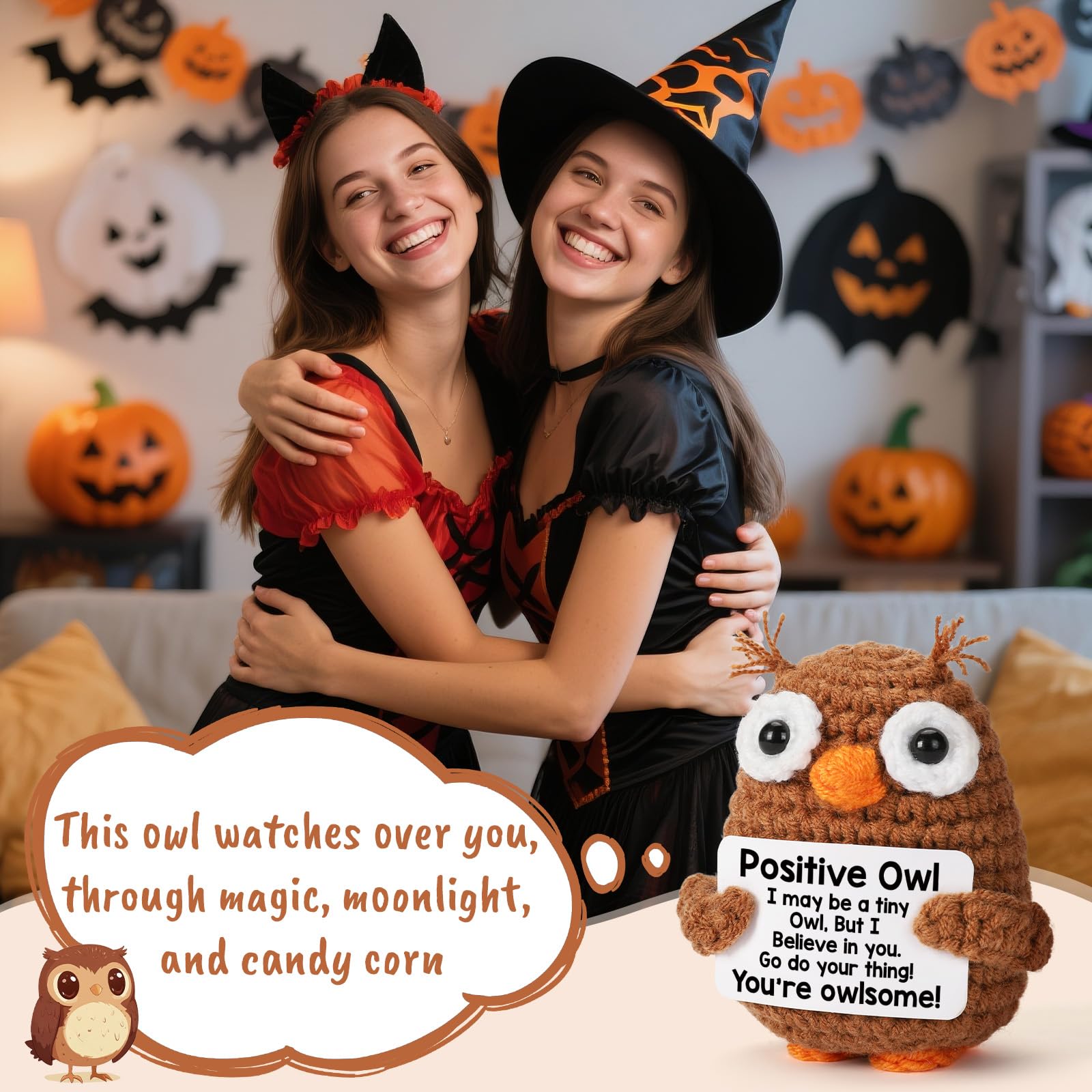 Positive owl crochet decoration adds fun and charm to spooky season, works as motivational desk buddy or unique fall home décor, creative collectible gift for coworker teacher or student during Halloween parties autumn gatherings or seasonal celebrations