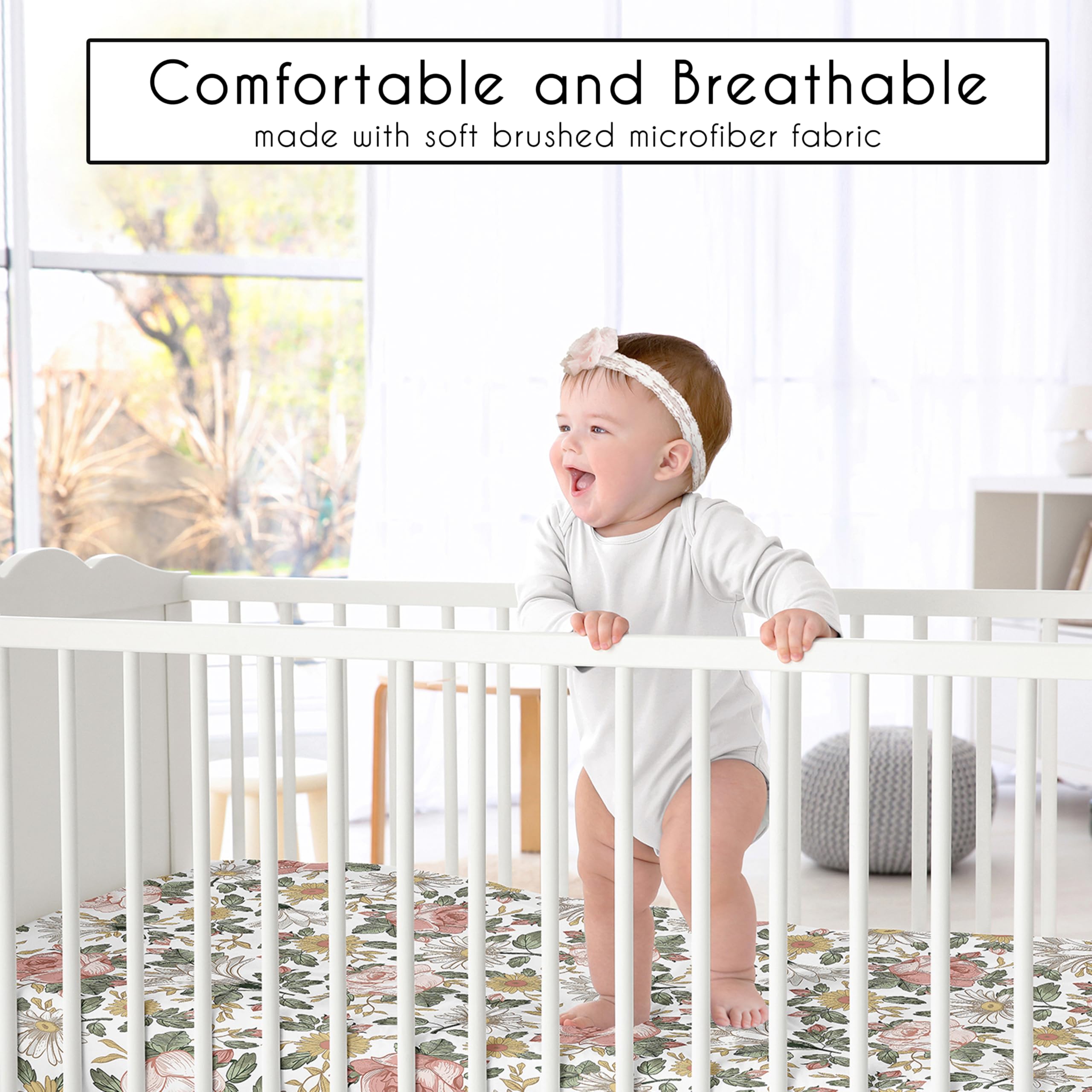 SNUG FIT: Includes: (2) Baby Crib Sheets: 52in. x 28in. x 8in. Our newborn standard crib sheets fit snugly, with premium elastic sewn around the entire bottom edge for a secure fit on most standard sized cribs and toddler beds, to reduce shifting & bunching. This microfiber cribsheets set features an exclusive design of pink yellow sage green & white shabby chic vintage floral, leaf, flower, rose, daisy, garden wildflower print & is gentle on delicate skin to foster a soothing sleep environment.