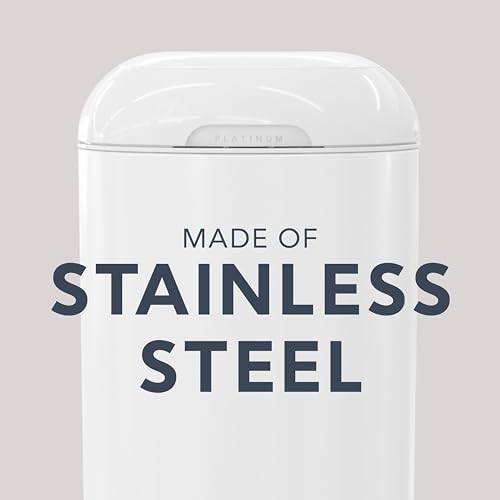 Description: Keep your nursery fresh with our new metal pail! The new Diaper Genie Platinum pail is made of durable stainless steel and has odor-locking clamps that help prevent odors of messy diapers from escaping. With its 27" height, wide opening and foot pedal, the Diaper Genie Platinum offers true hands-free operation. Our diaper disposal system holds up to 47 newborn diapers and includes a long-lasting refill that can last up to 5 months or hold up 846 newborn diapers. The Easy Roll ™ refill bags are made from durable multi-layer film with odor-locking barrier technology. Refill includes 18 easy tear-off bags that are perforated for convenient use and disposal. The pail is available in lilly white, stone grey, cloud blue and sage green.