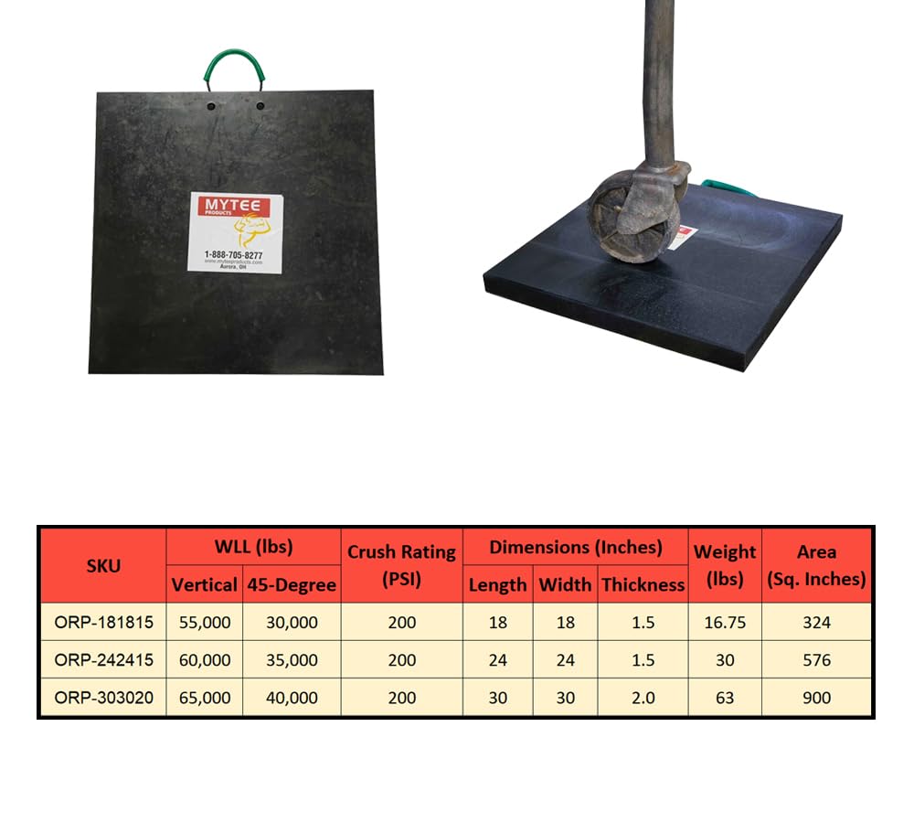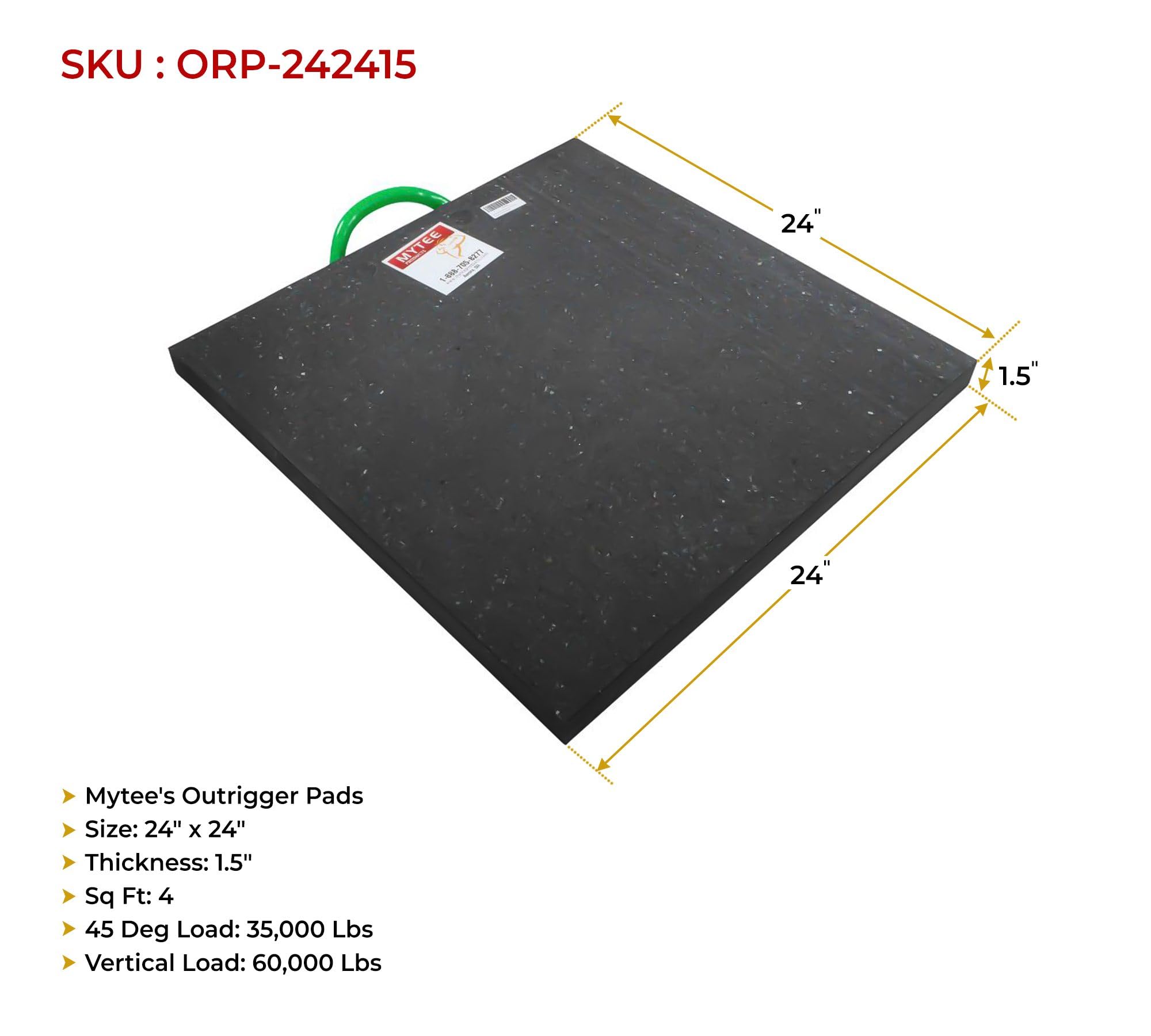 Pack Size: 4 Pack Mytee's Outrigger Pads Size: 24" x 24" Thickness: 1.5" Sq Ft: 4 Working Temperature: -30℃ to 60℃ 45 Deg Load: 35,000 Lbs Vertical Load: 60,000 Lbs Crushing Rating: 200 PSI Weight: 30 lbs Waterproof and Chemicals Resistant Non-Conductive 1-Person Carry Material: High-Density Polyethylene Many heavy machines require additional support on their base in order to ensure they don’t topple over, especially working on soft surfaces like grass or dirt. This additional support comes from outrigger pads. The weight can be distributed at an angle or directly on the pad and can withstand up to 60,000 lbs. These are essential for heavy objects such as cranes or hooks. The outrigger pads are extremely durable and provide high performance load distribution. The Mytee outrigger pads are made of High Density Polyethylene, which is superior to wood and rubber as it can handle a greater weight while remaining lightweight, weighing between 17-30 lbs. Every pad is also waterproof and chemical resistant so it’s reliable in any conditions.