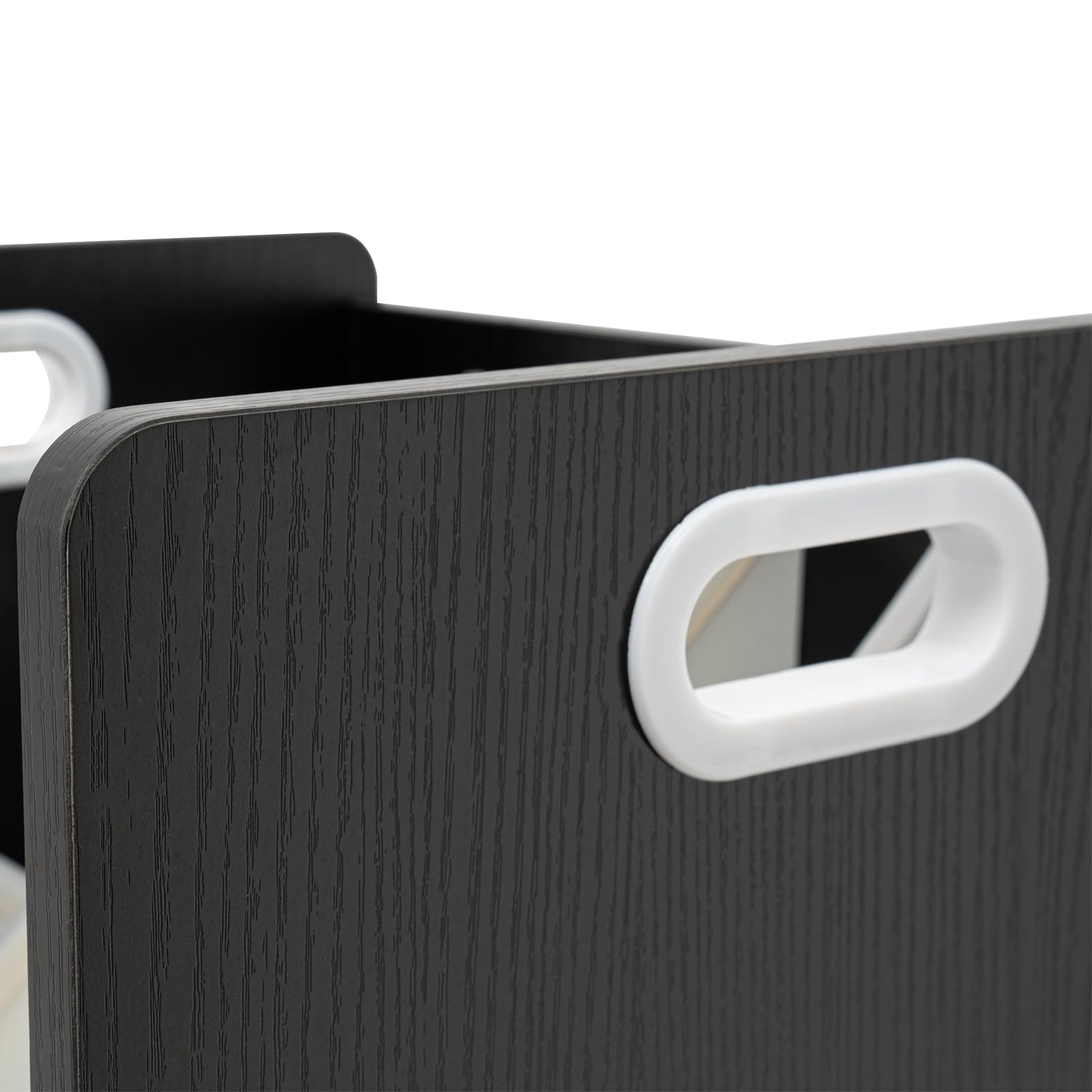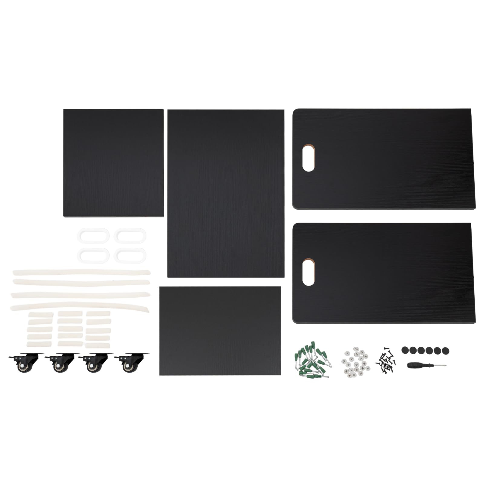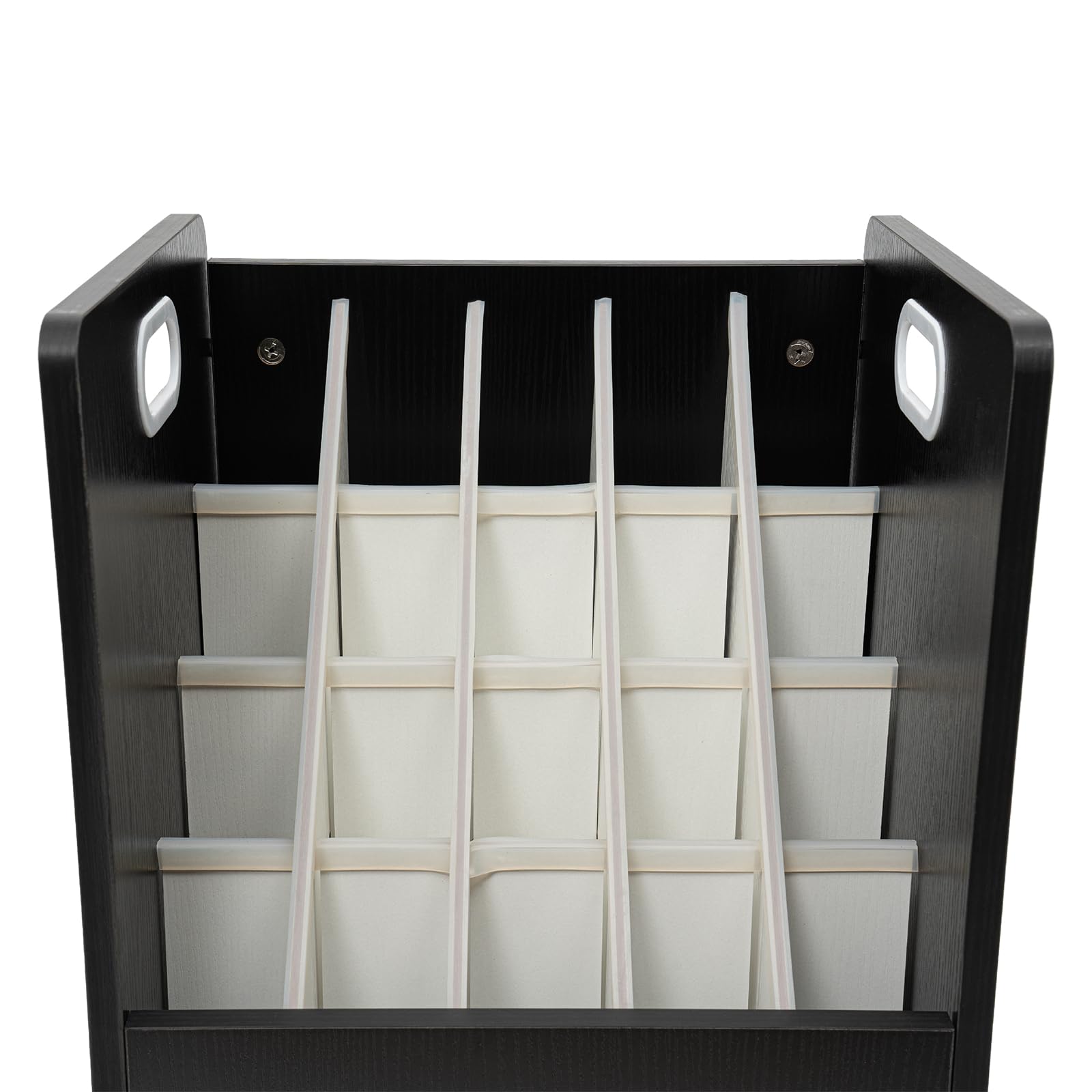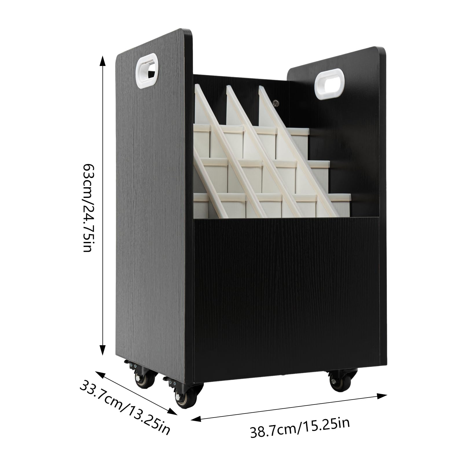 Details: Two Oval Handles: They are easy for you to move the cart around, and the oval-shaped handles fit better in your hand for enhanced comfort. Curved Four Corners: The four corners of the surface have a smoothed curved design, which can take better care of your safety while enhancing the beauty of this product. Raised Base: The raised base is conducive to moisture resistance and facilitates cleaning. Application: It is suitable for offices, living rooms, study rooms, meeting rooms, classrooms, cafes, libraries, and garages, among others. It can also be used to organize letters, documents, books, mail, files, information, cardstock, craft paper, construction paper, and printer paper. Specifications: Color: Black Style: Modern Shape: Rectangular Material: MDF, PV Mounting Type: Floor Mount Process: Heat, Steam and Adhesives Number of Compartments: 20 Assembly Required: Yes Load Capacity: 20kg/44.1lbs Gross Weight: 11.5kg/25.35lbs Net Weight: 11kg/24.25lbs Product Size : 38.7*33.7*63cm/15.25*13.25*24.75in Package Size: 66*9*46cm/25.98*3.54*18.11in Package Included: 1*20 Slots Cart with Wheels 1*English Manual Other Accessories for Assembly Notes: 1. Please read the instructions carefully and follow the steps for assembly. 2. Please keep the product in a cool and dry place and avoid direct sunlight.
