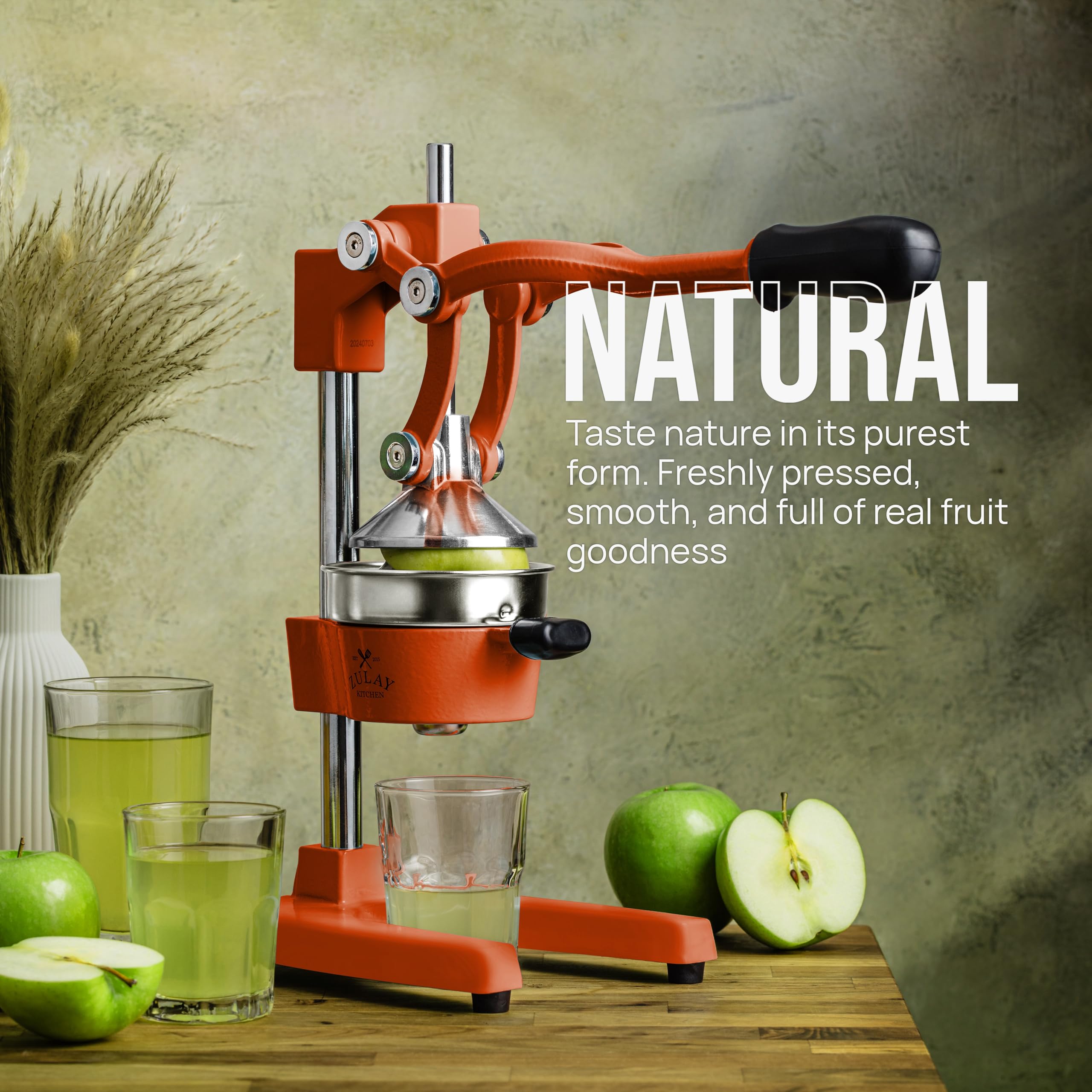 STURDY AND DURABLE MATERIAL: This manual juicer is made of heavy-duty cast iron that can easily withstand the pressure from continuous pressing for years to come. The leverage mechanism allows a one-time easy pull to get all the juice out. Our citrus press is designed with a heavy rubberized base to firmly keep it in place without the fear of falling, tipping, or sliding off the counter. This hand juicer is great for both professional and at-home use.
