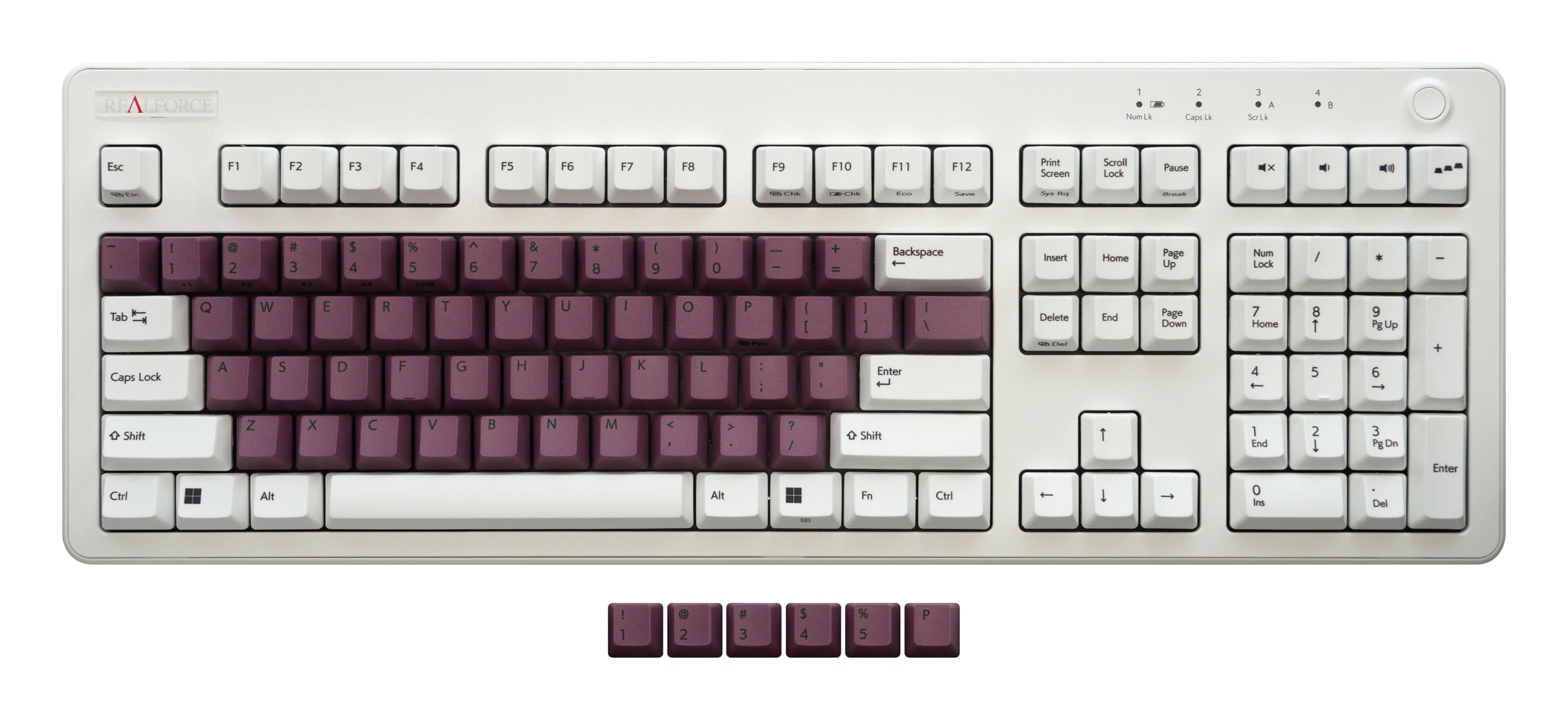 Designed and manufactured by Realforce to fit the Realforce R3 and R3Skeyboard. This keycap set is available in several colors in three different kits: alpha, modifier, and numpad. The Alpha kit includes 53 keys: letter keys, symbol keys, and number keys. The Modifier kit includes 51 keys: modifier keys, F-row keys, and navigational keys. The Numpad kit includes 21 keys: numpad keys and 4 specialty keys.