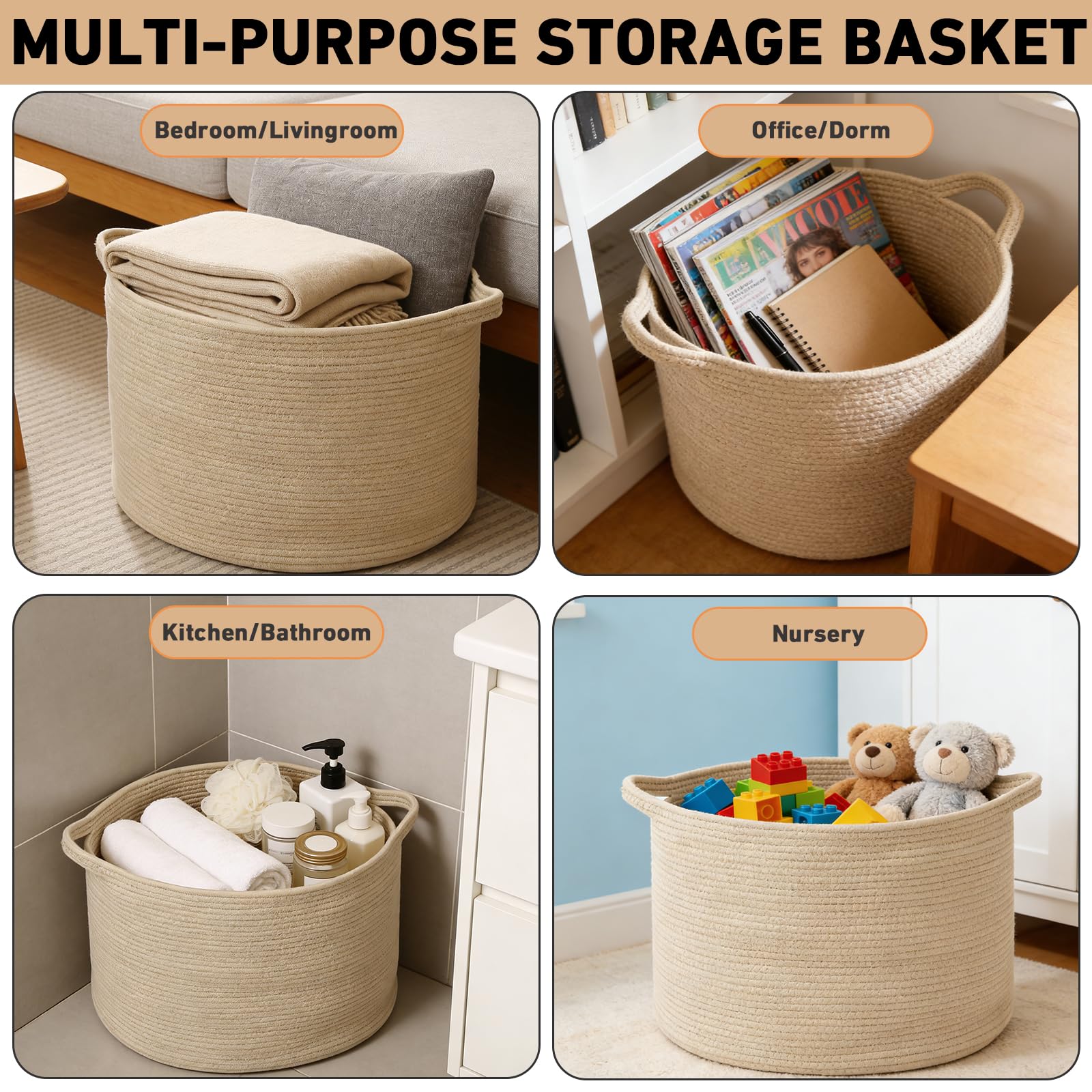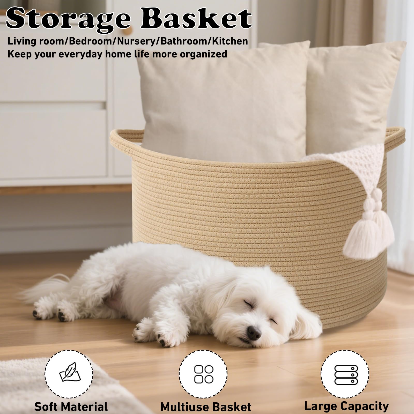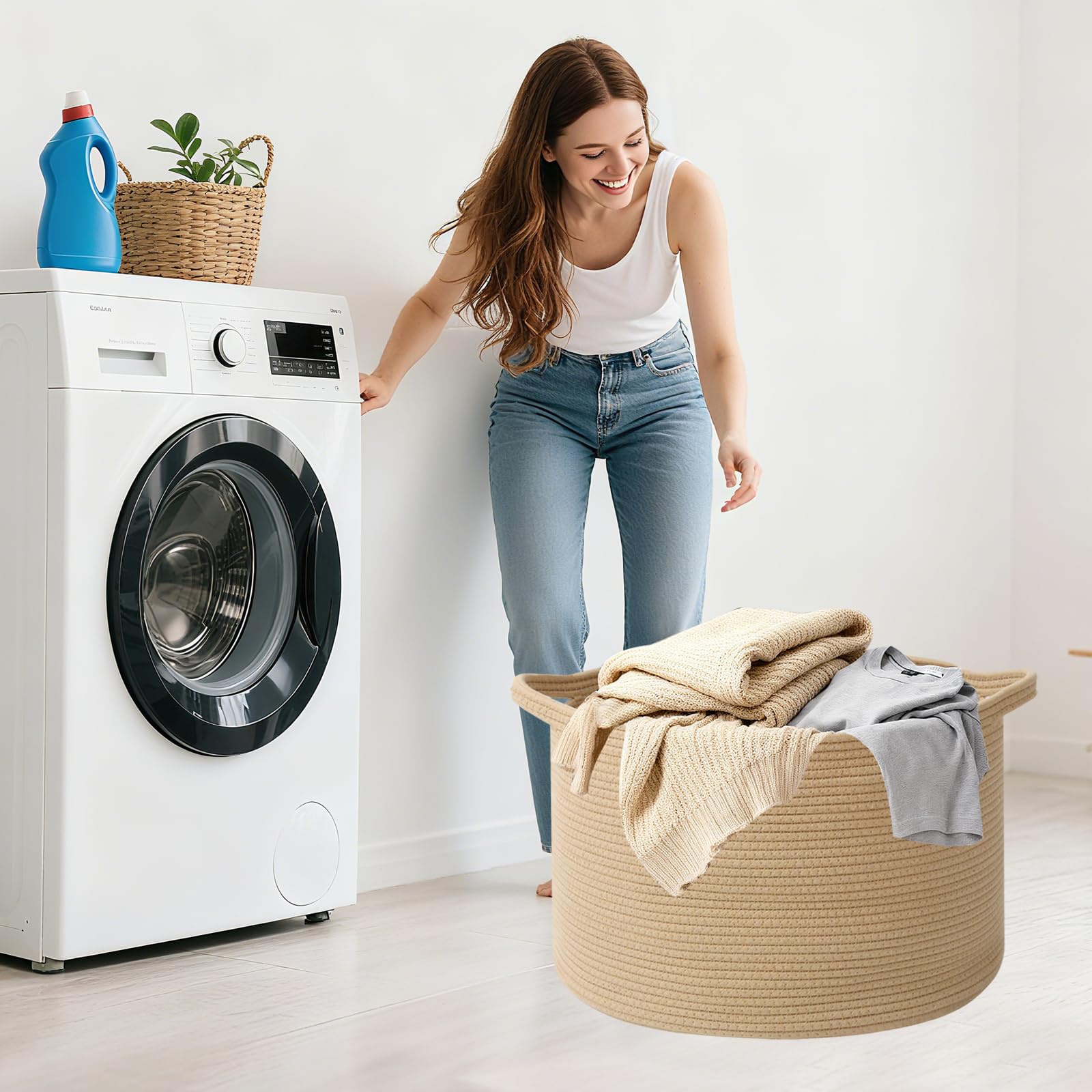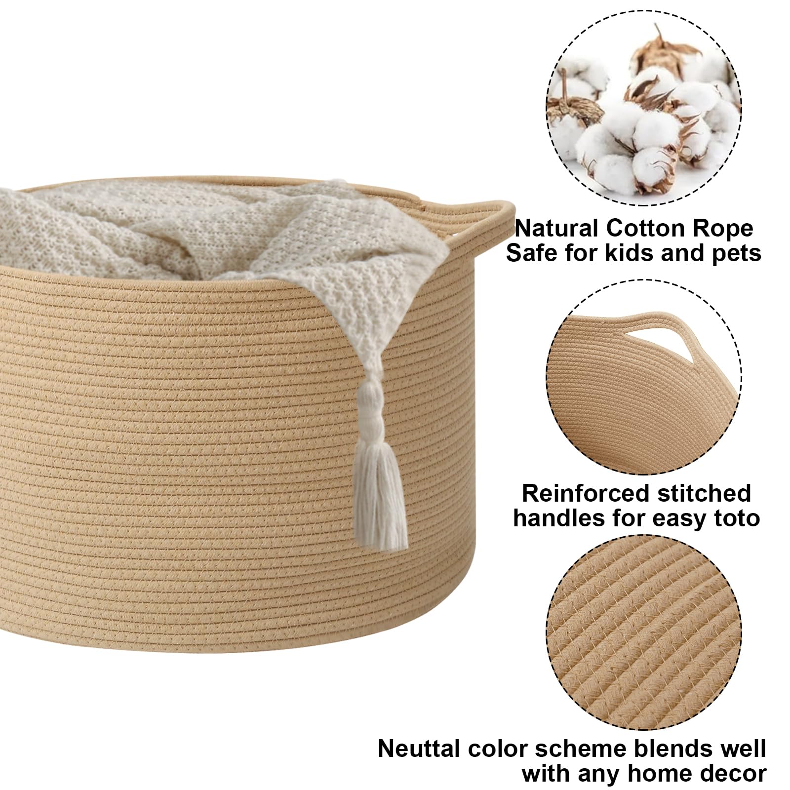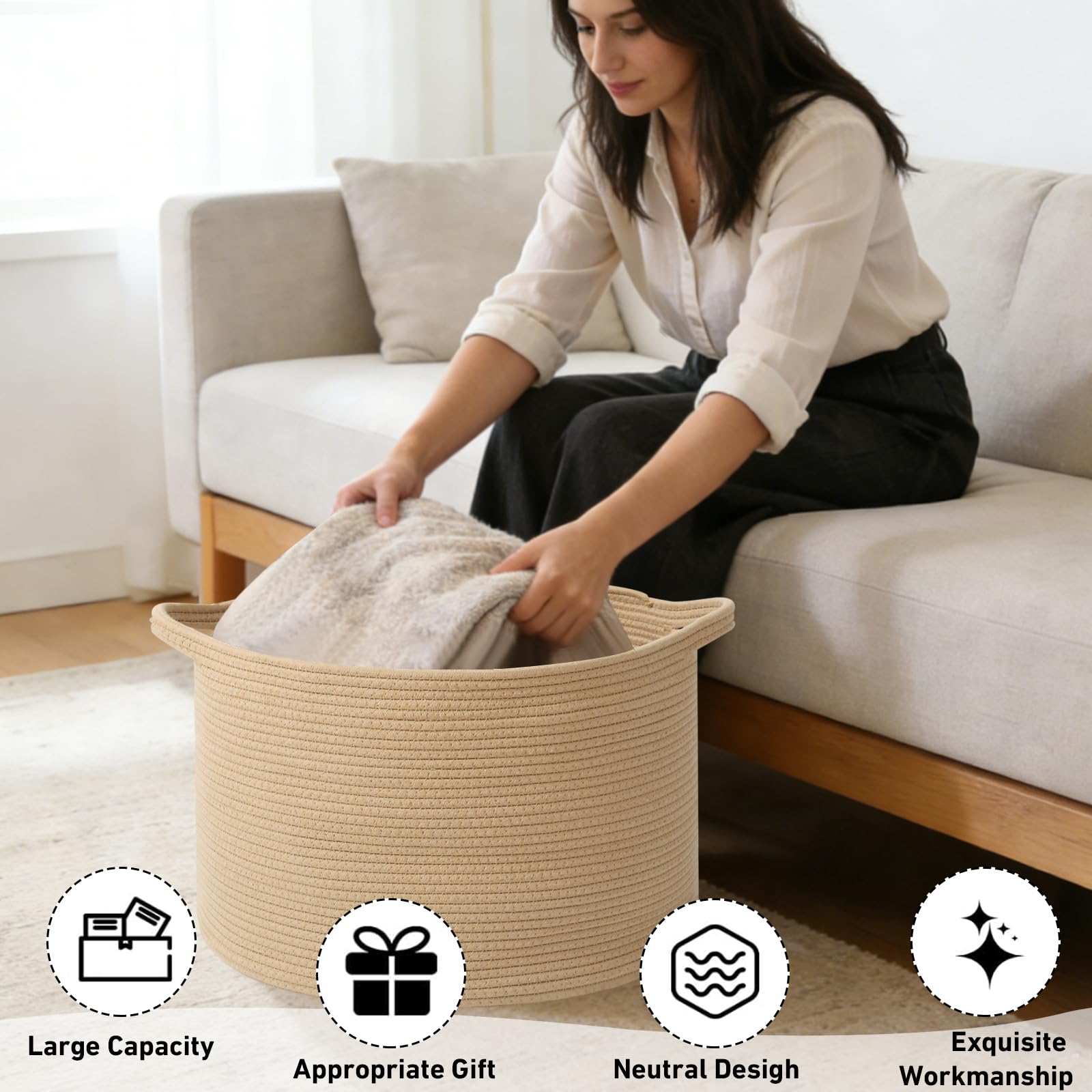 【High-Quality Craftsmanship Design】Made with soft, durable cotton rope. Slow-woven for even texture and long-lasting durability. The two built-in handles are sturdy.Strong handles for easy carrying or move