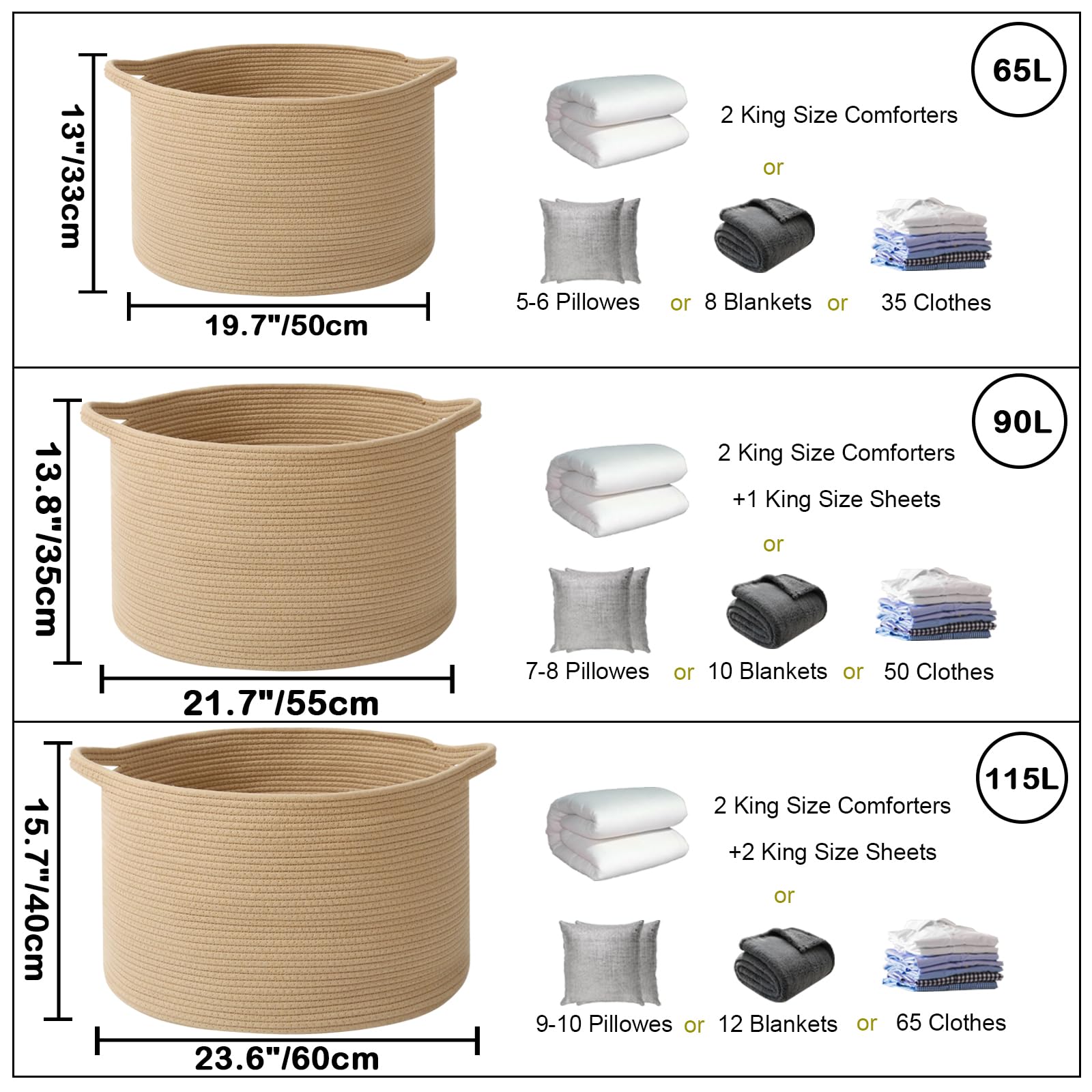 【90L Extra Large Capacity】This 21.7"L x 21.7"W x 13.8"H basket is perfect for storing throw blankets, pillow, cushions, clothes,towels,toys and stuffed animals.It can also add a nice style to your living room, bedroom, laundry room, nursery or any room