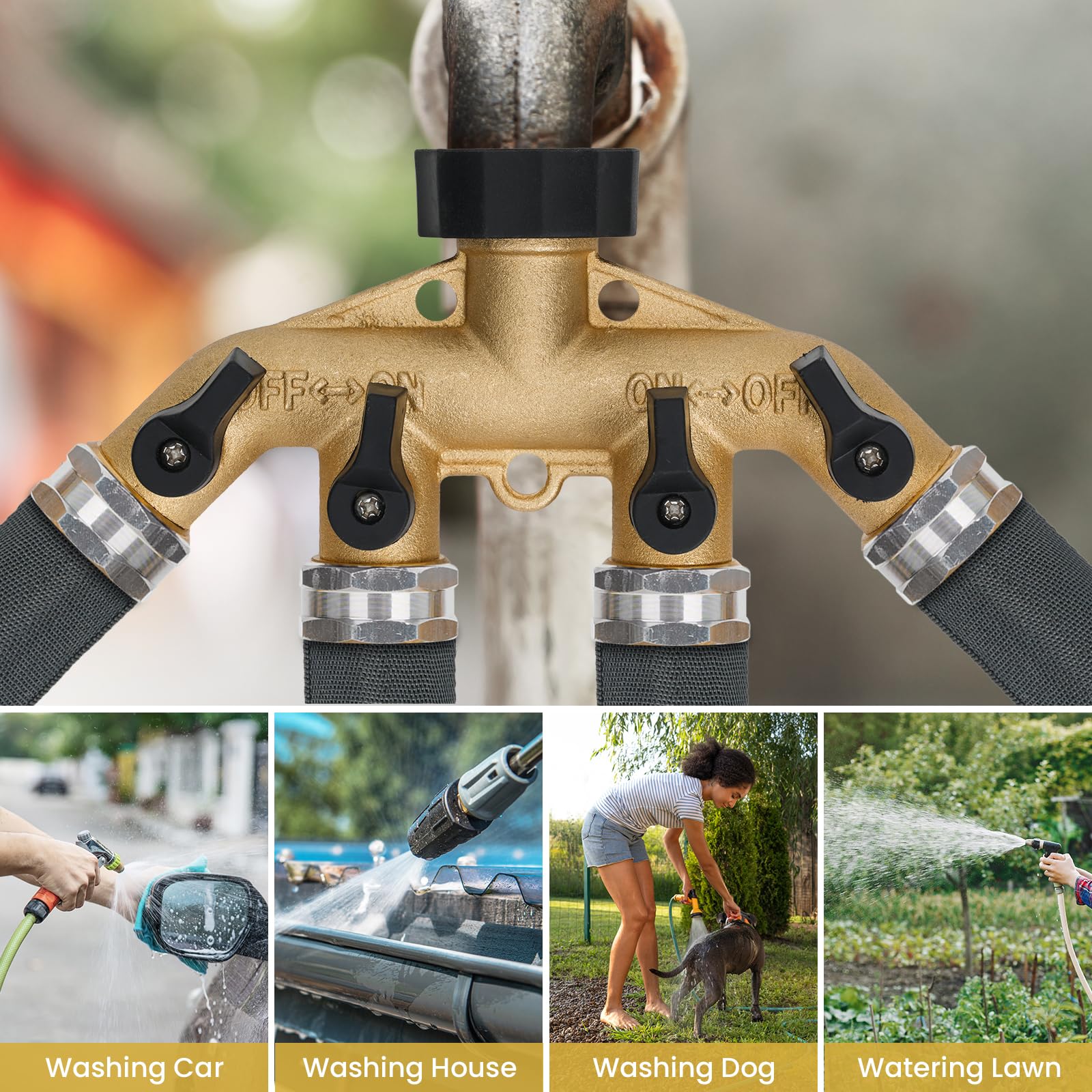 4 WAY HOSE SPLITTER WITH INDEPENDENT VALVES:This 4 way hose splitter heavy duty design has 4 separate valves for each outlet, letting you control water flow for your garden hose splitter and saving water efficiently