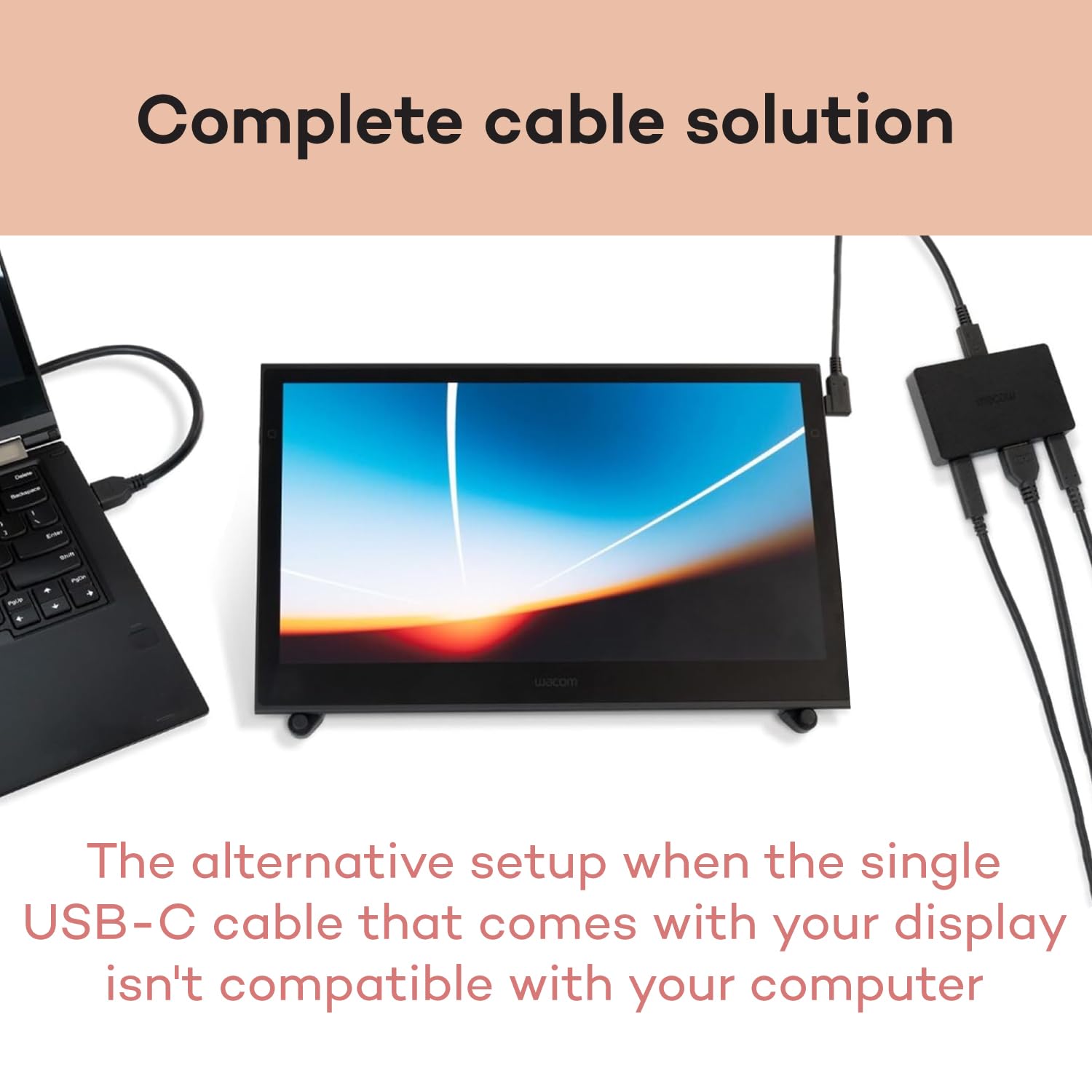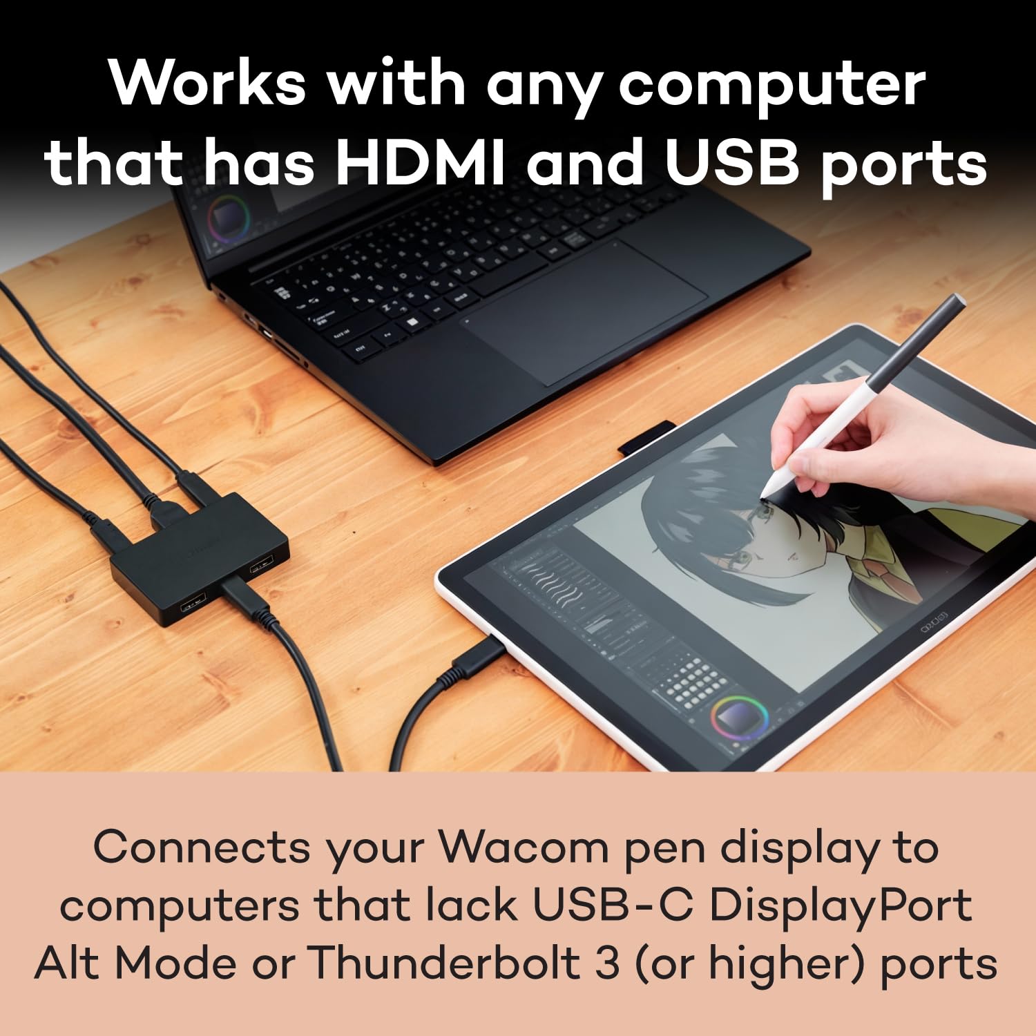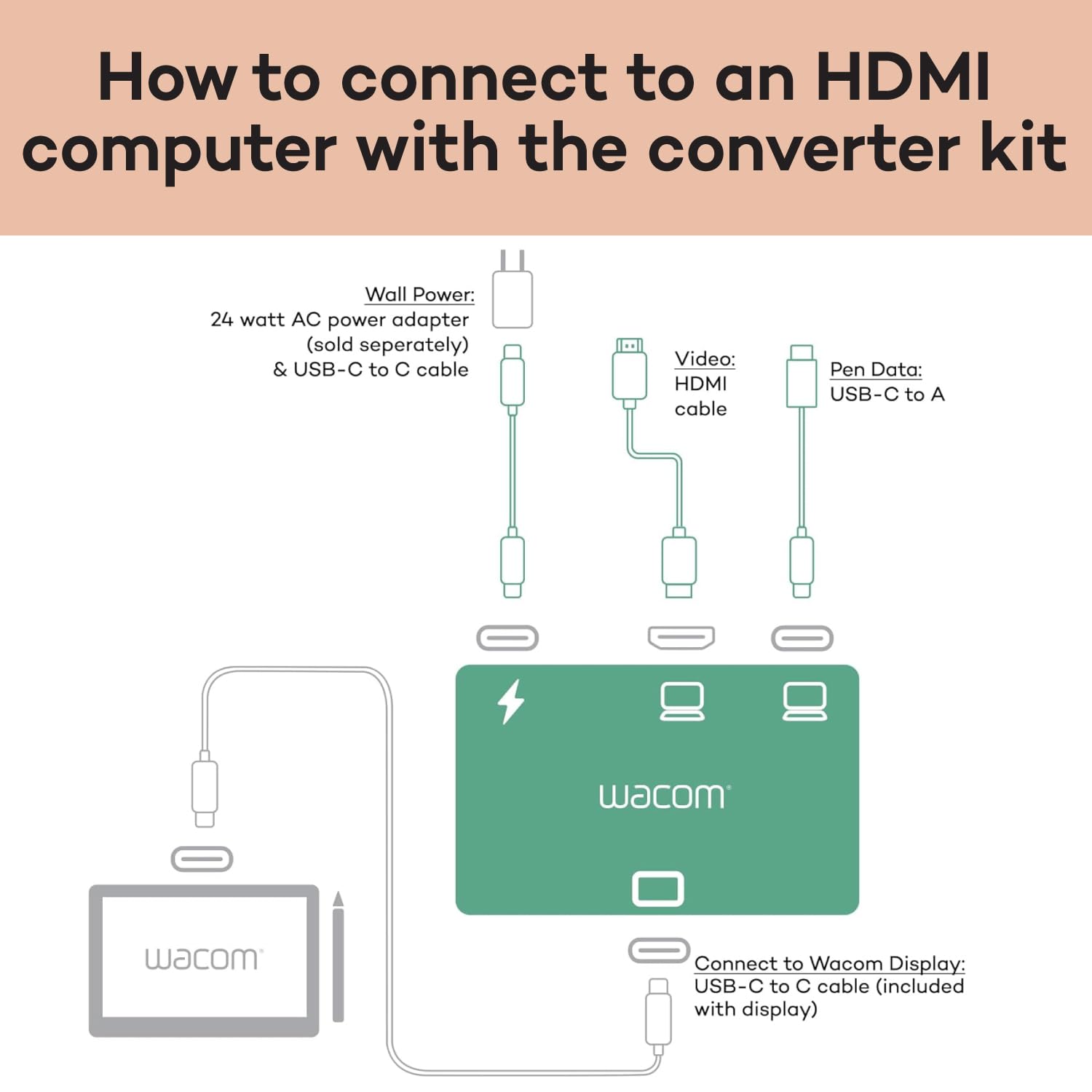 The Wacom Converter Kit connects your Wacom pen display to computers that lack USB-C DisplayPort Alt Mode or Thunderbolt 3 (or higher) ports. When the single USB-C cable included with your display isn't compatible, this kit offers the solution. The Wacom Converter combines HDMI video, USB pen data, and power into a single USB-C connection to your display. Kit includes: Wacom Converter, HDMI cable, USB-C to USB-A cable, and USB-C to USB-C cable.