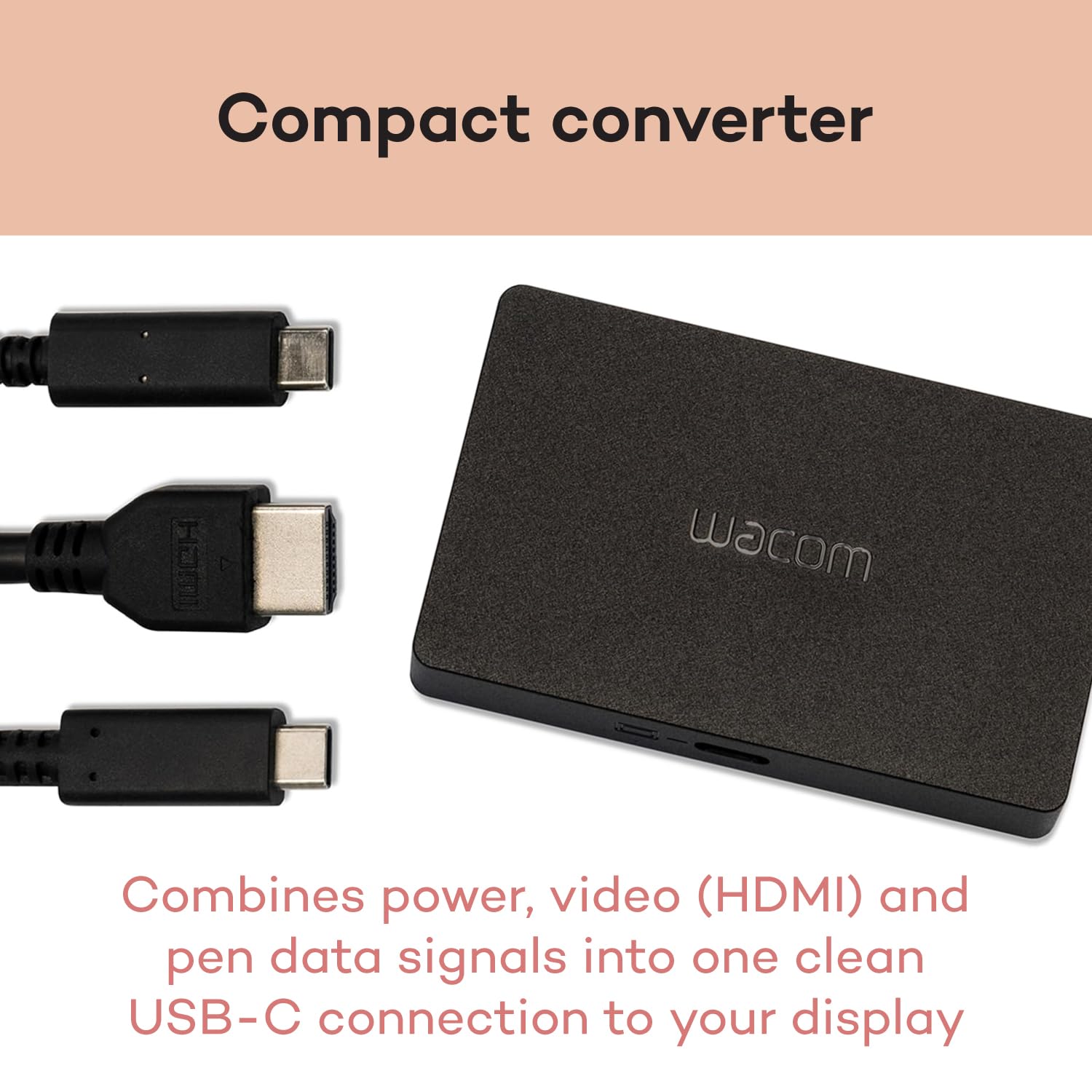 Compact Wacom Converter hub combines power, video (HDMI), and pen data signals into one clean USB-C connection to your display