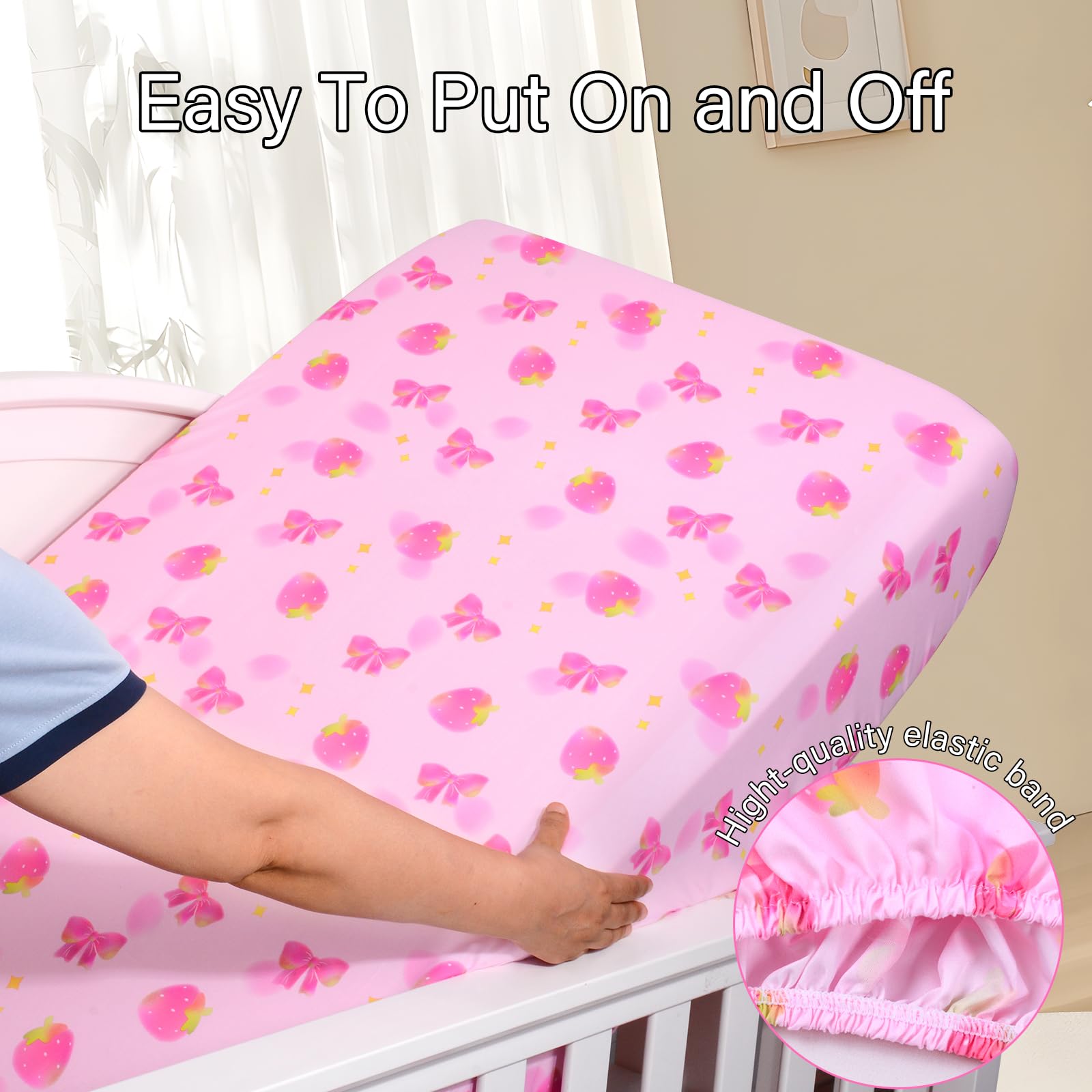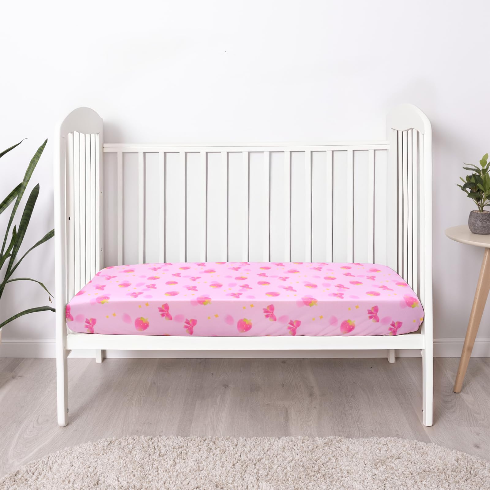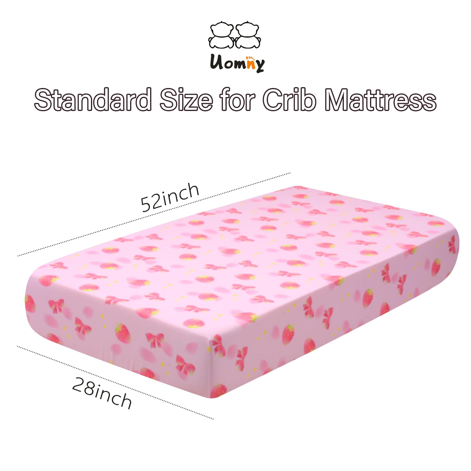 【CRIB SHEET WRAP IN 360 DEGREE】:Dimension 28" x 52" for standard crib and toddler mattresses.The Strawberry bow sheet will wrap your baby mattress in 360 degree,which can make it solid non-slip more break and be suitable for all kinds of baby sleeping positions Fits all standard Crib Mattresses and Toddler Bed Mattresses.