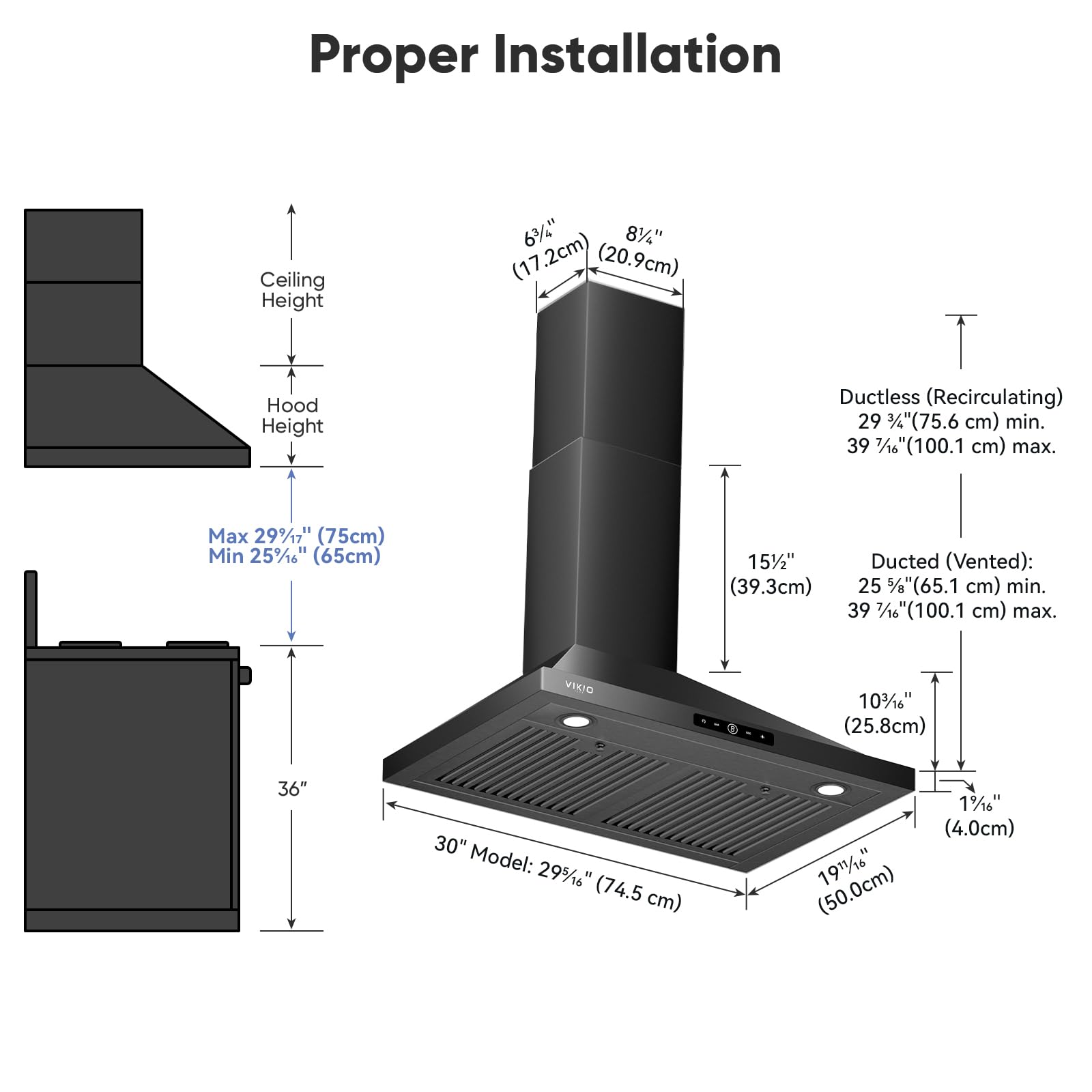 【Premium Stove Vent Hood】Crafted from 430-grade brushed stainless steel, the sleek pyramidal design of the wall mount range hood 30-inch complements most kitchen decors. Optional carbon filter kits are available for ductless installations, offering flexibility for any kitchen setup.