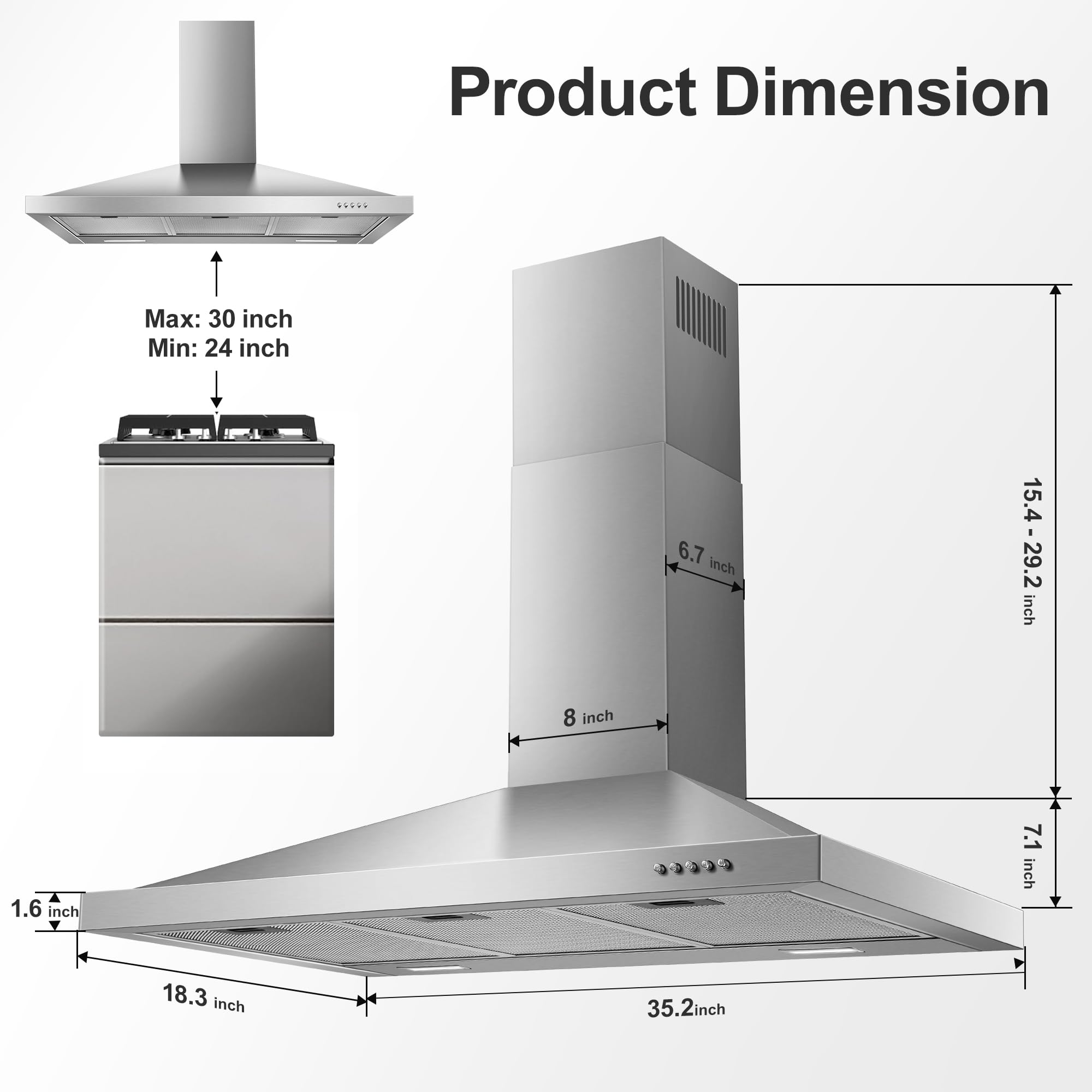 【Suitable for Low & High Ceilings】Features 30 inch size perfect to cover entire range’s cooktop. The stove hood dimensions 35.2" W x 18.3" L x 37.9" H with adjustable chimney fit 7.5-8.5 ft ceiling. Ideally sized to fit your cabinets and save space in your kitchenExtend up to 10ft ceiling with extension, need to sold separately (Part #USGDEX-01)
