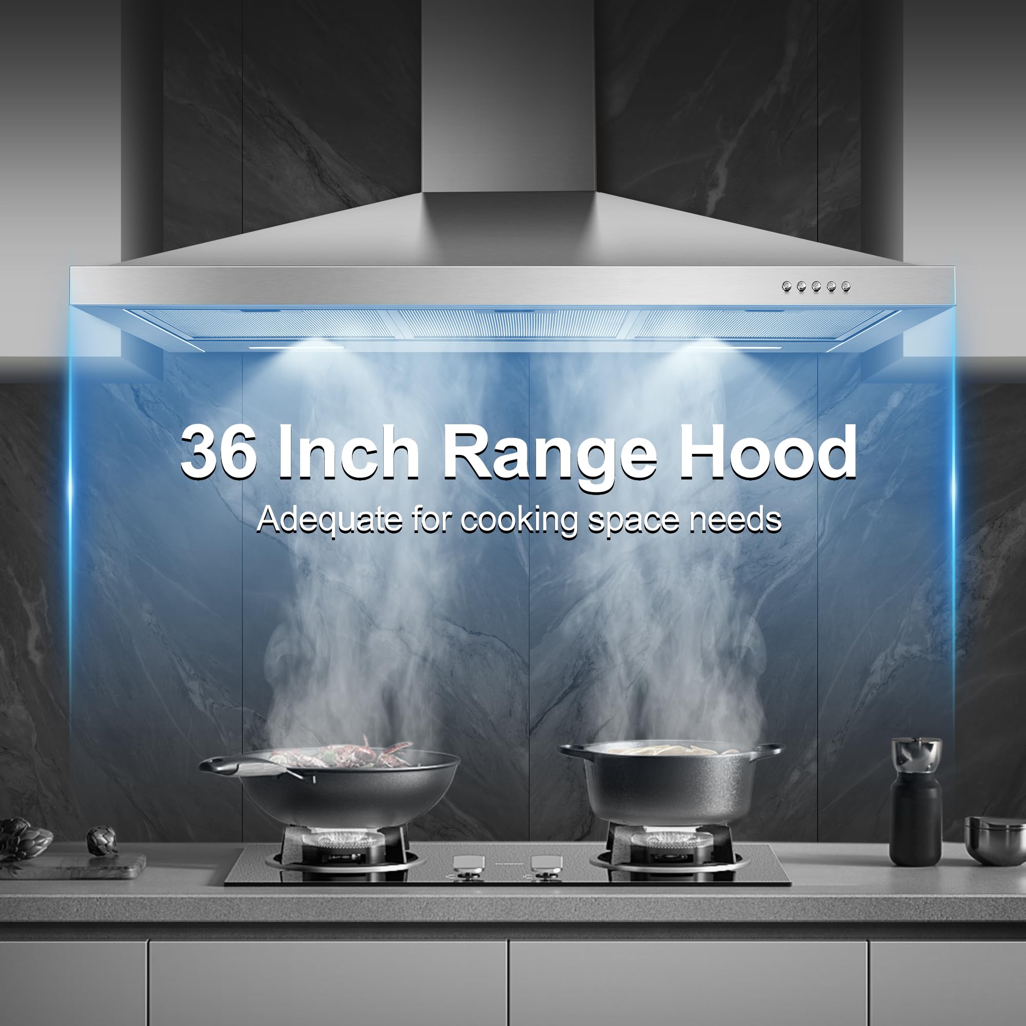 【5-Layer Reusable Aluminum Filters】The 5-layer aluminum filters of stove vent hood effectively trap grease and cooking odors, provides a clean and comfortable environment in your kitchen. Detachable mesh filters also easy to clean and install, keep the range hood effective and durable
