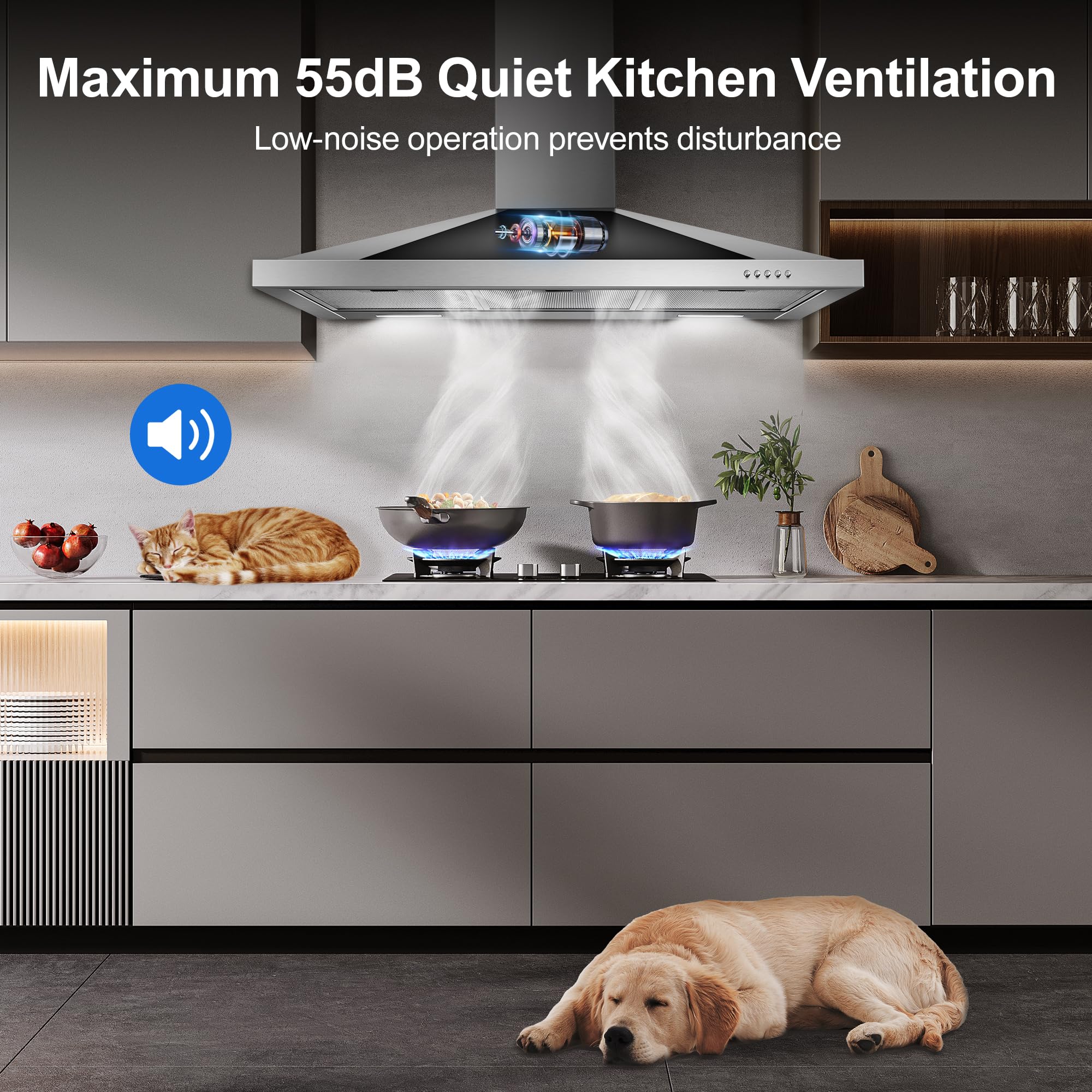 【450CFM Efficient Airflow】30 inch range hood with 450 CFM strong suction power and 3 –speed exhaust fan, effectively removes odors, smoke, and grease. Quiet 55 dB of range hoods provide you with a comfortable cooking environment