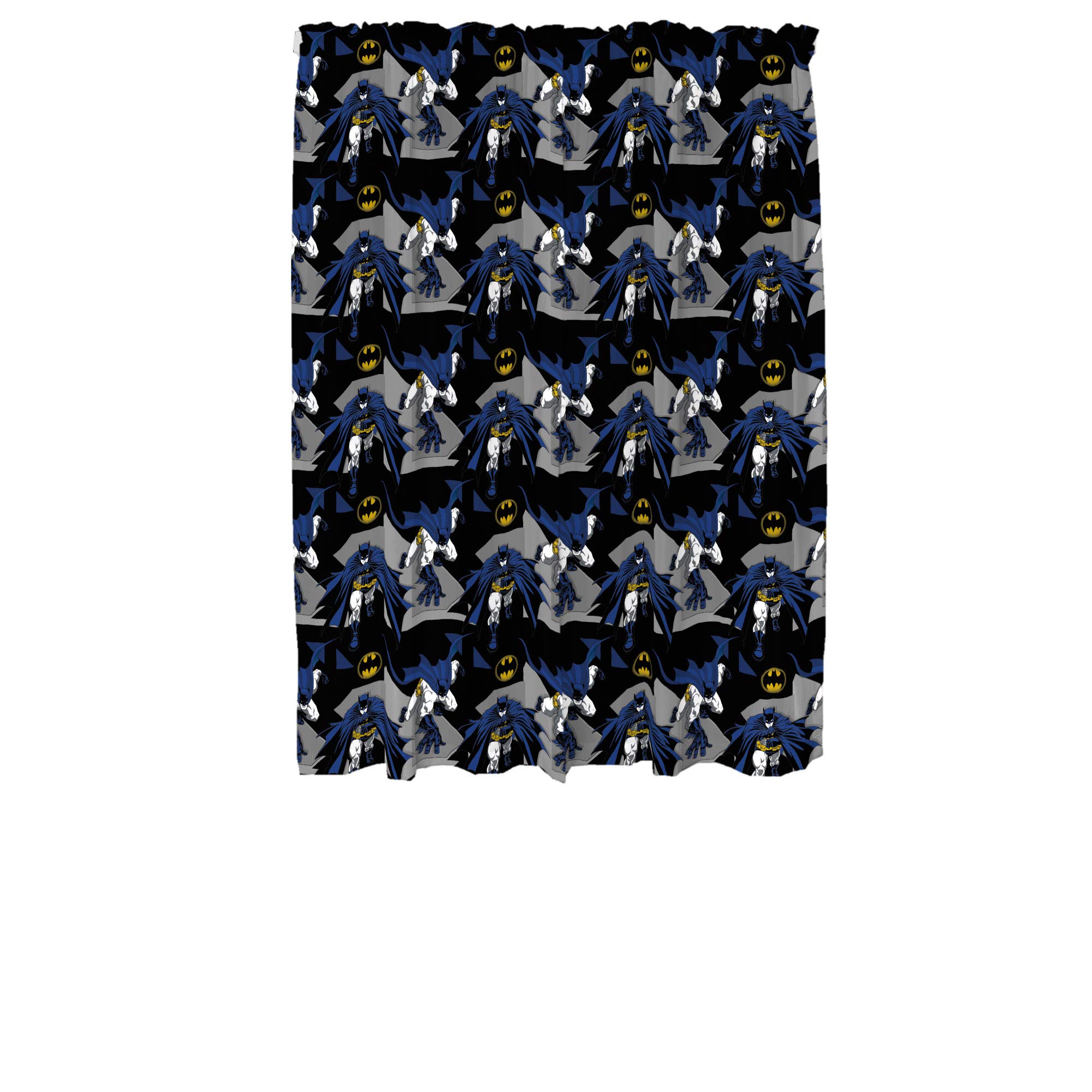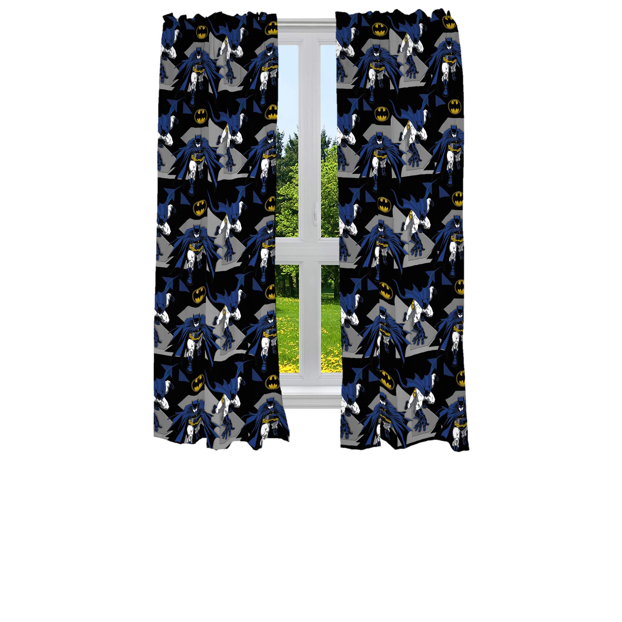 Bring the excitement of the Warner Bros. Batman series off of the screen and onto a window near you with these high-quality kidsβ drapes. The bold "Gotham Blues" pattern is a dynamic addition to any future superheroβs bedroom, nursery or playroom. These stylish microfiber window curtains have the playful look and soft feel that kids love. The action-packed design features Batman leaping into action on a black and grey background. Use these drapes to create a cohesive look in a Batman-themed room while also adding some privacy from the outside world. The drapery panels donβt block out sunlight completely, but rather filter it gently for a soft and comfortable look. Warner Bros. and DC Comics continue to inspire new generations of fans with exciting characters and imaginative storylines. Ensure your little superheroes have all the backup they need by adding these fun and fashionable kidsβ curtains to their dΓ©cor. Set is available in 63 inch length drapes or 84 inch length drapes.