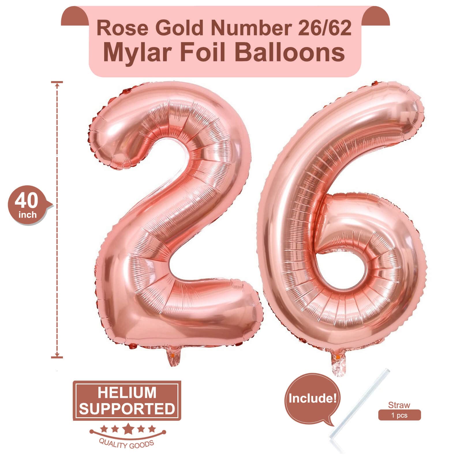 Package Included:40 inch Rose Gold numbers 2 and 6 (uninflated) + 1 Straw,Rose Gold 26 or 62 number foil digital balloons are the best for 26th or 62th birthday party,wedding celebration, anniversary, ceremories celebration, business or big events party.