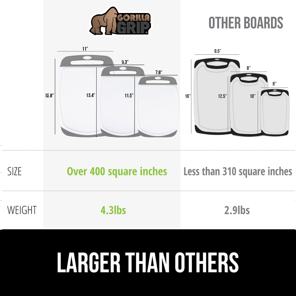 EXTRA LARGE SIZE: cutting board set includes 3 generously sized cutting boards, largest 16 x 11.2 in, medium 13.8 x 9.6 in, small 11.8 x 8 in, each .37 in thick, combined 4.25 lbs, larger and tougher than many wooden cutting boards for kitchen